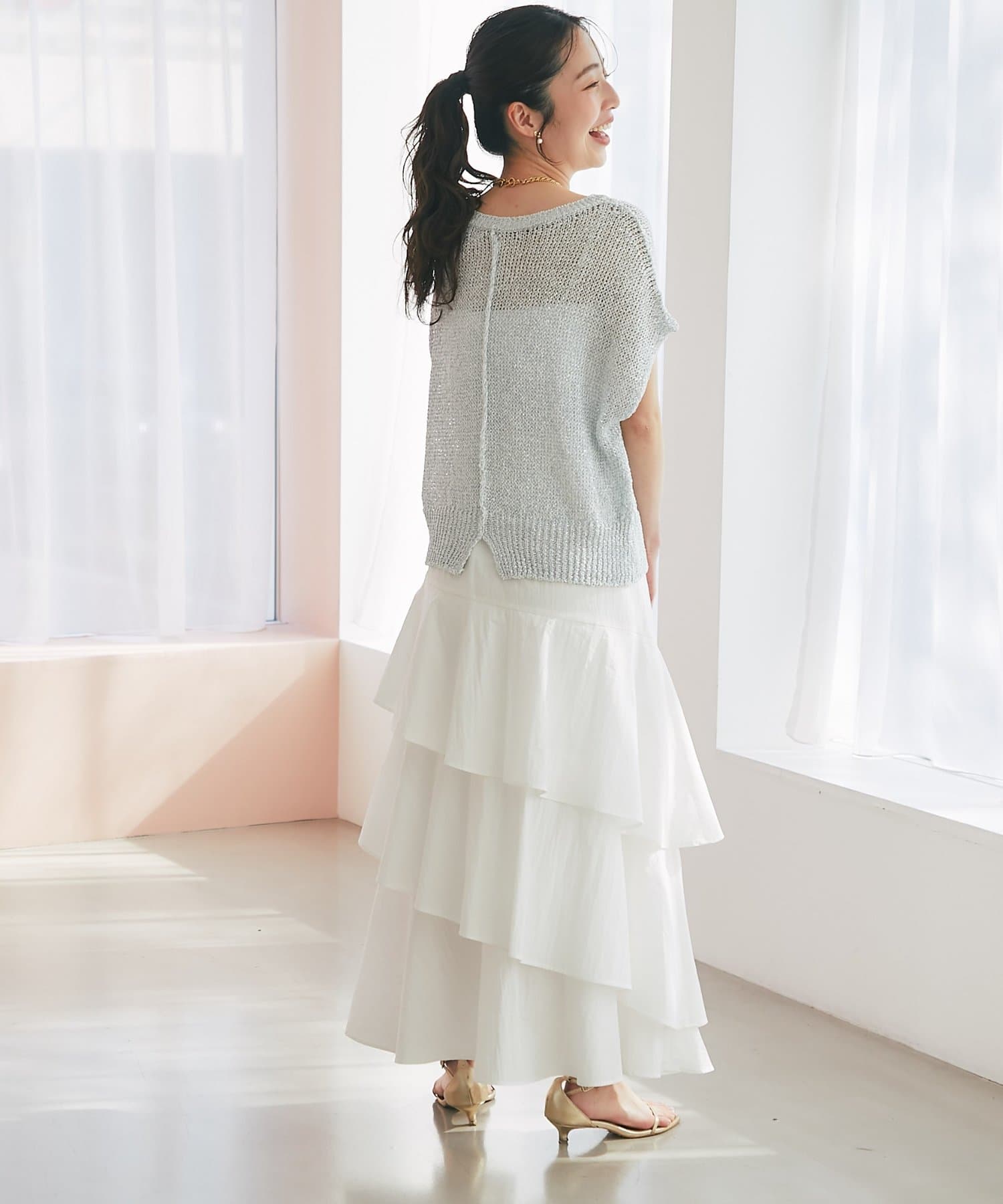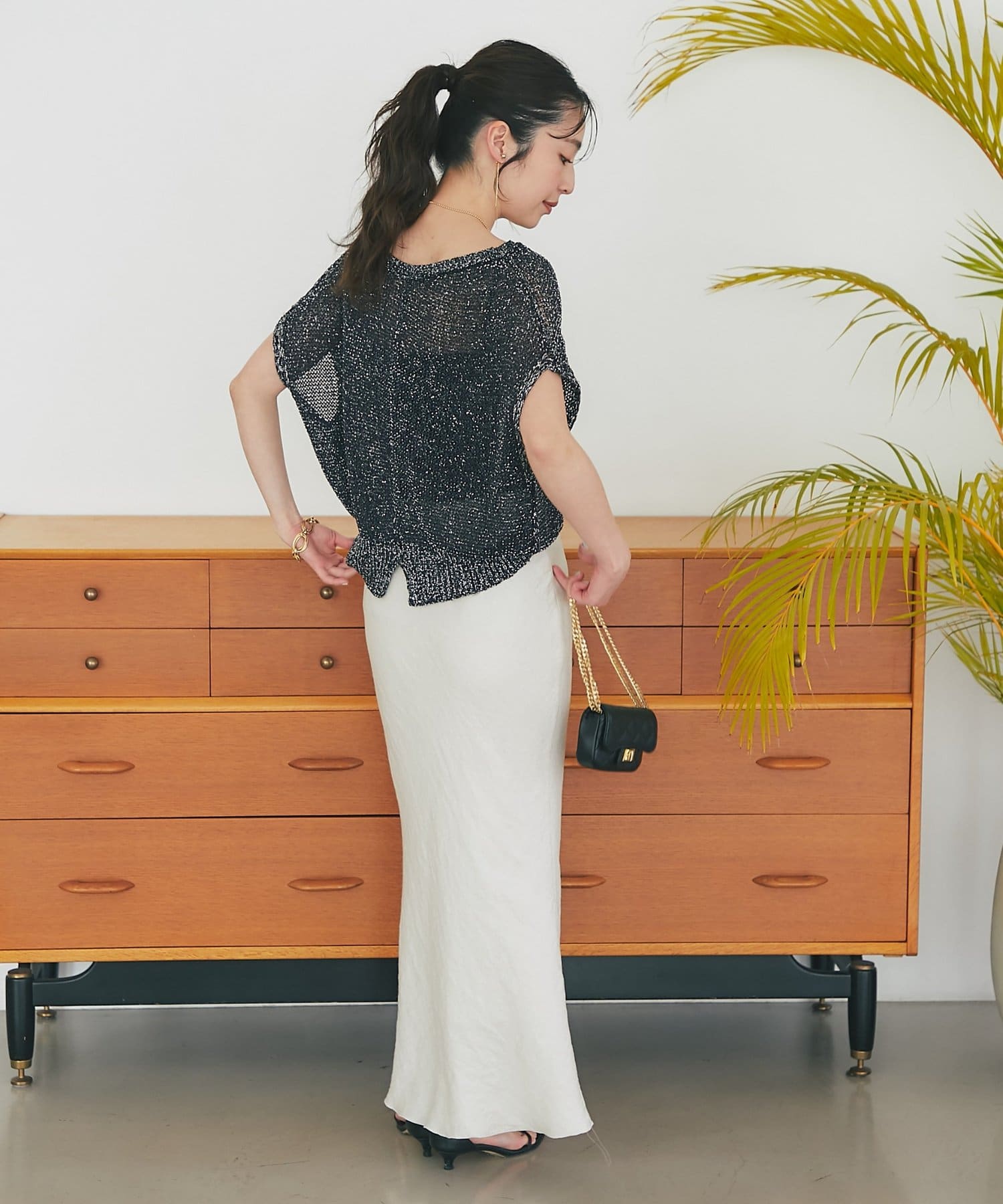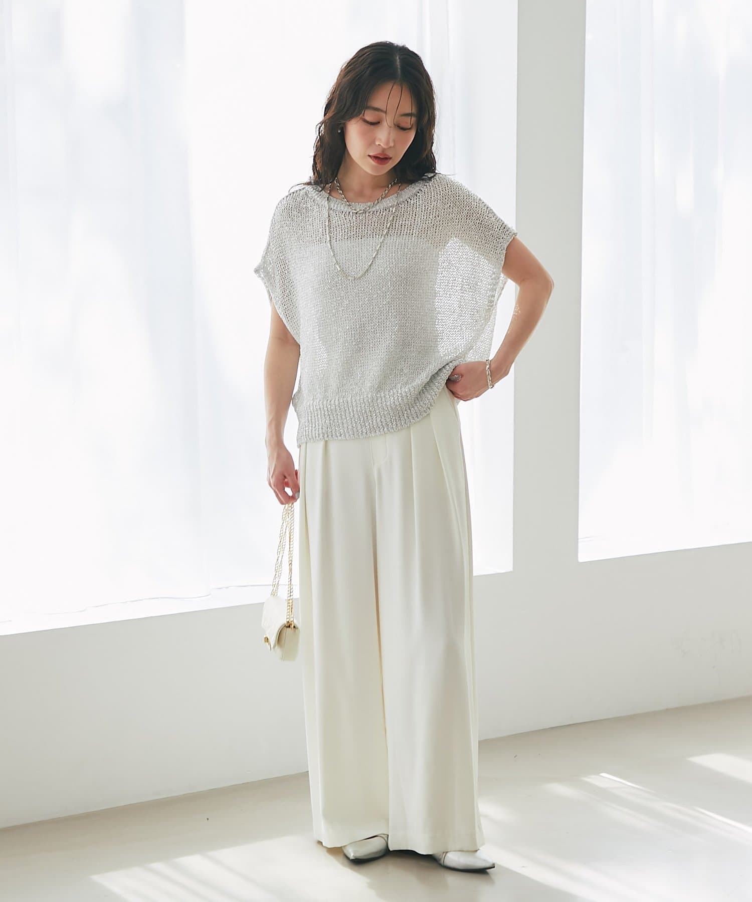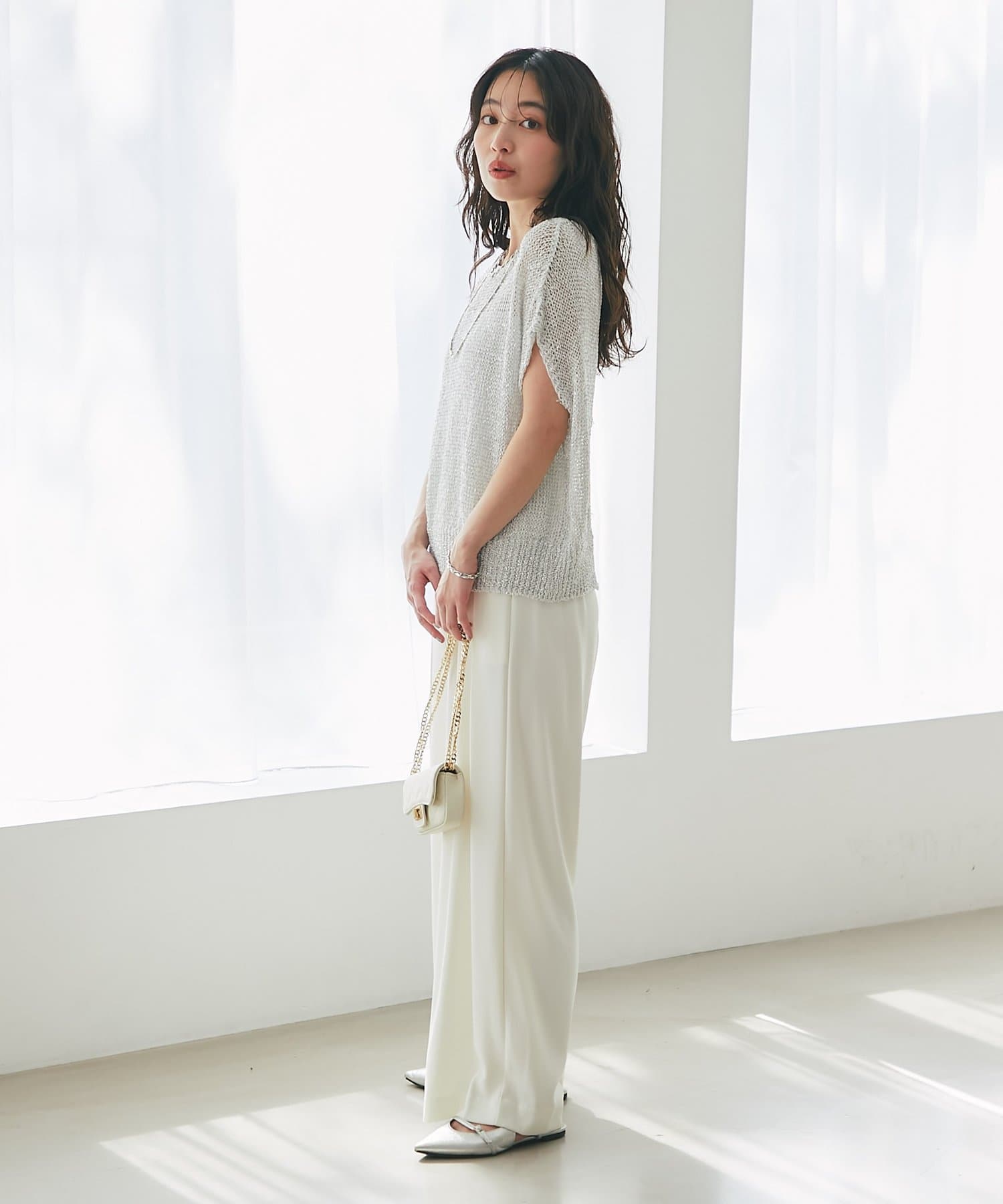 ざっくりとした透け感のある編地に、きらきらラメをプラスした存在感のあるニット。