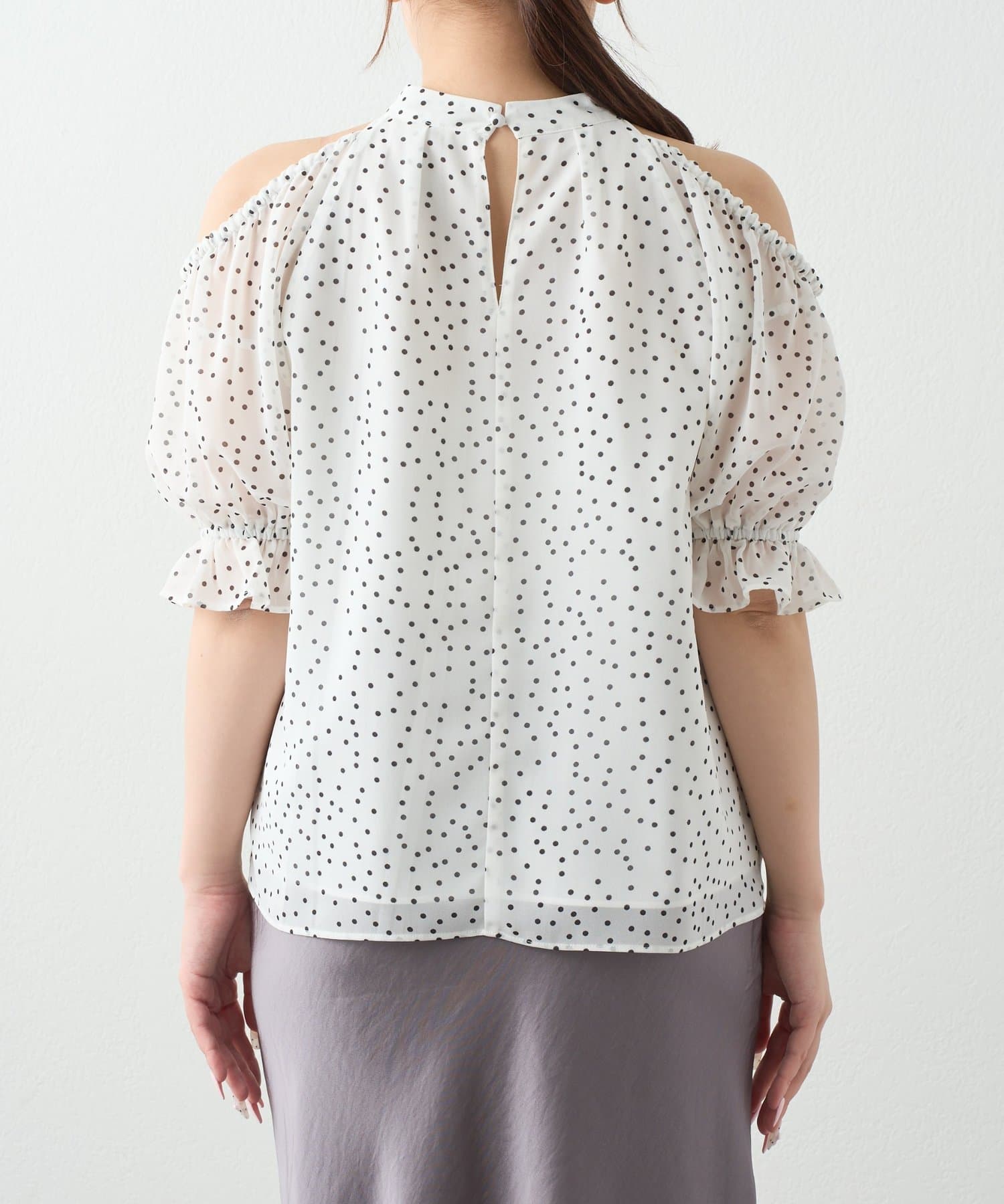 クラシカルなドット柄に、トレンドの肌見せデザインを落とし込み、甘すぎない大人の可愛らしさを演出します。