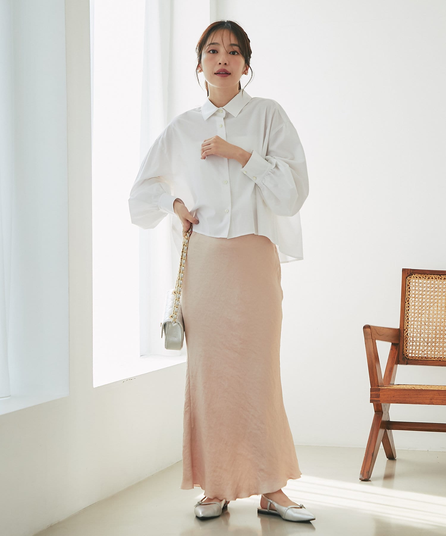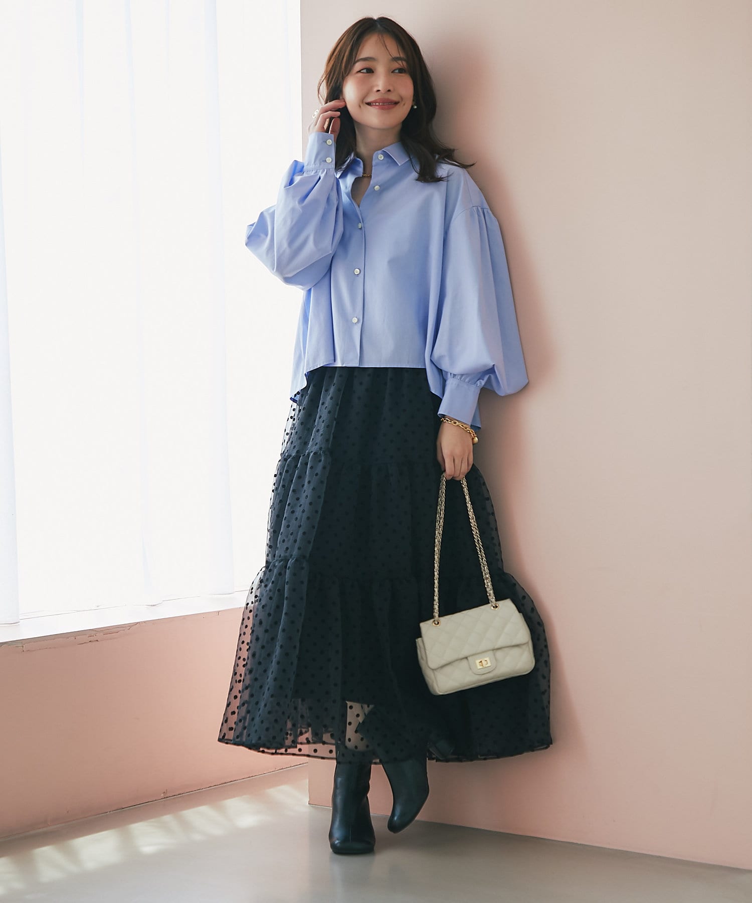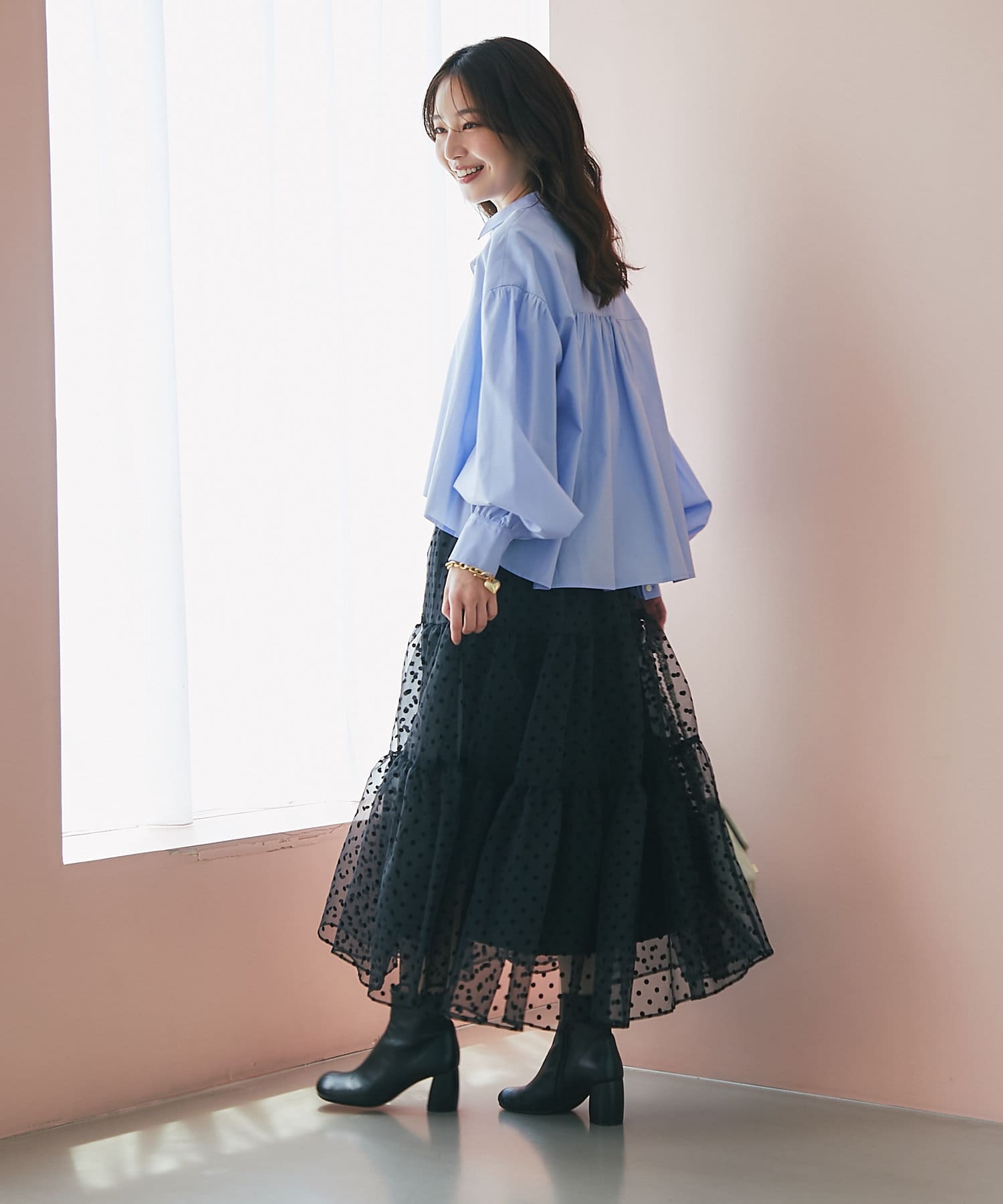 ふんわりとしたスカート合わせでフェミニンな印象もおすすめです。