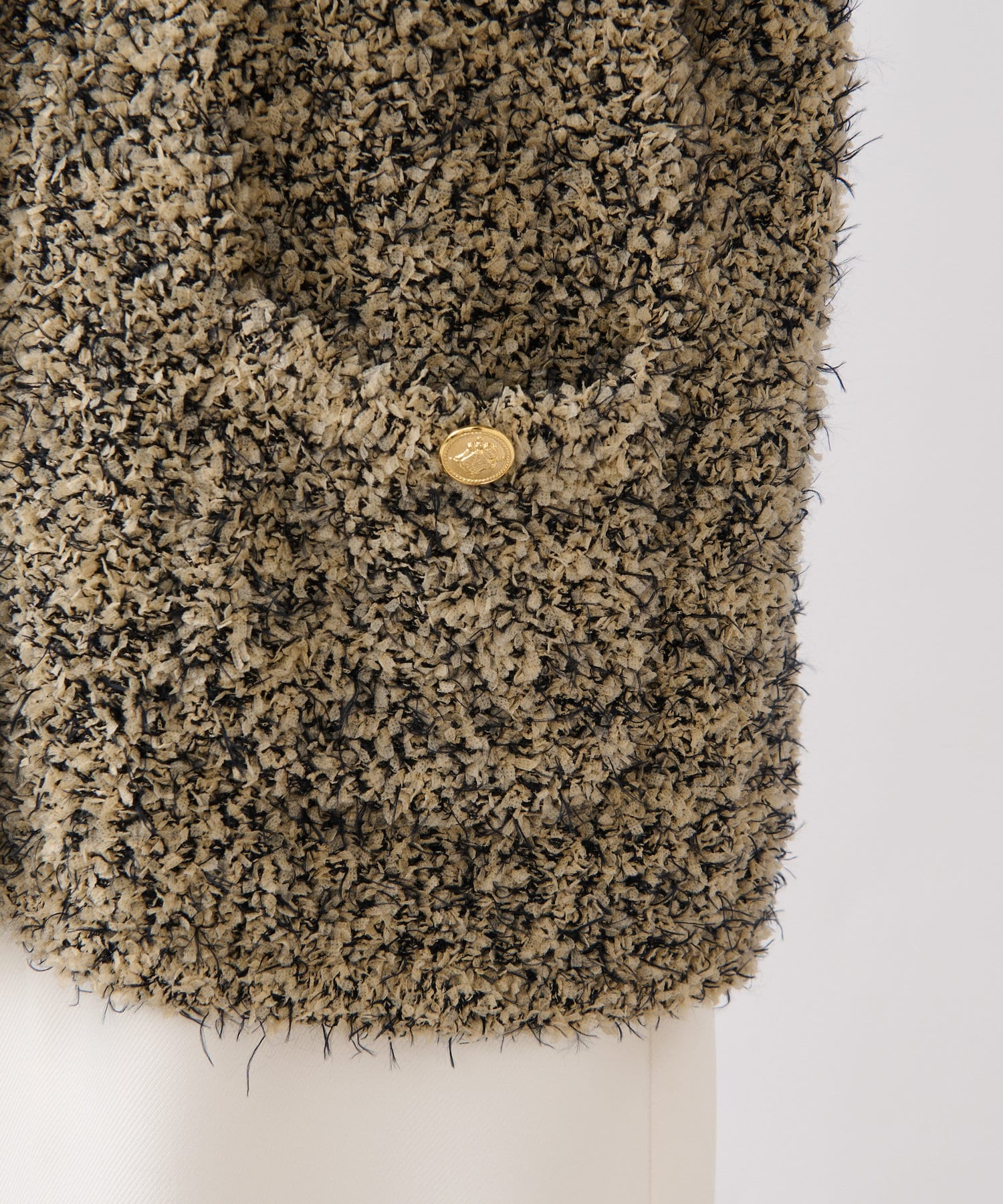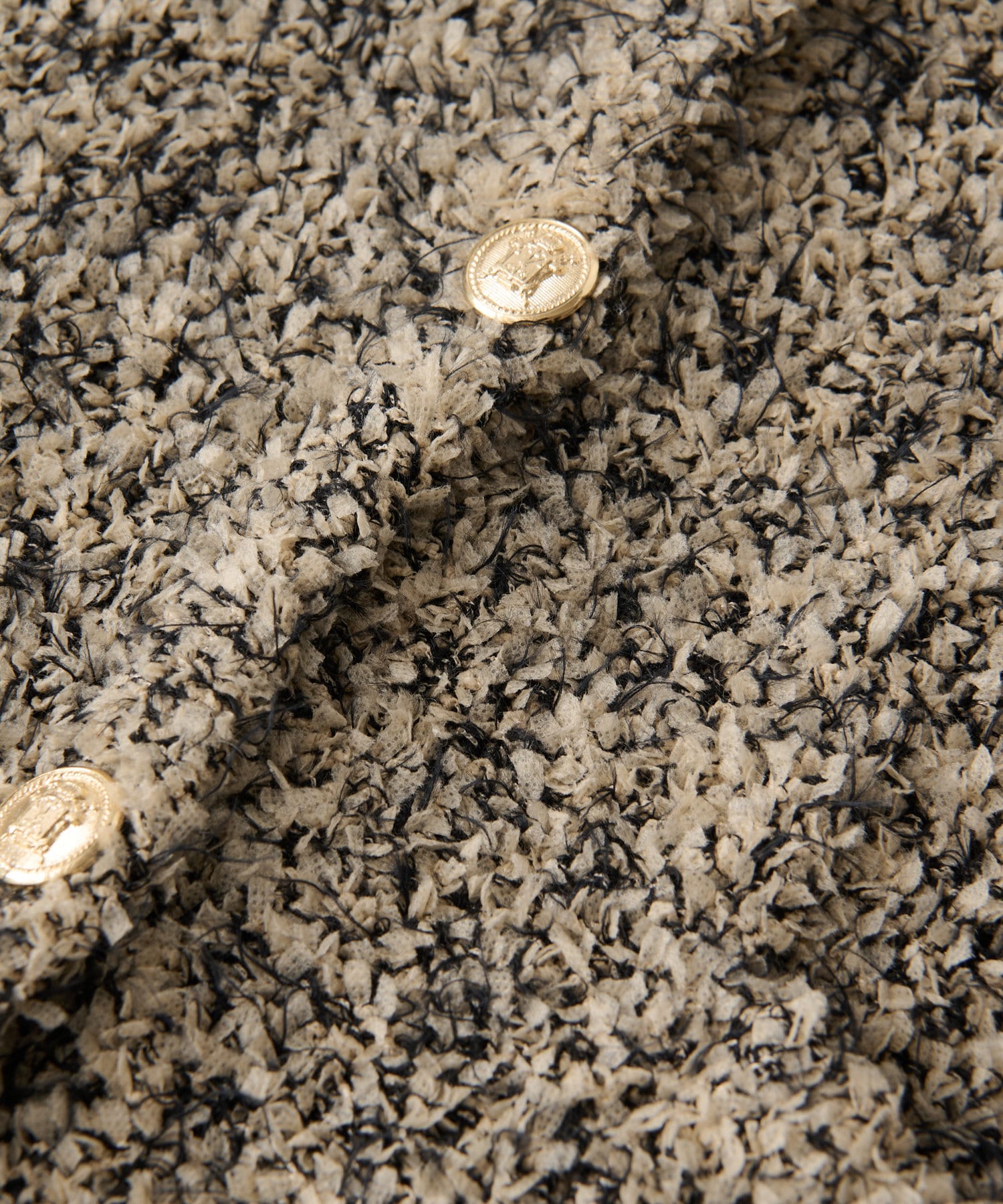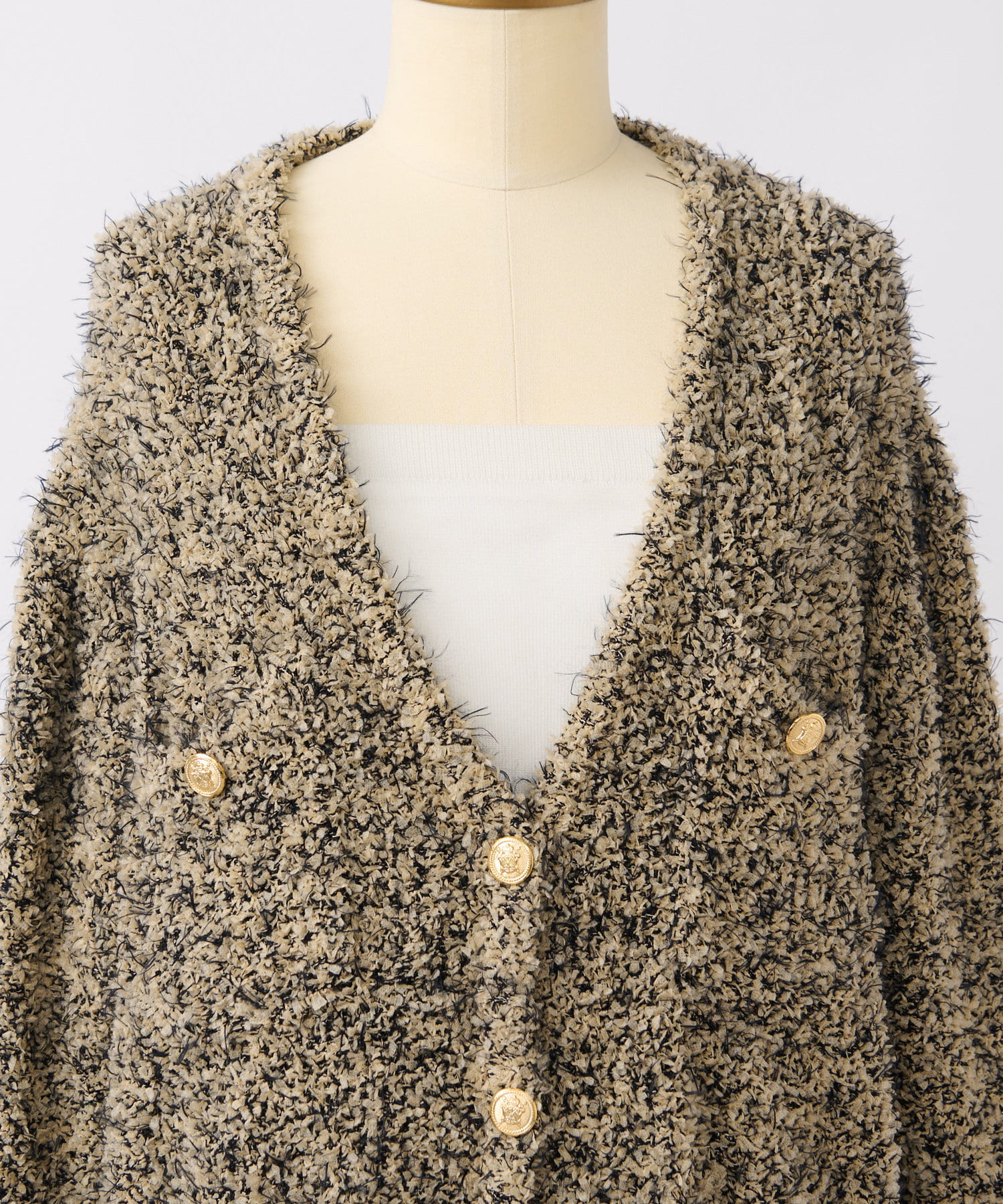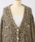 フリンジとメタル釦が存在感を放つ、ツイードニットカーディガン。