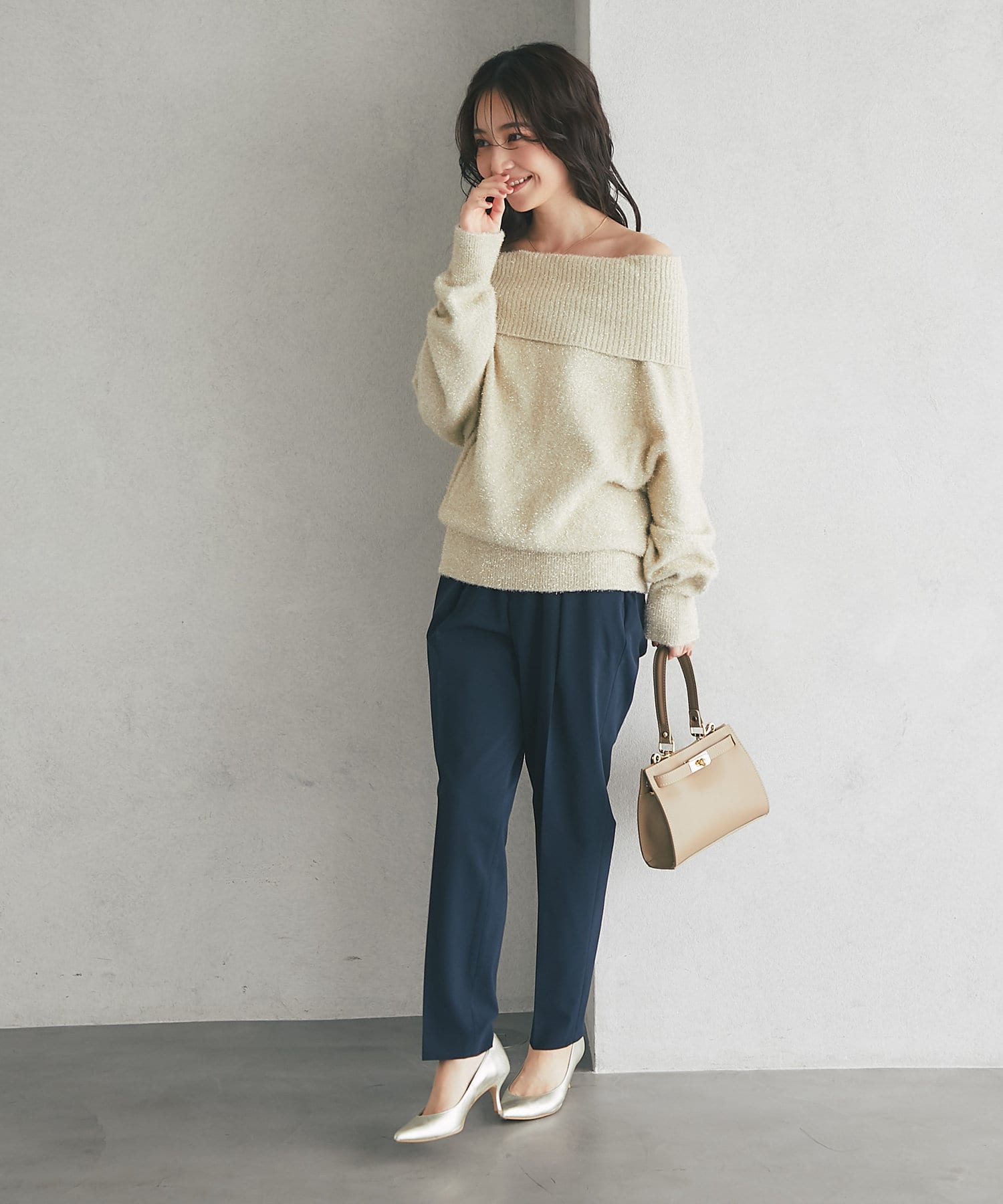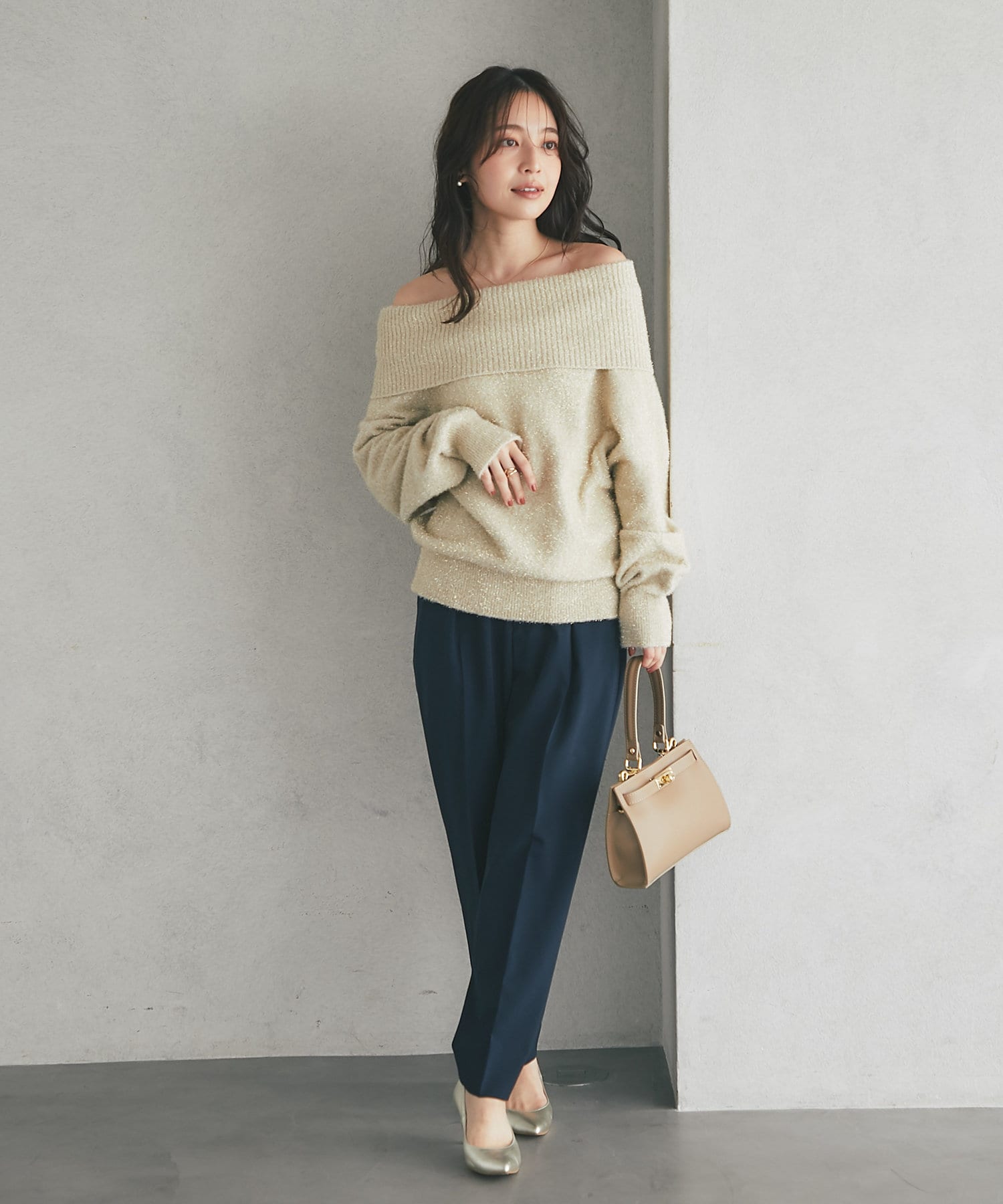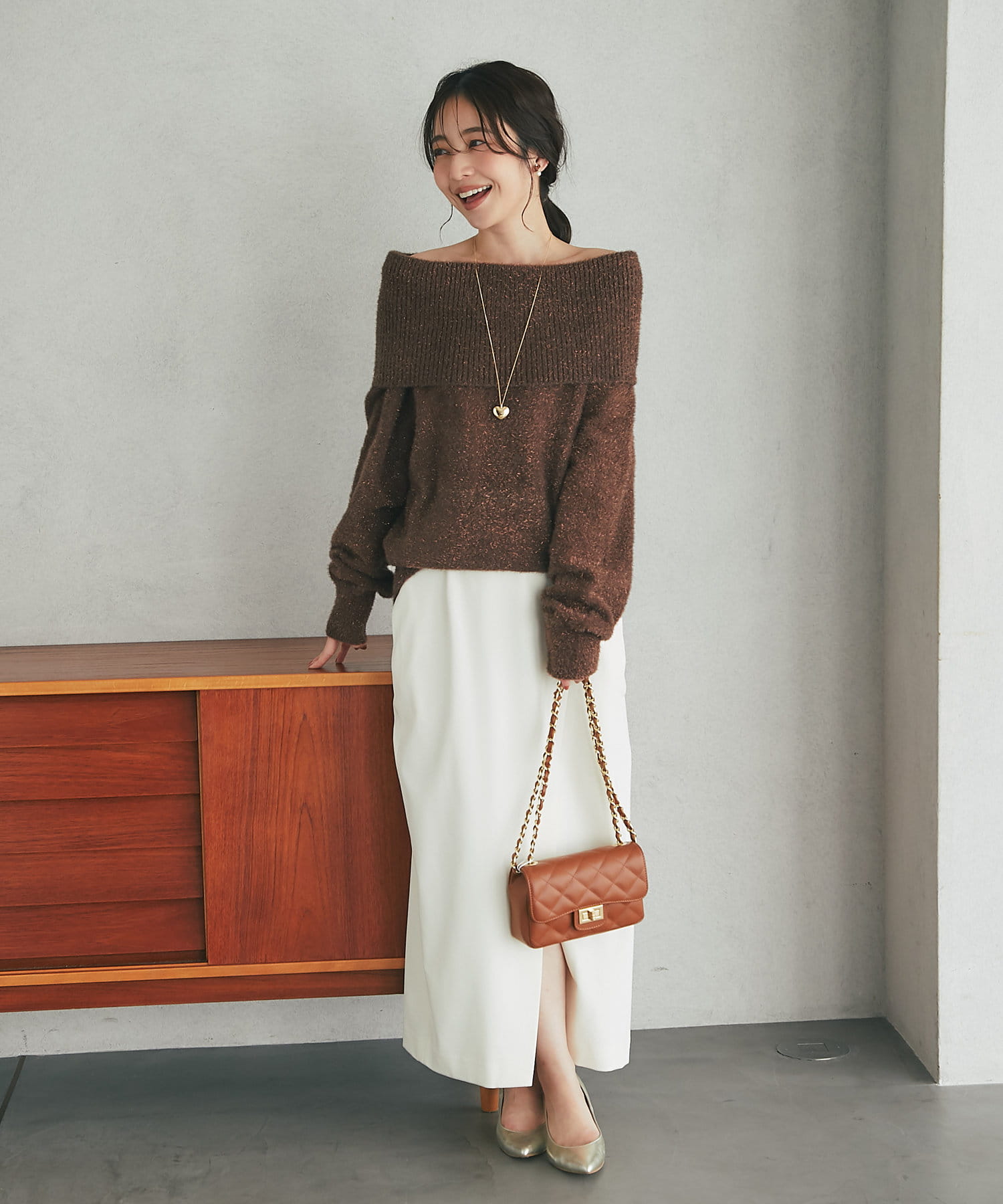 オフショルでデコルテが綺麗に見え、着るだけで女性らしいシルエットに。