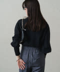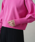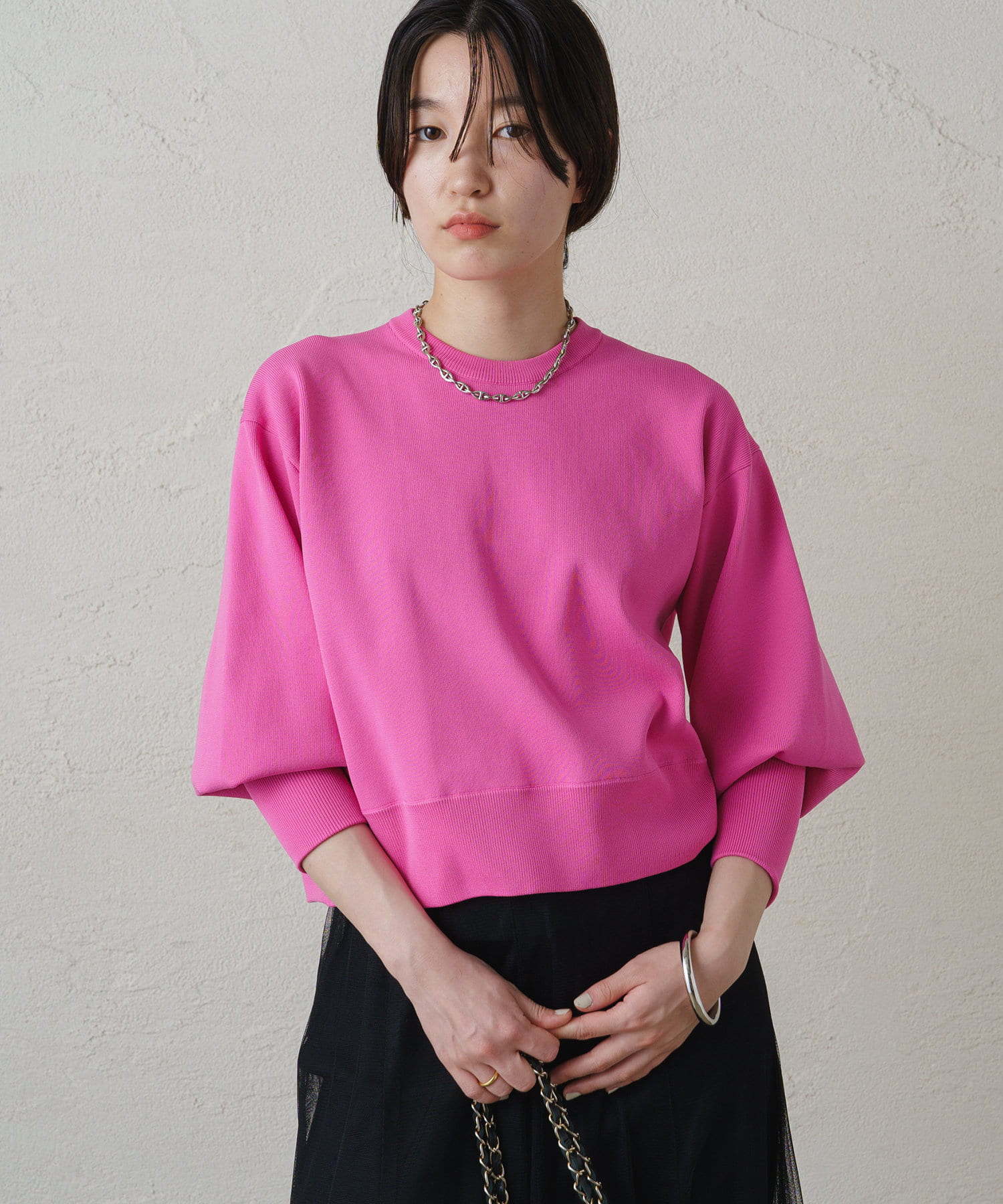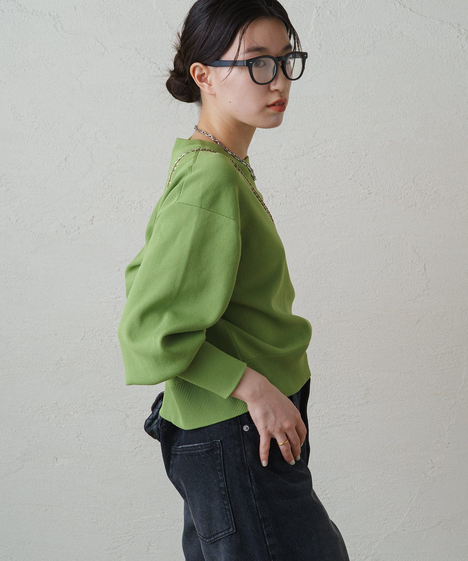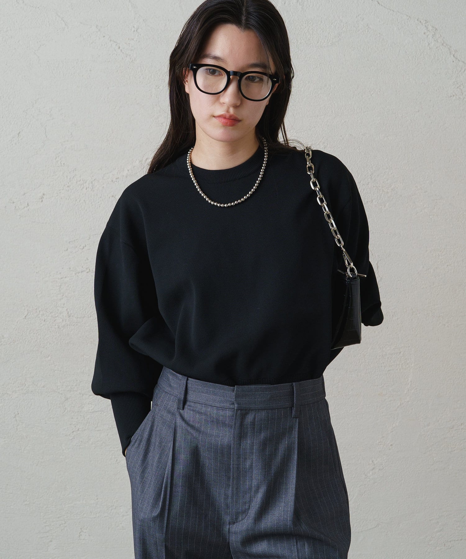 少しハリのあるニット素材とツヤ感で、軽やかな印象で着て頂けるニット。