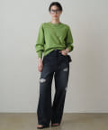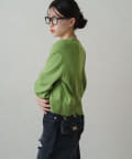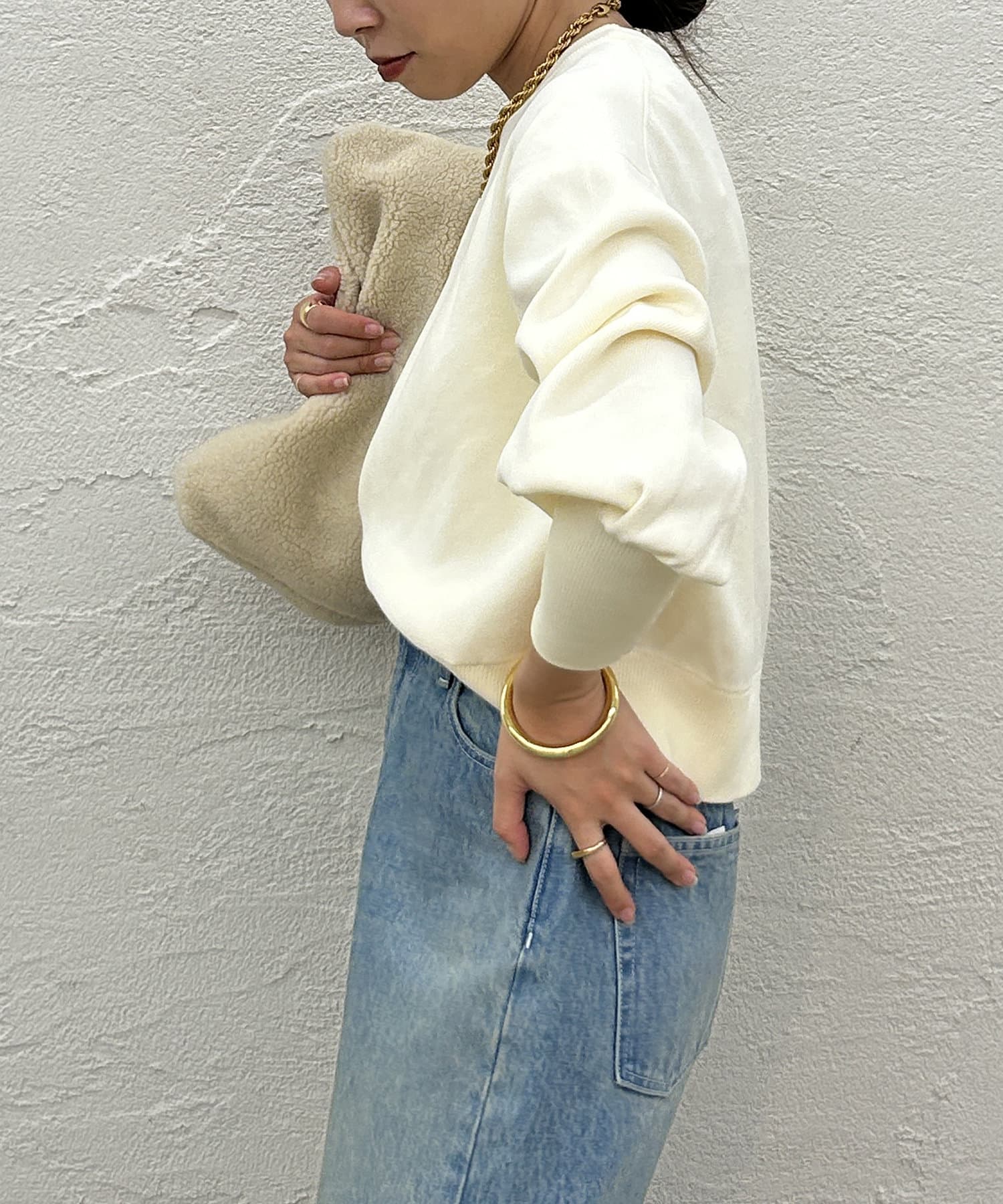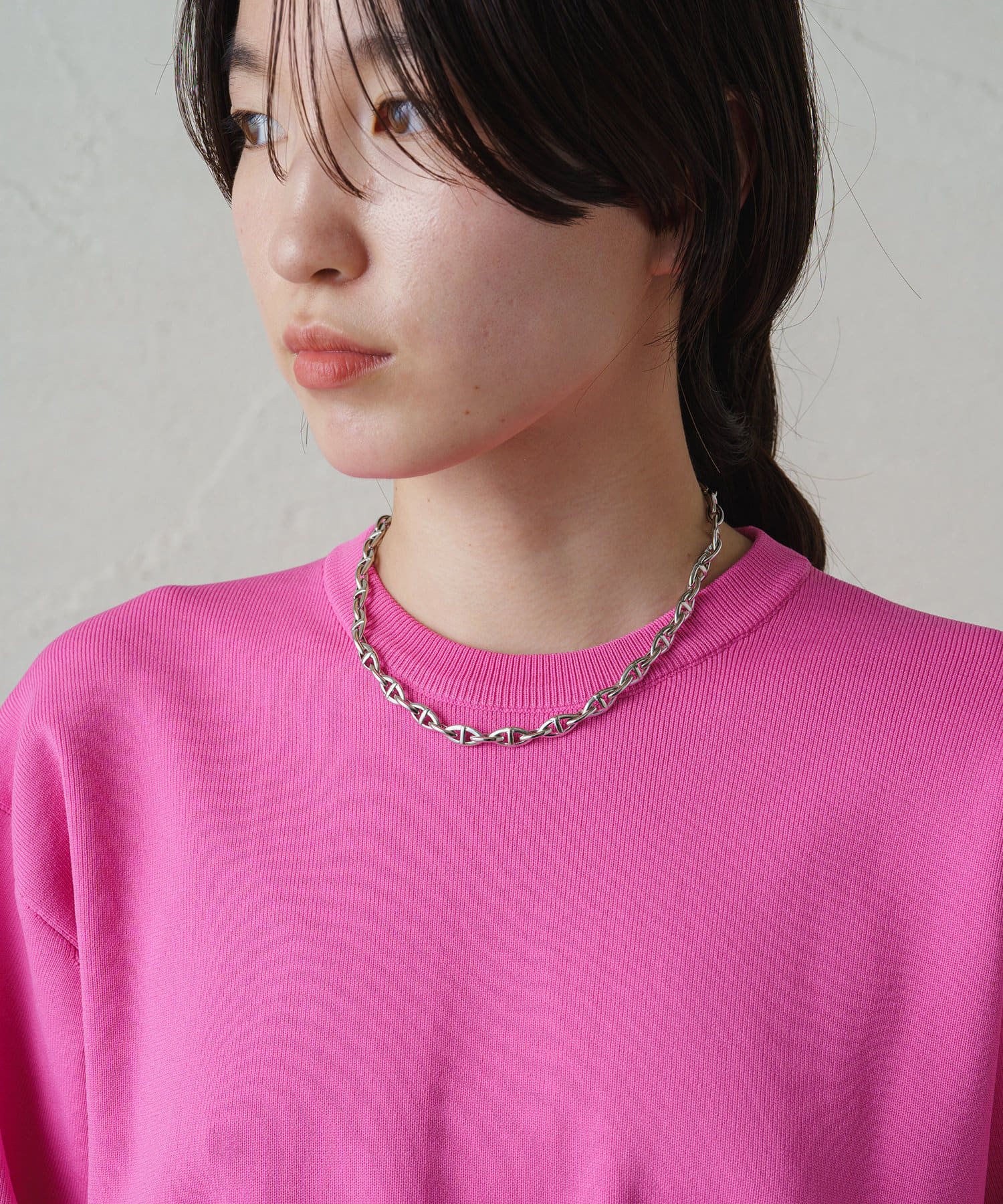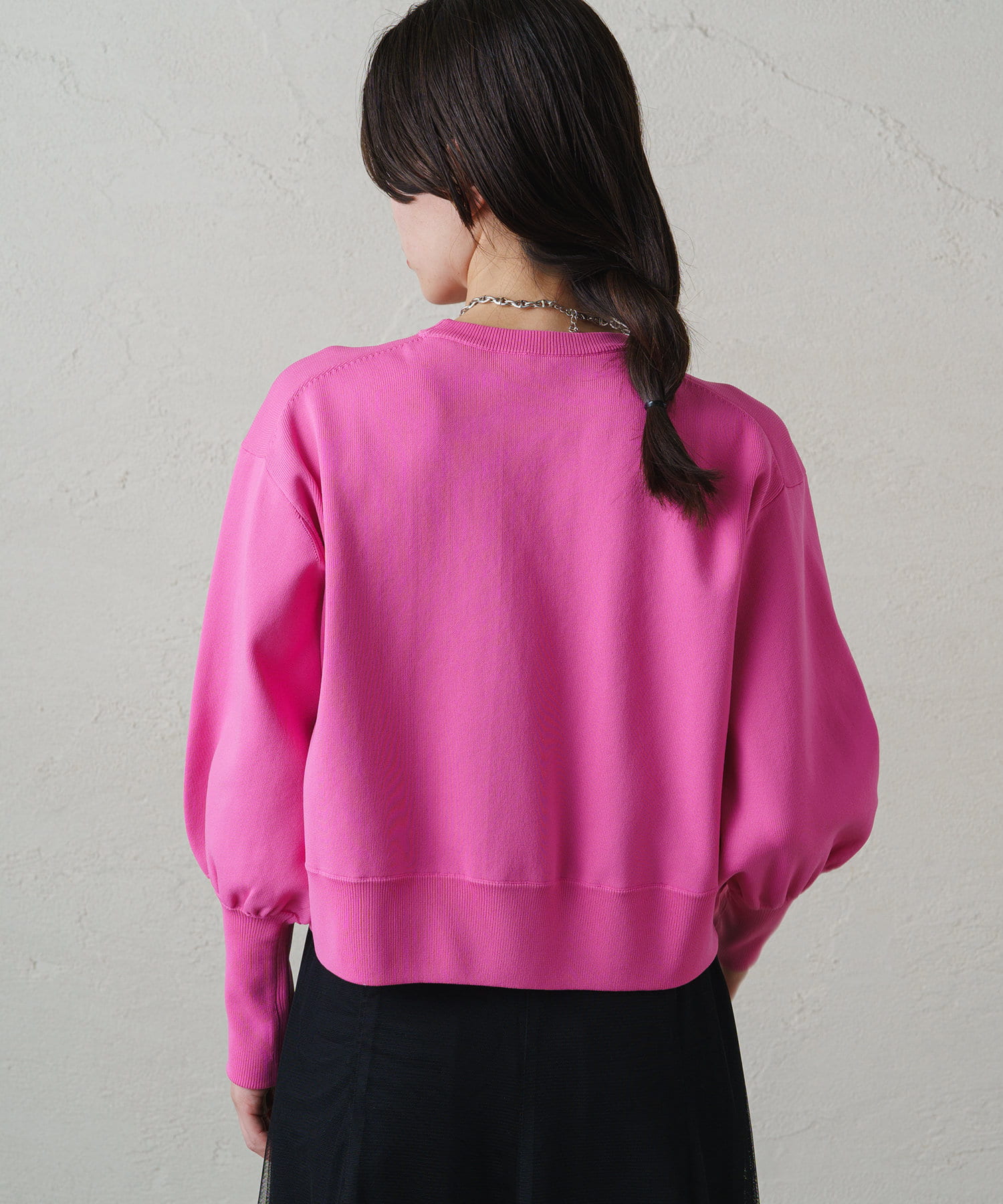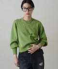 少しハリのあるニット素材とツヤ感で、軽やかな印象で着て頂けるニット。