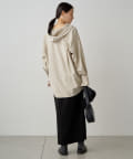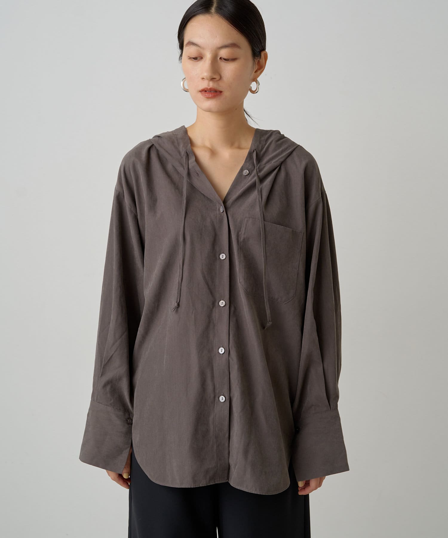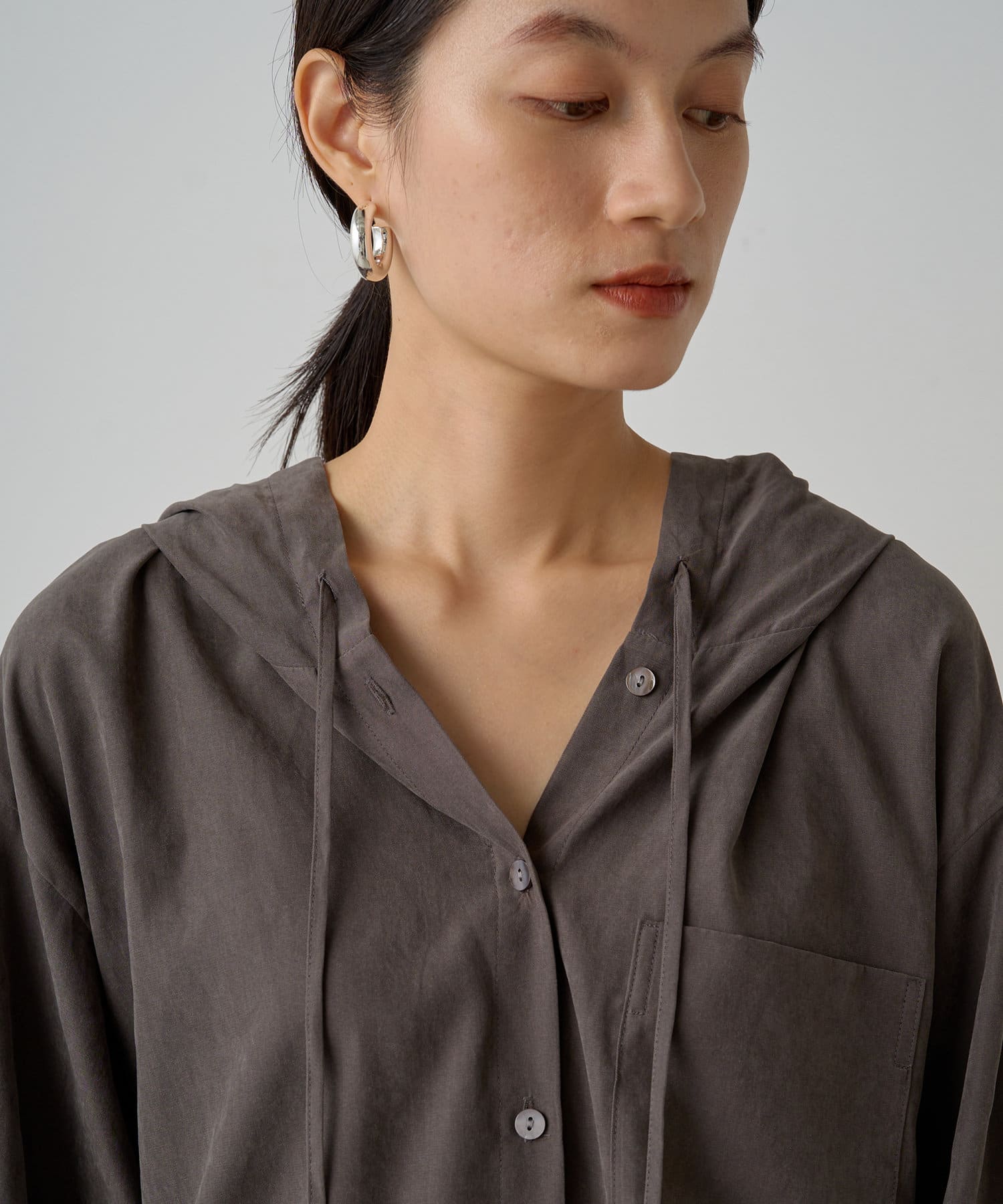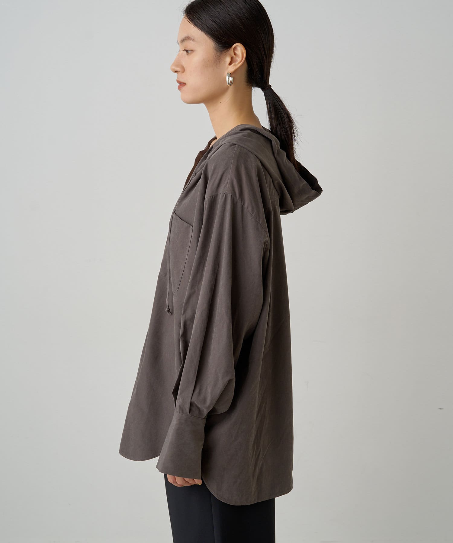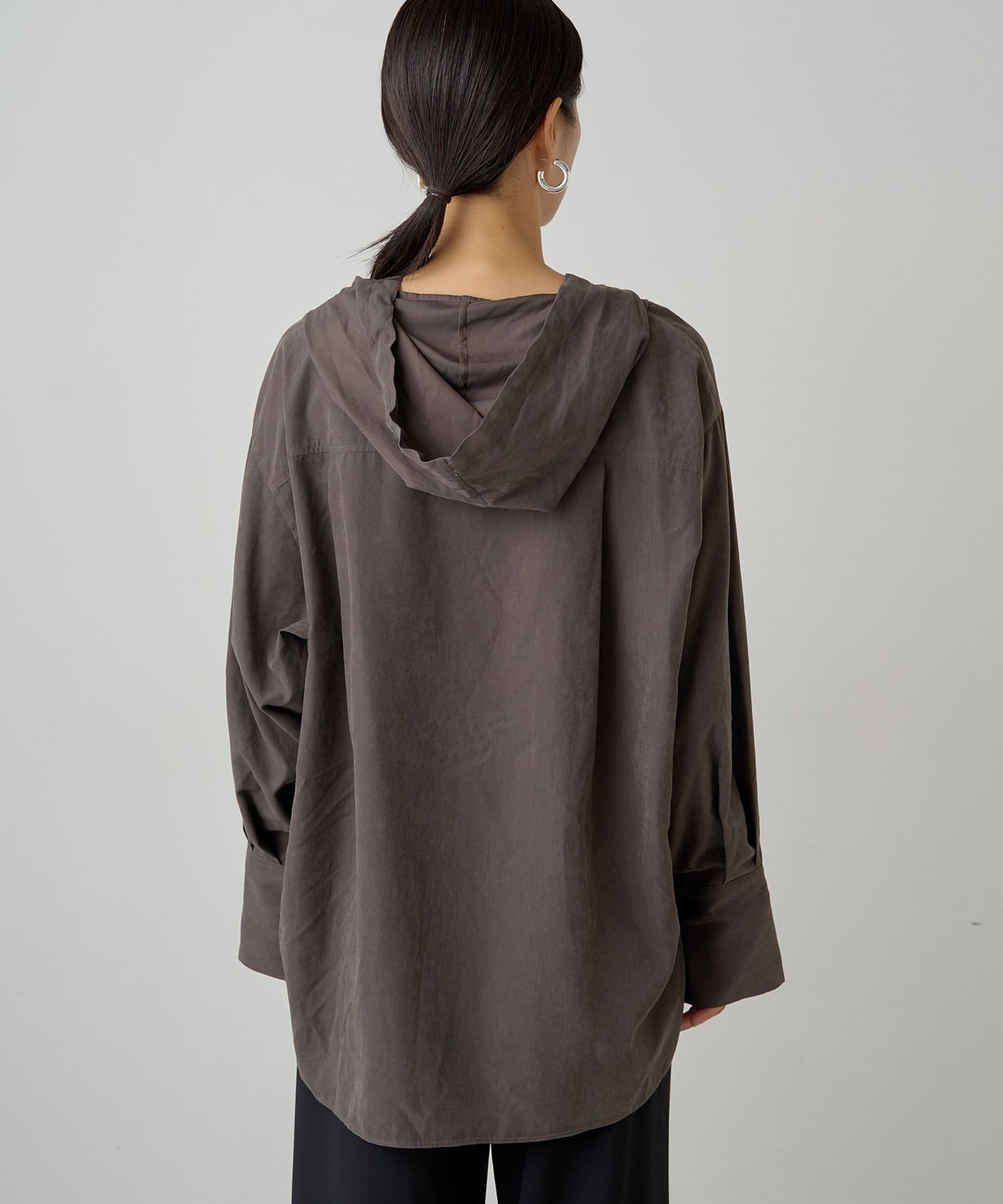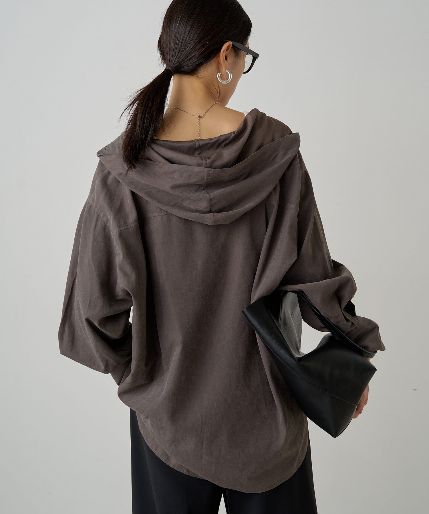 なめらかなセミマット素材とフードデザインで上品な大人カジュアルに。