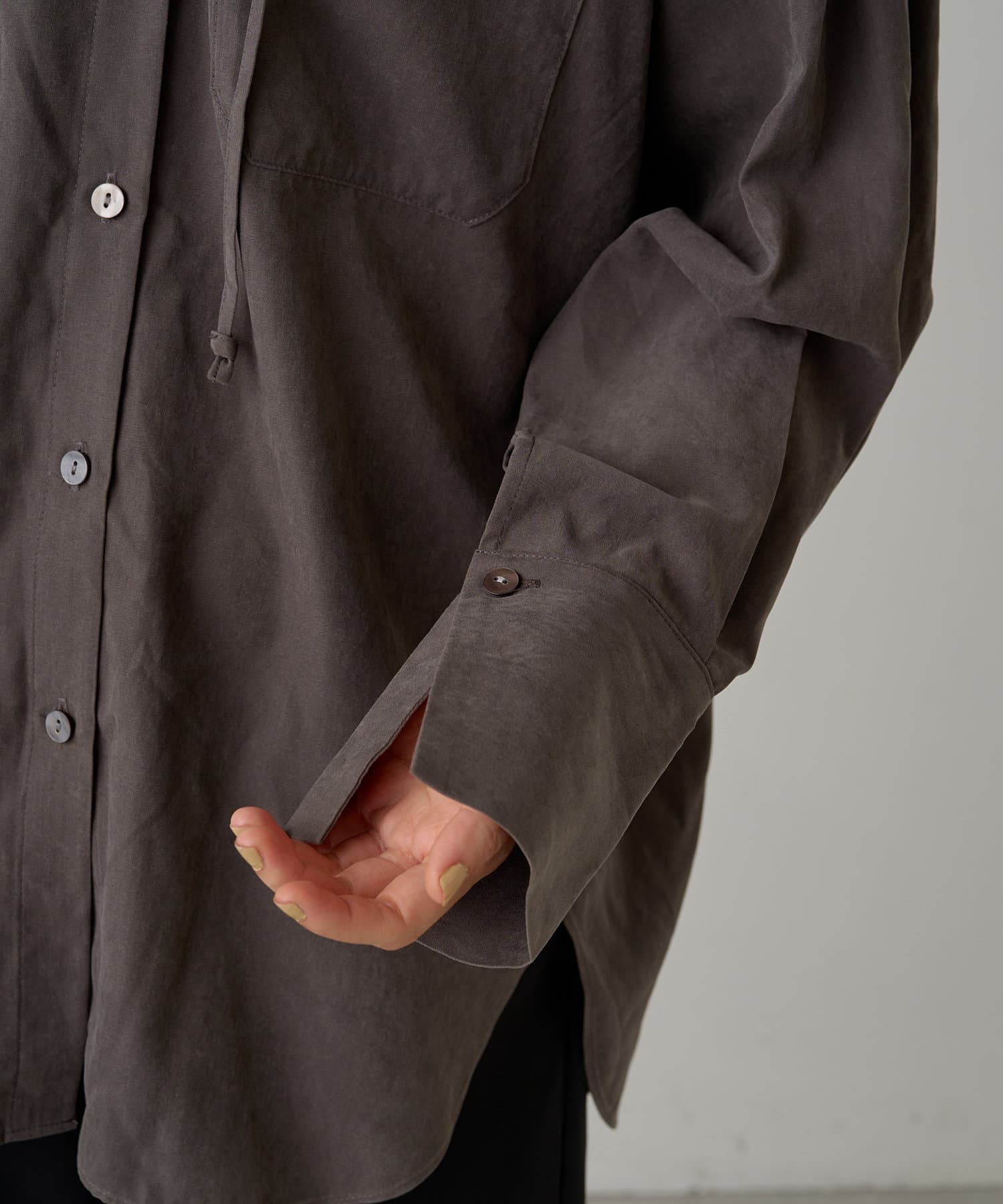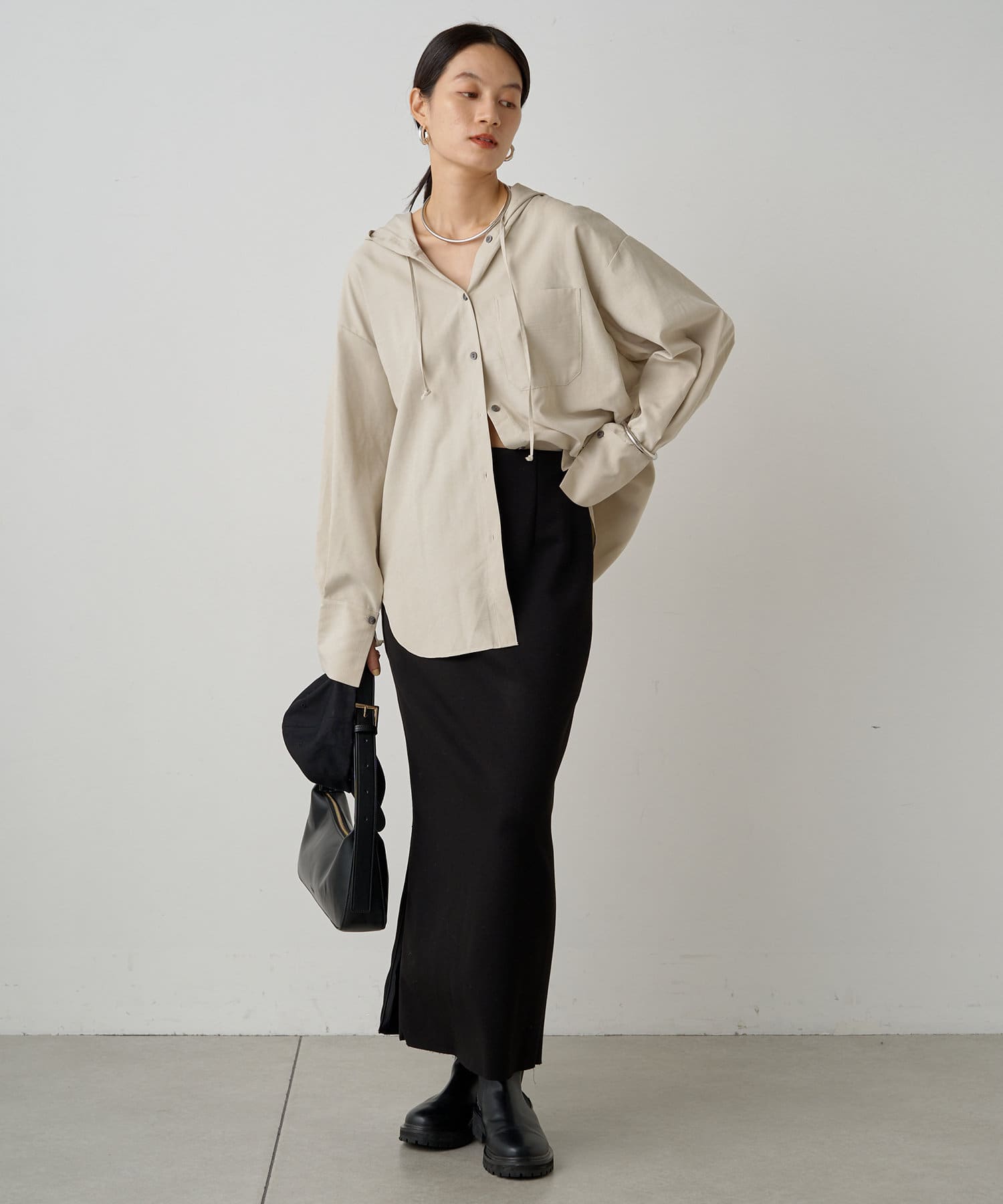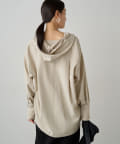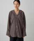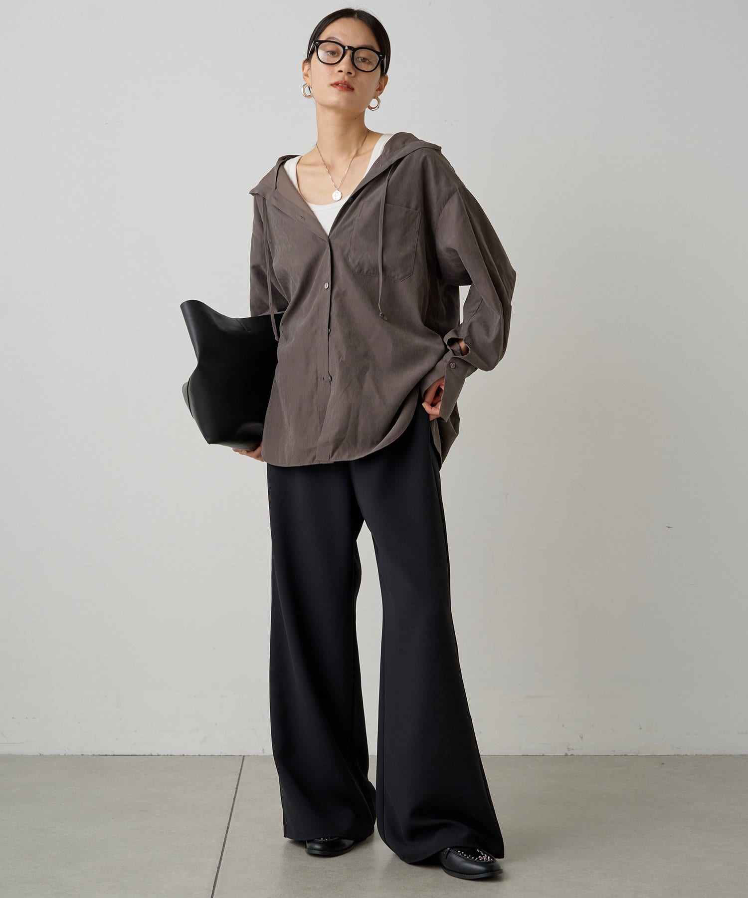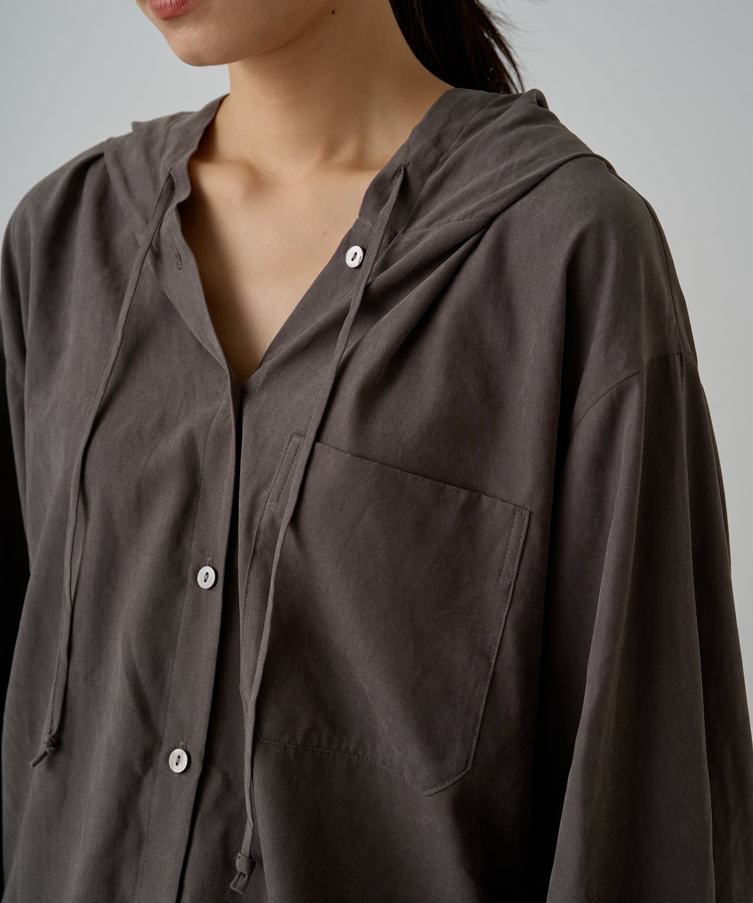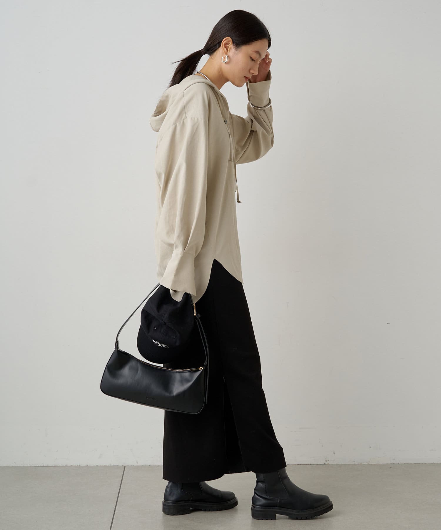 なめらかなセミマット素材とフードデザインで上品な大人カジュアルに。