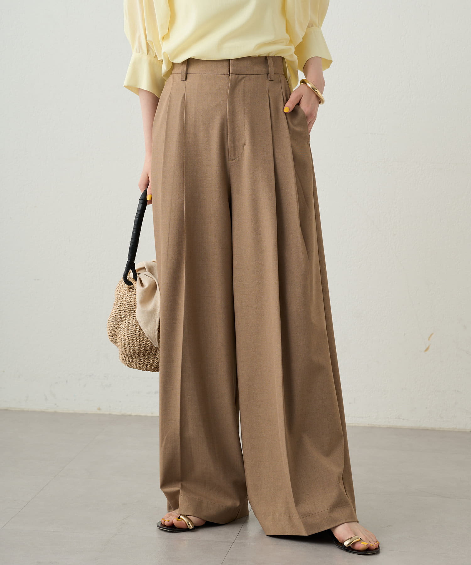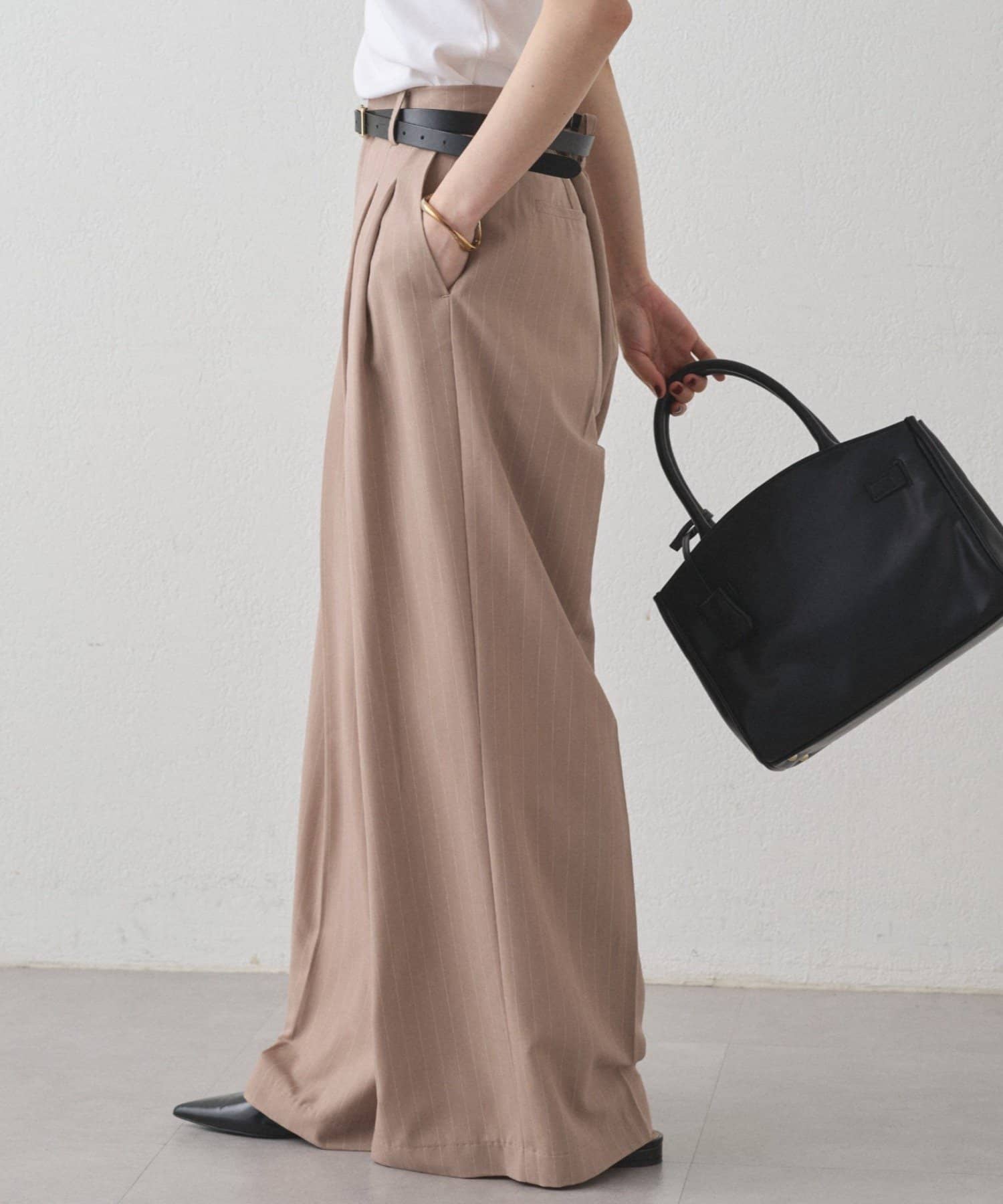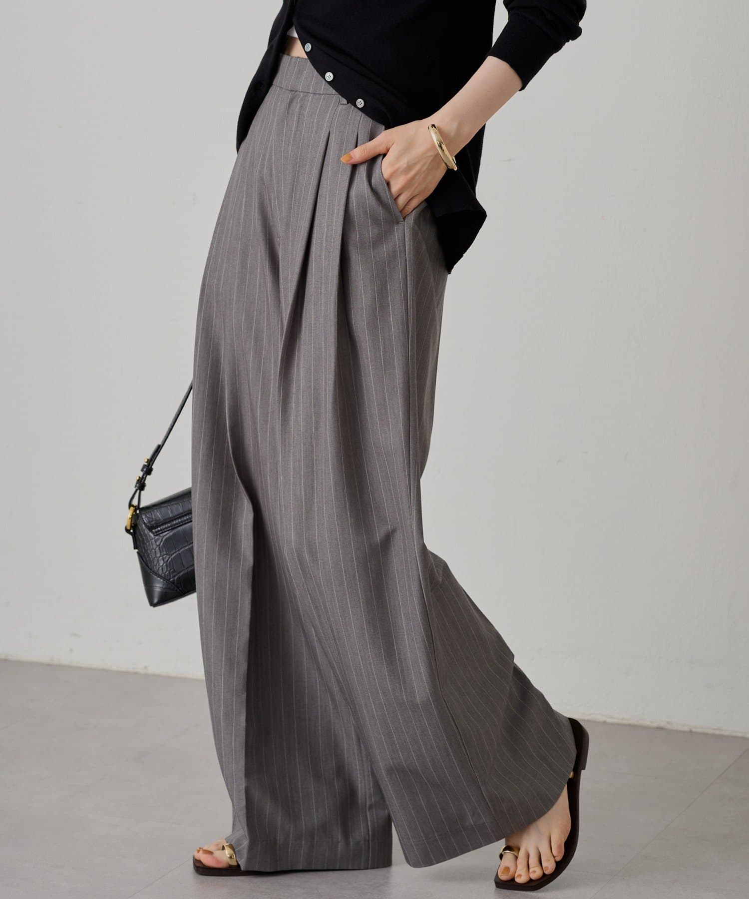 腰周りをカバーしながらすっきり見せてくれるワイドパンツ。