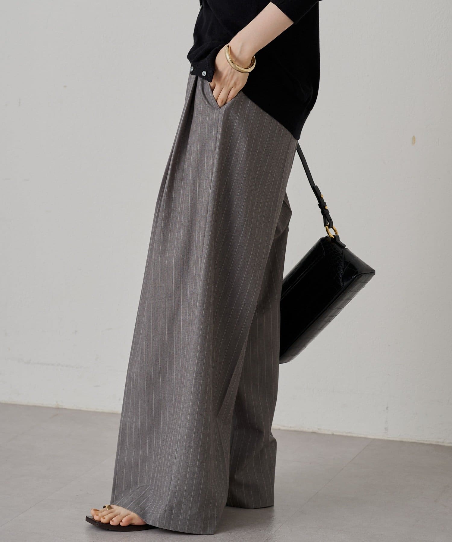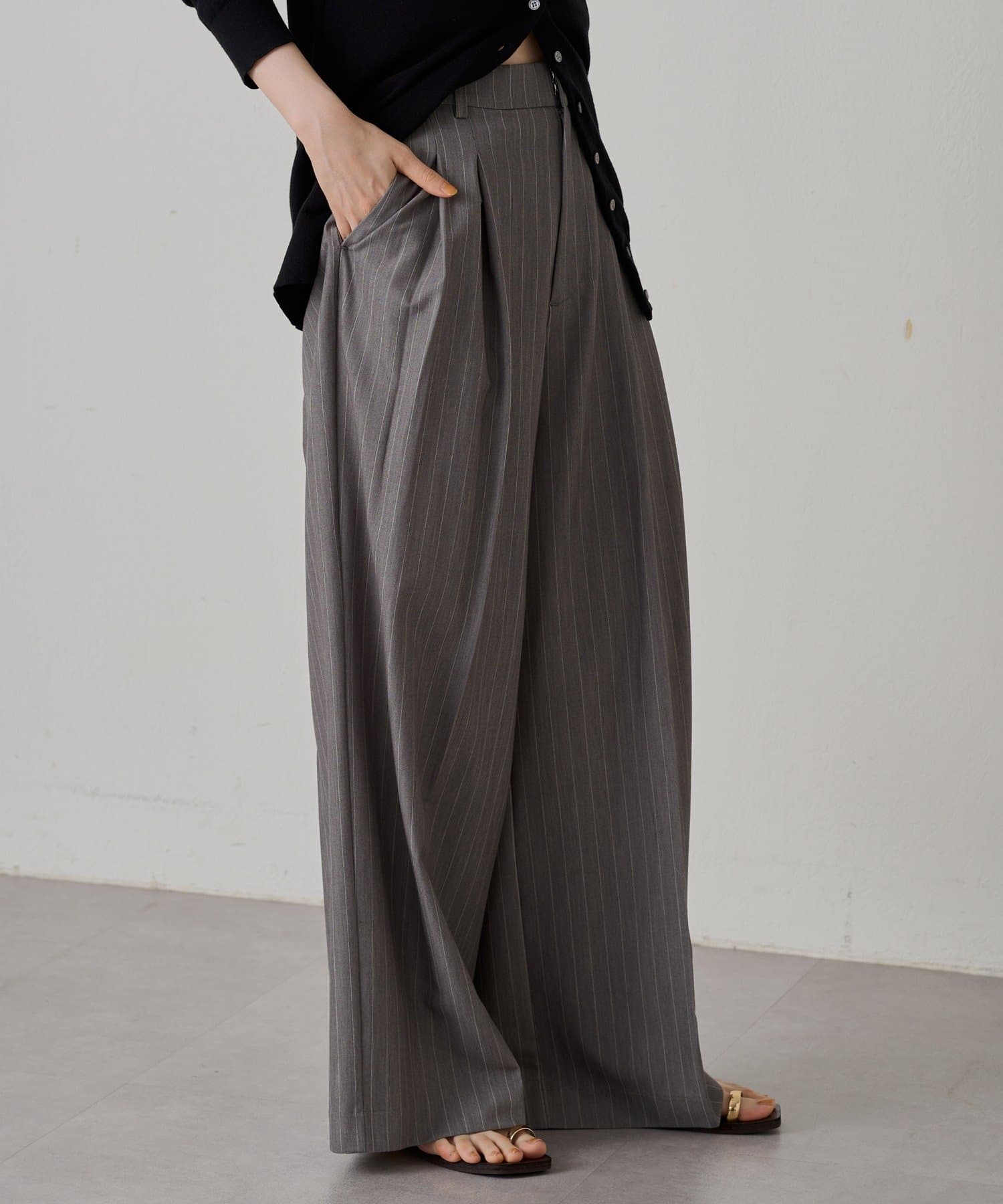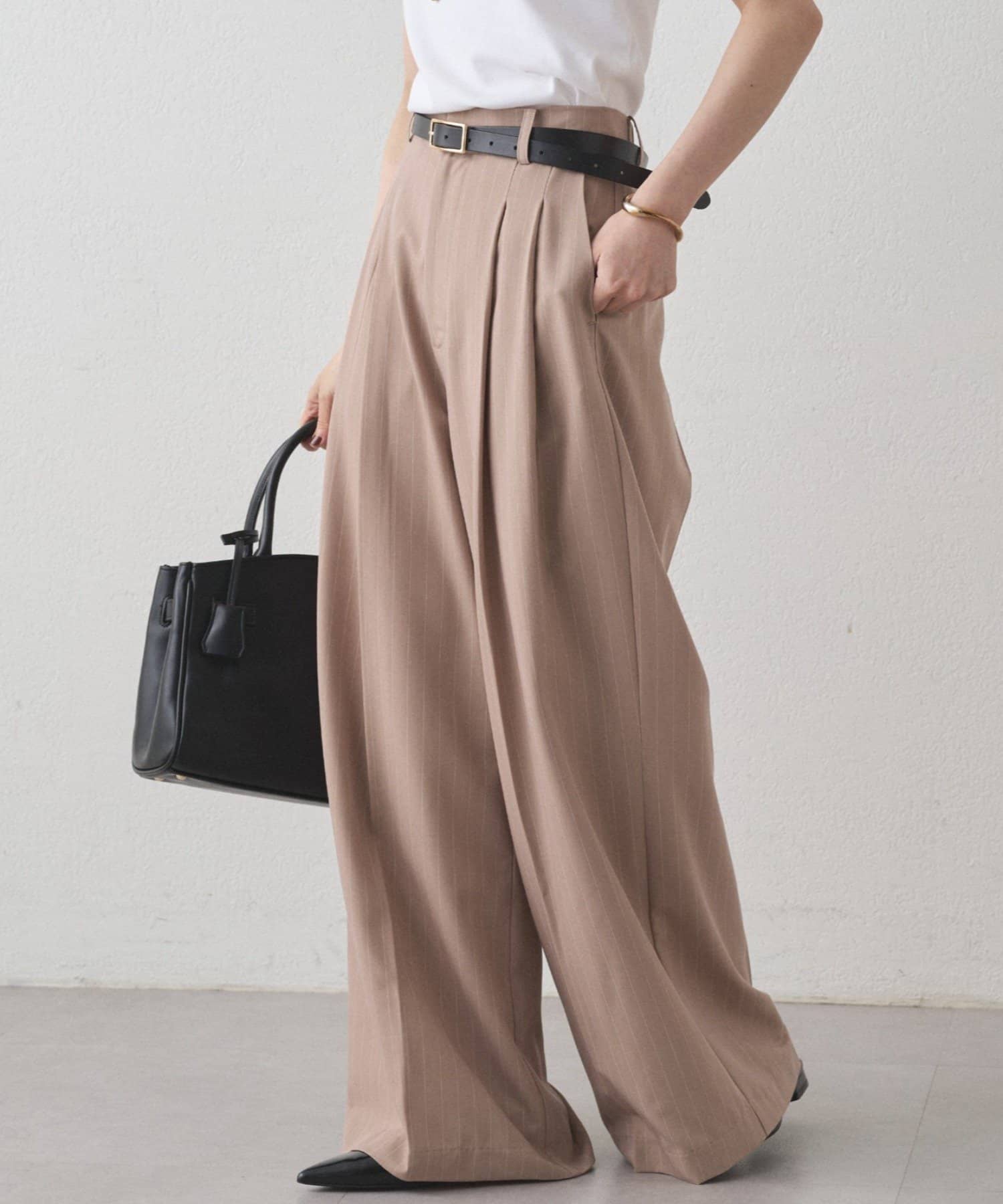 腰周りをカバーしながらすっきり見せてくれるワイドパンツ。