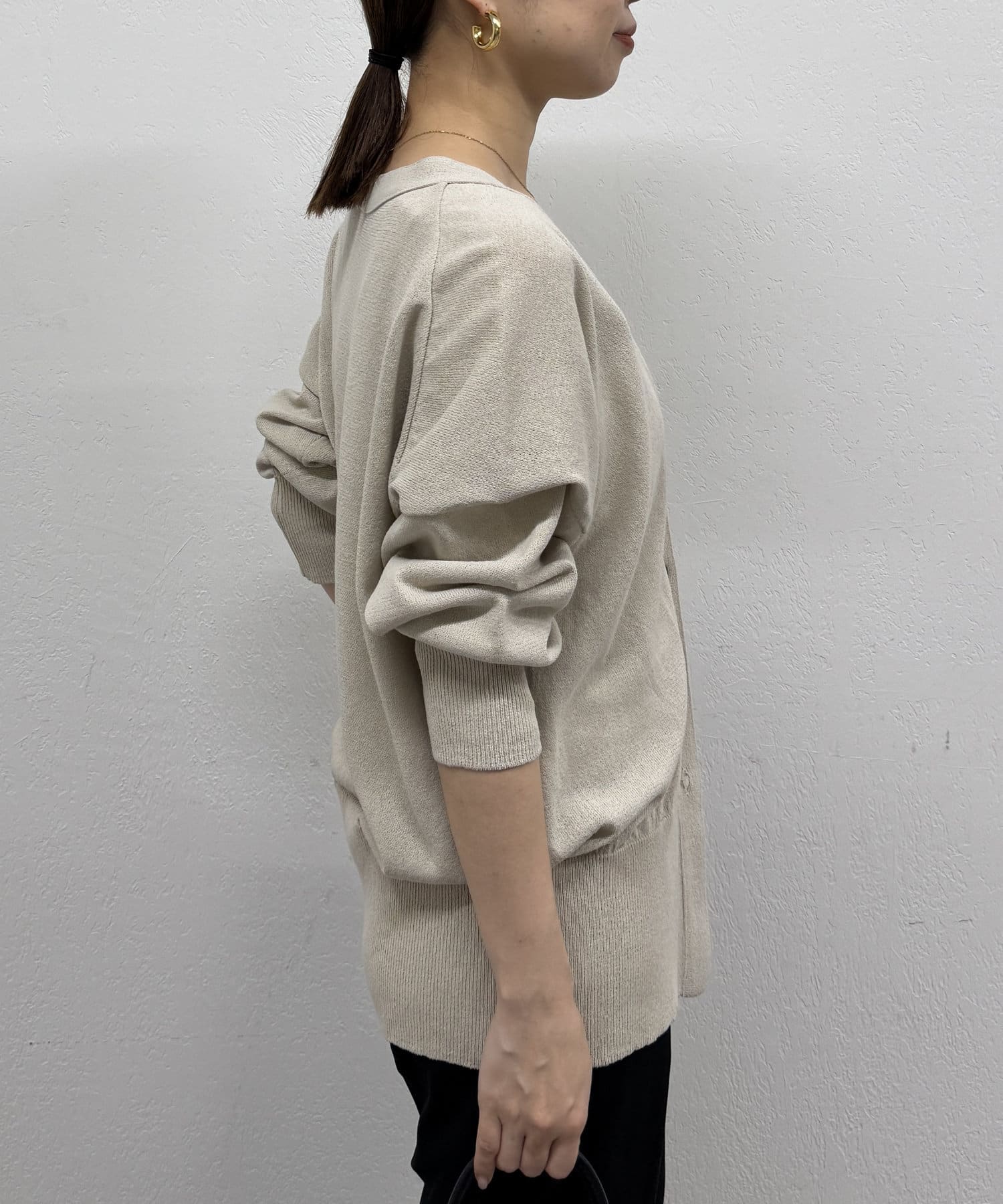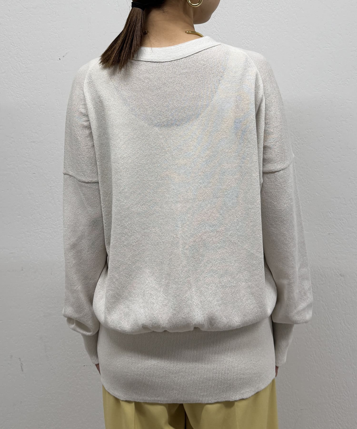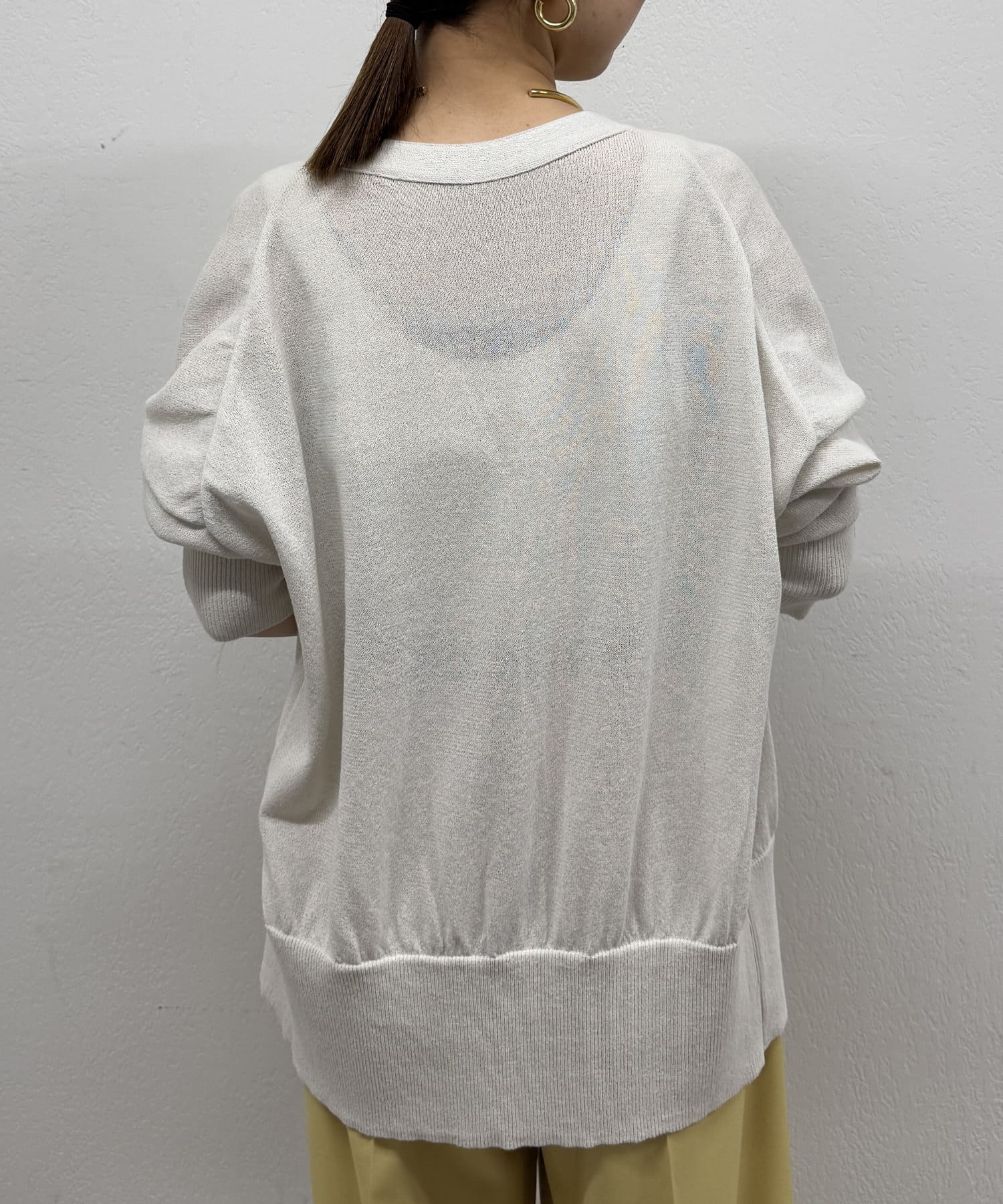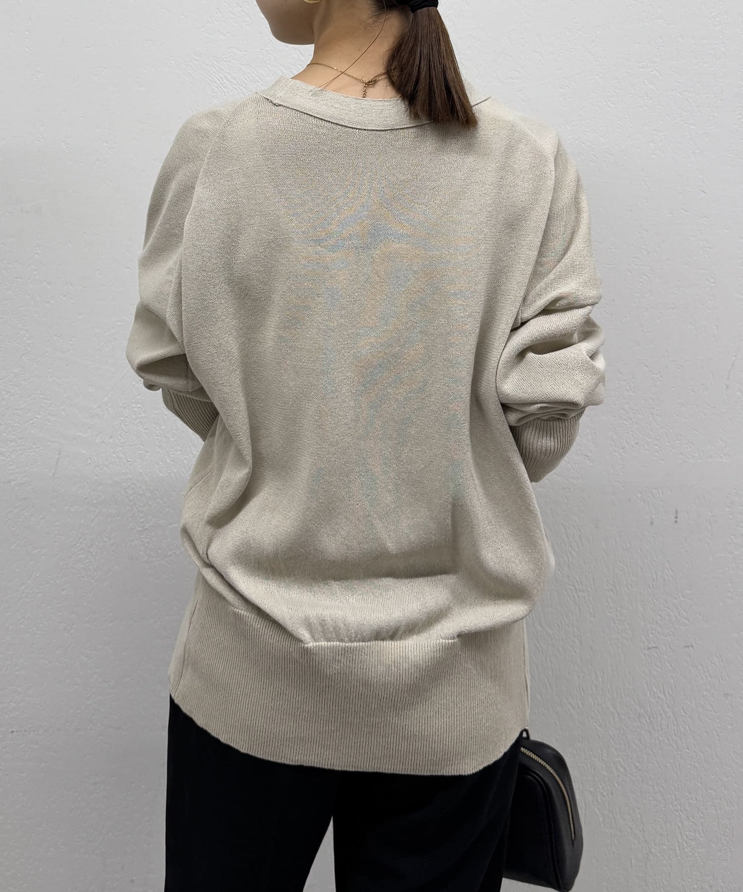 Vネックで首回りすっきり見えするのと、ややゆとりのあるサイズ感で女性らしさも演出してくれます。