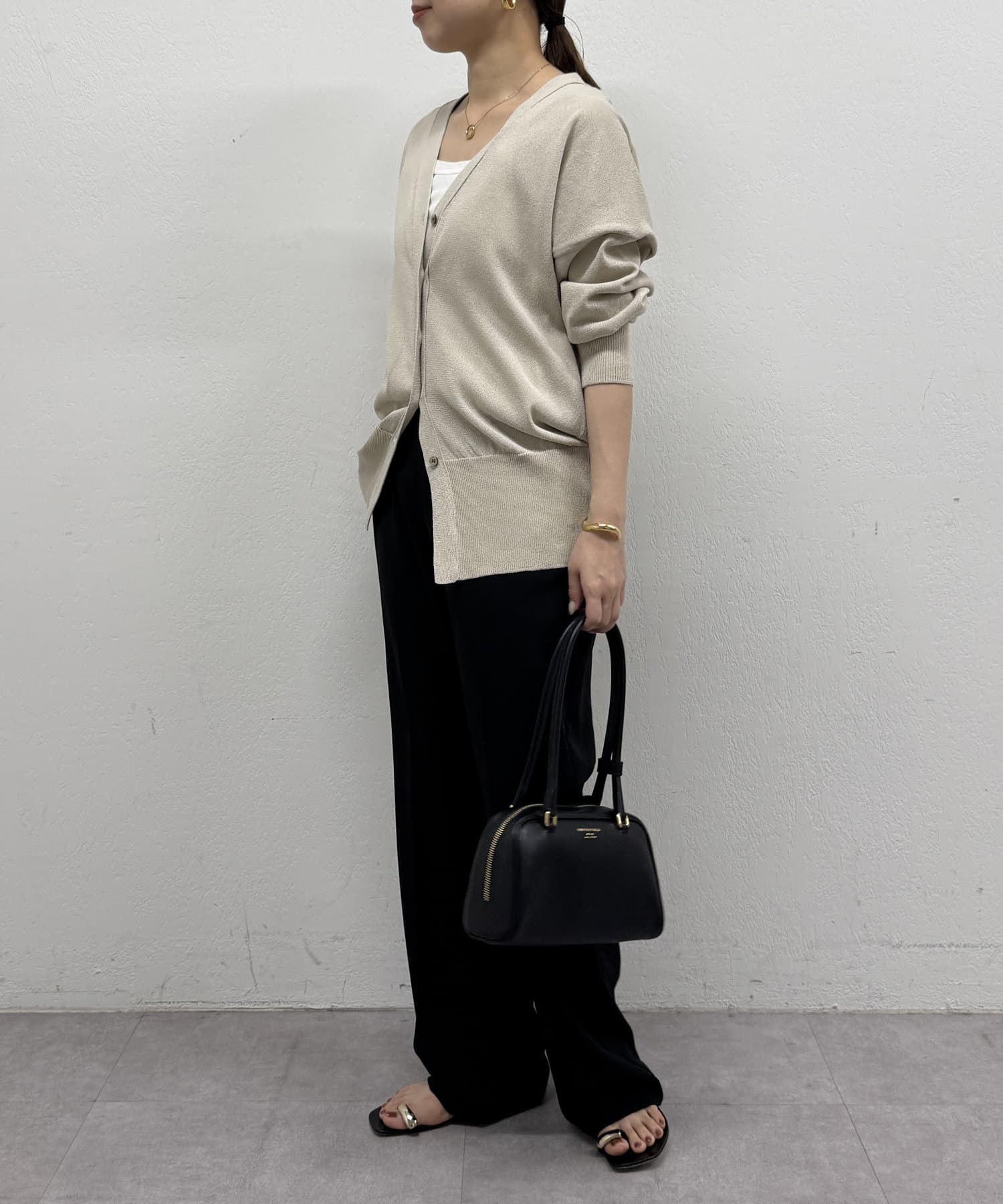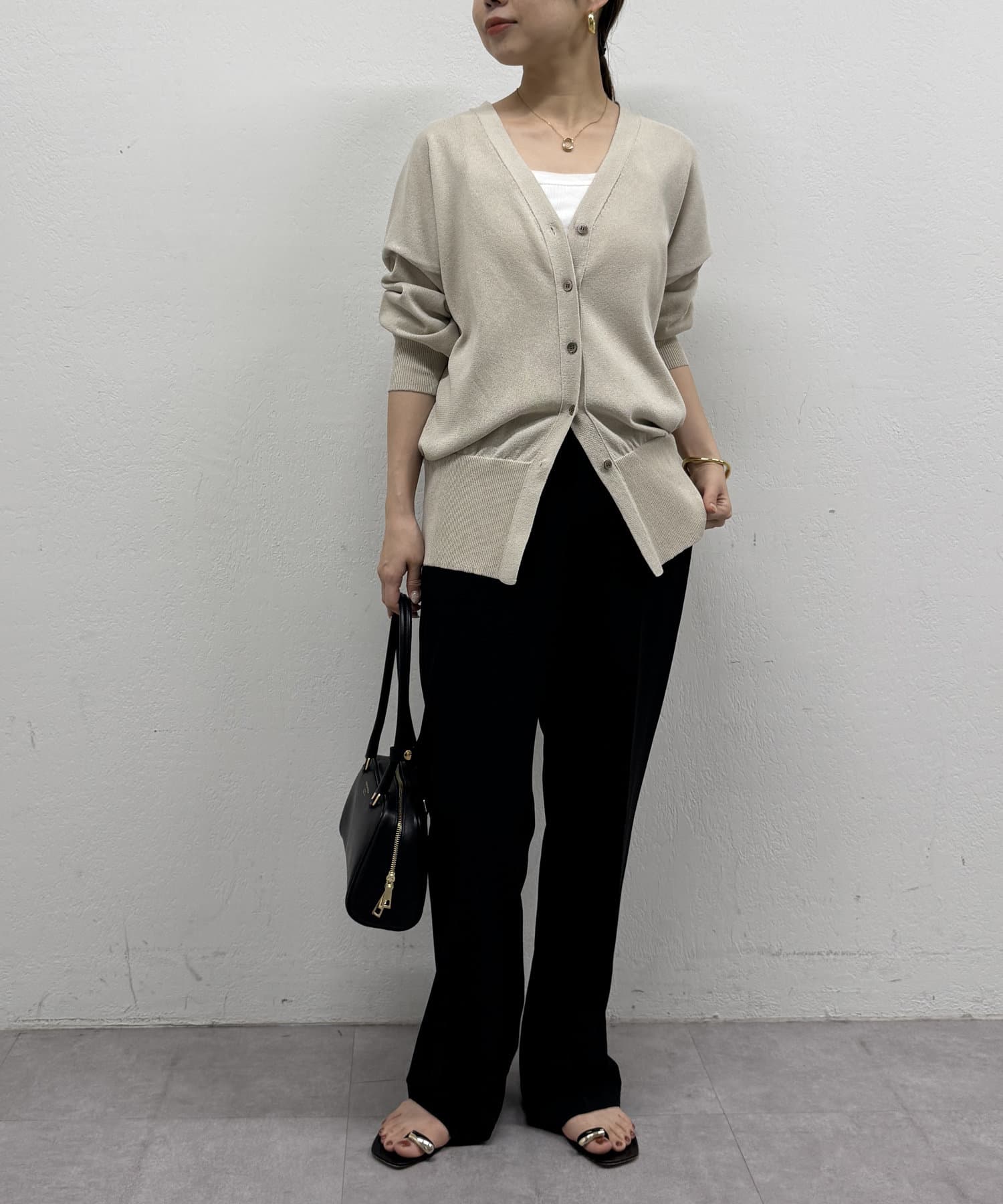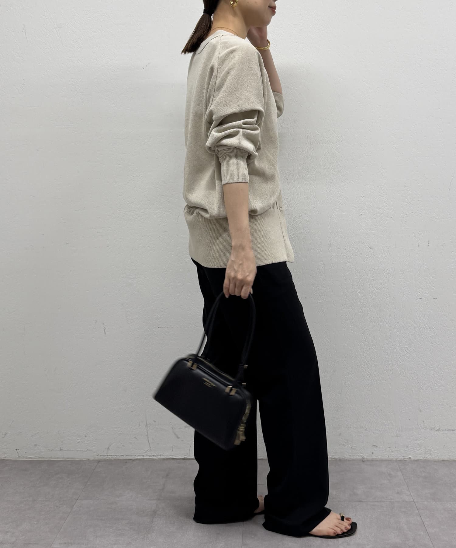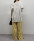 Vネックで首回りすっきり見えするのと、ややゆとりのあるサイズ感で女性らしさも演出してくれます。
