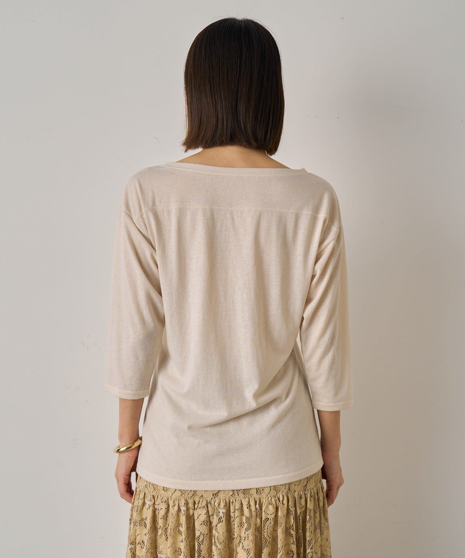 ネックラインはボートネックで、袖は七分丈なので、抜け感のある着こなしが楽しめます。