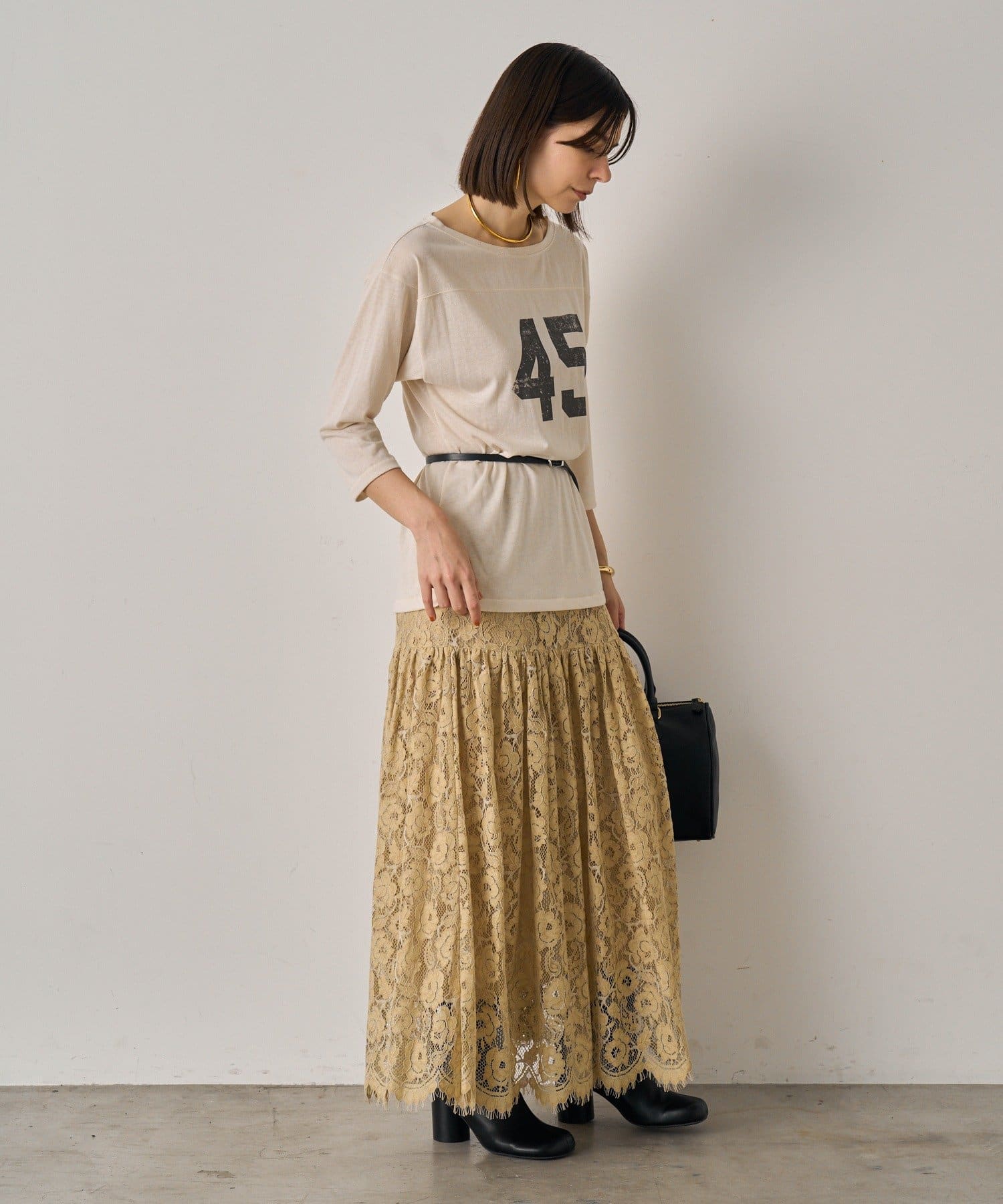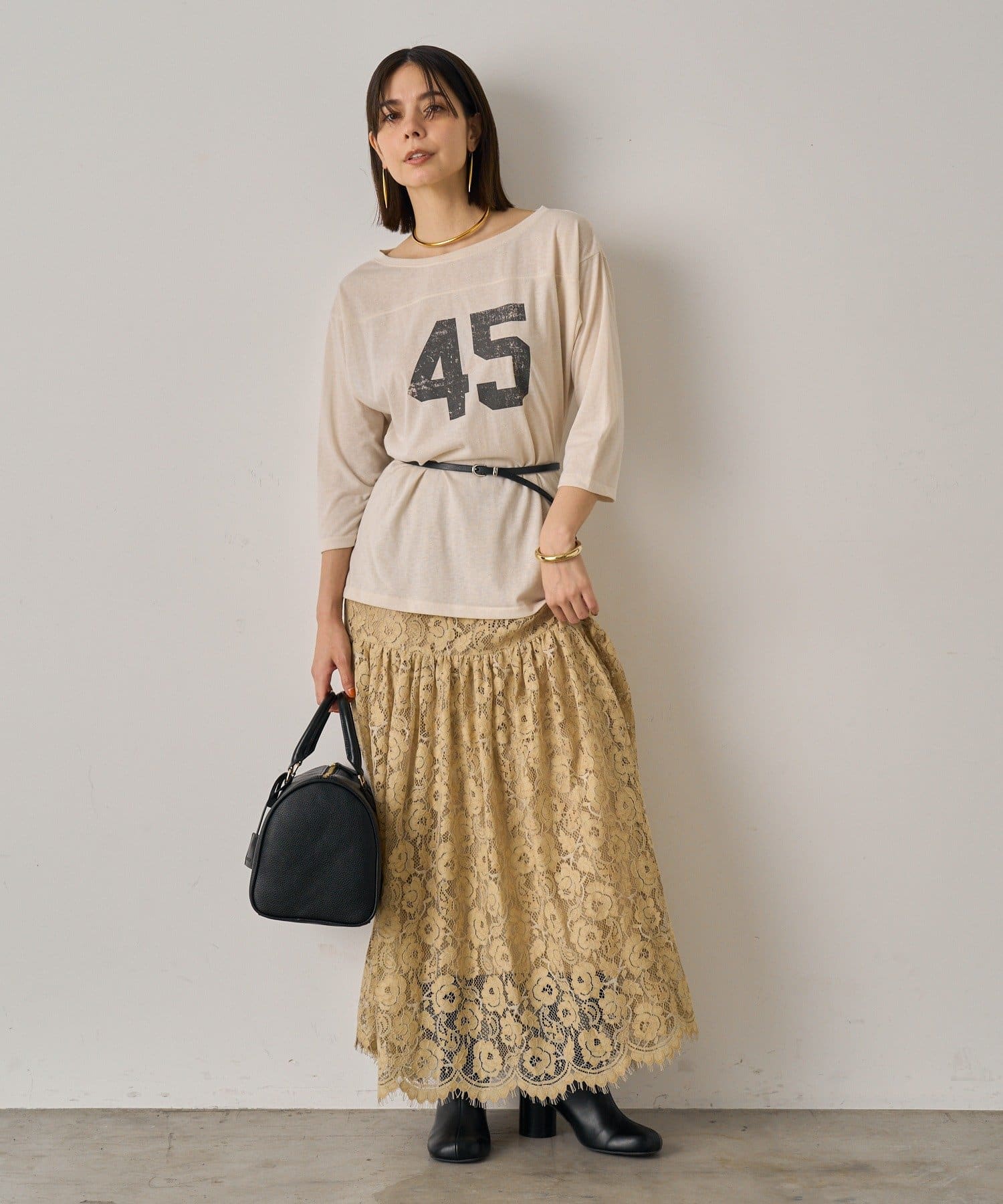 とてもシンプルなアイテムになるので、ボトムスはレースのスカートやプリーツスカートなど
