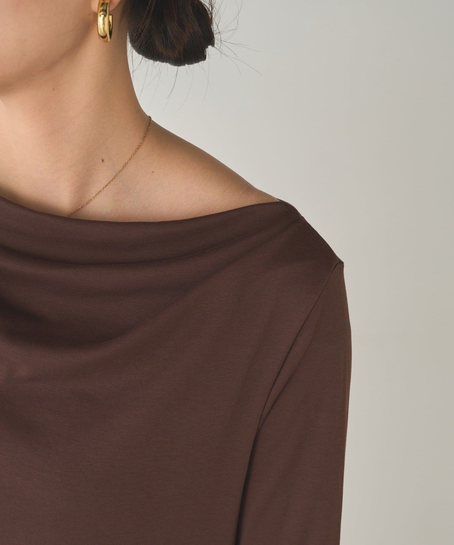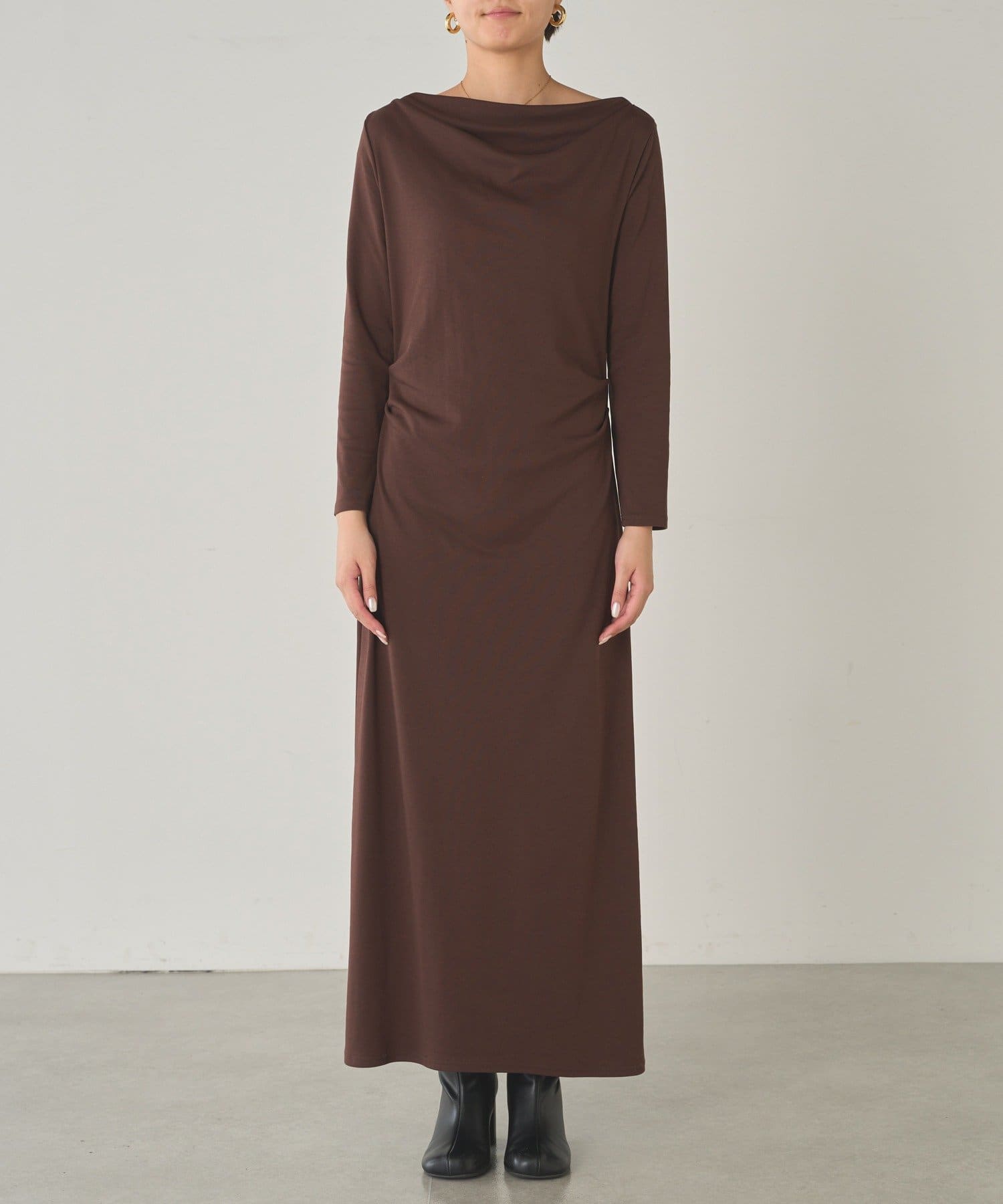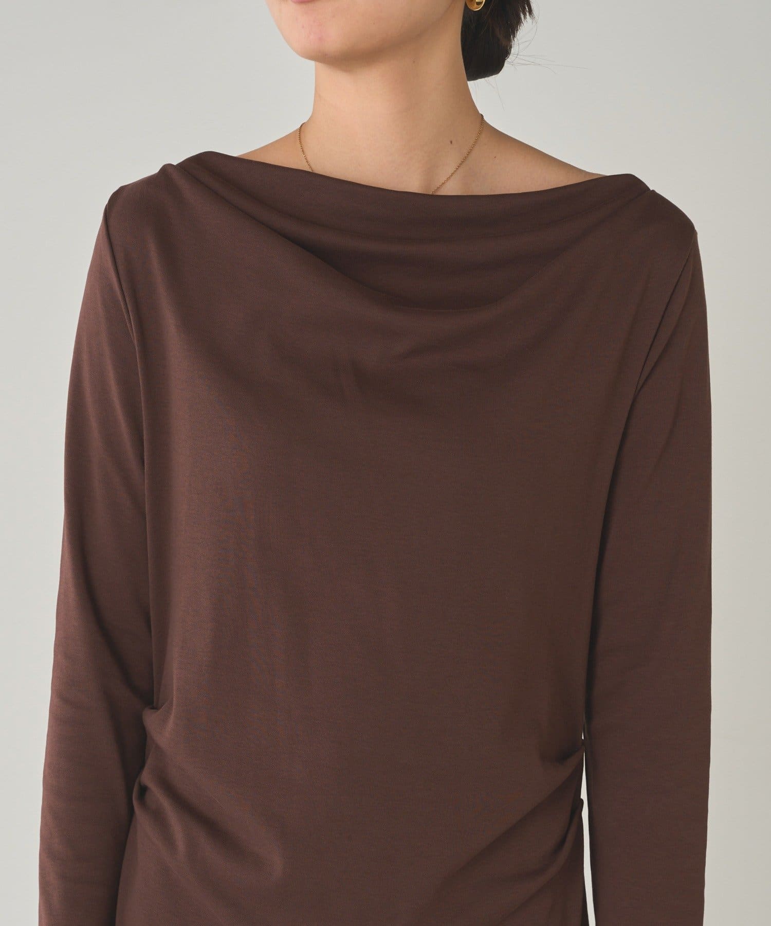 目を引くのは、首元から胸元にかけてふんだんにあしらわれたドレープ。