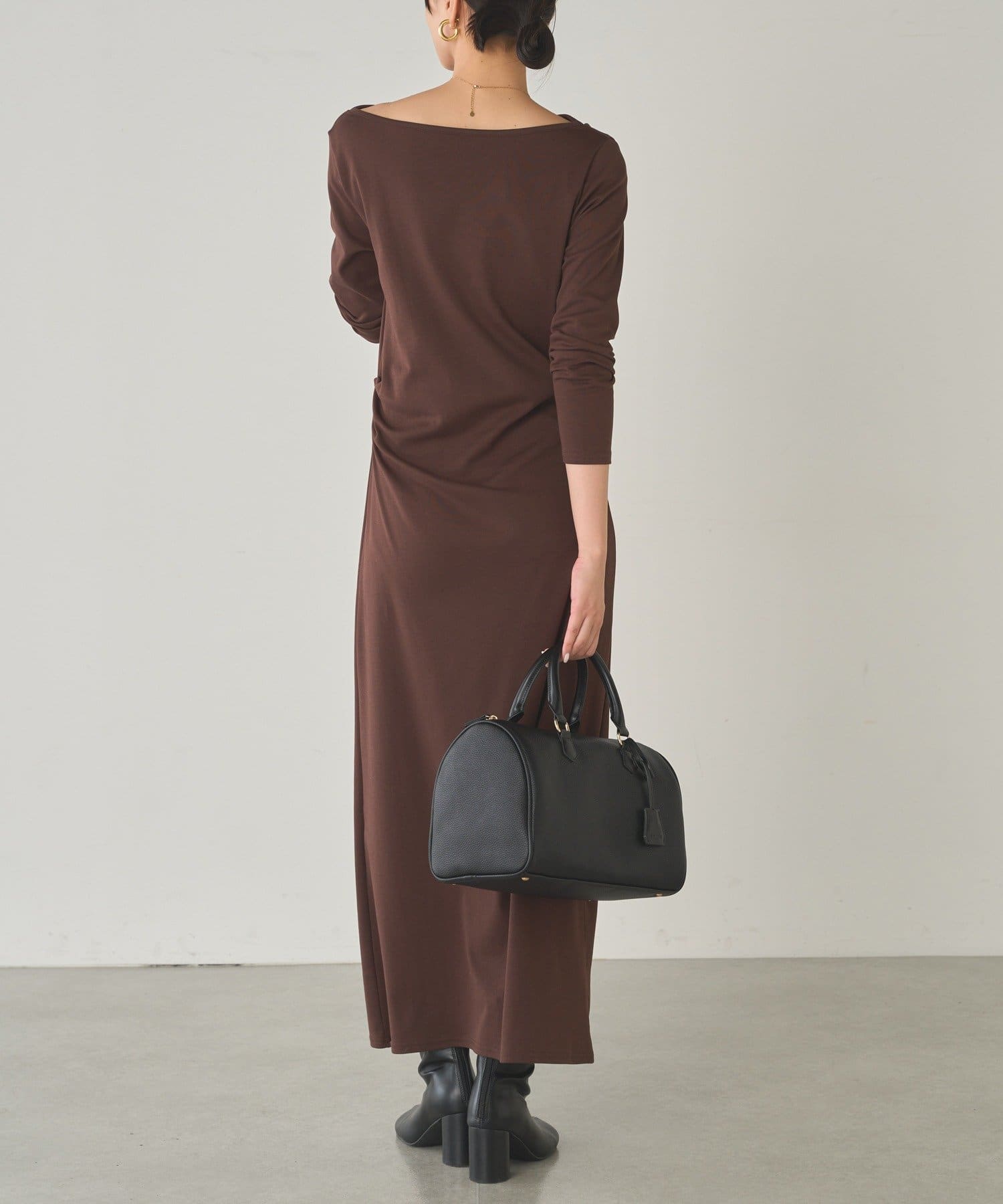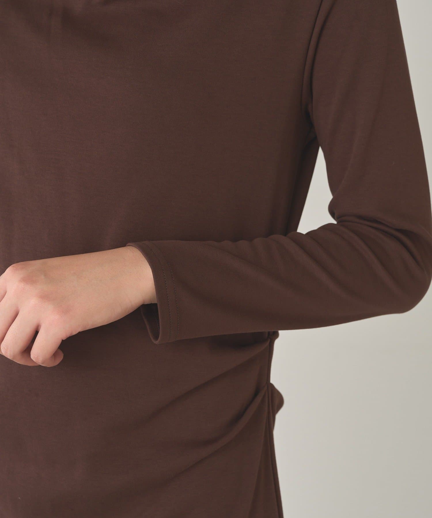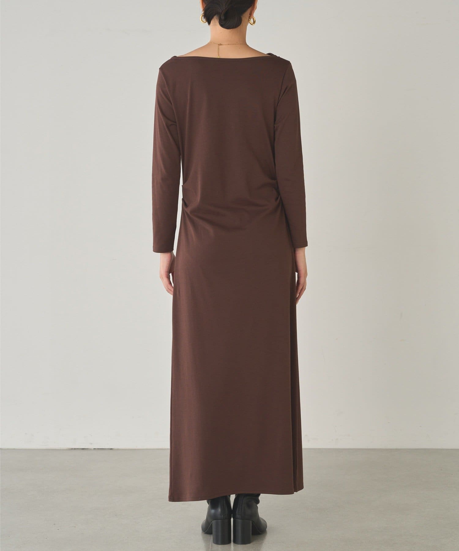 目を引くのは、首元から胸元にかけてふんだんにあしらわれたドレープ。
