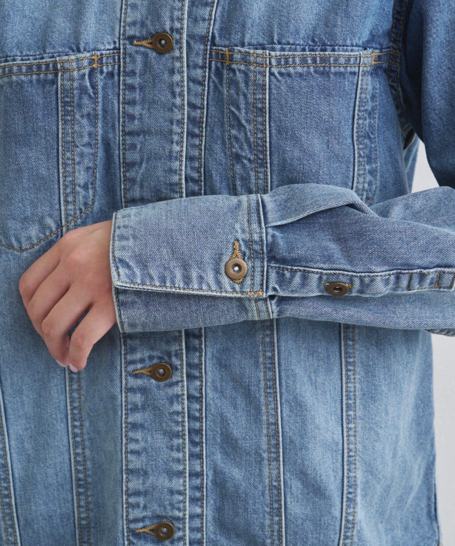 程よく色落ちした風合いが、まるで長年愛用してきたかのようなヴィンテージ感を醸し出すデニムシャツ。無骨な印象ながらも、現代的な着こなしにマッチする洗練されたデザインが魅力です。