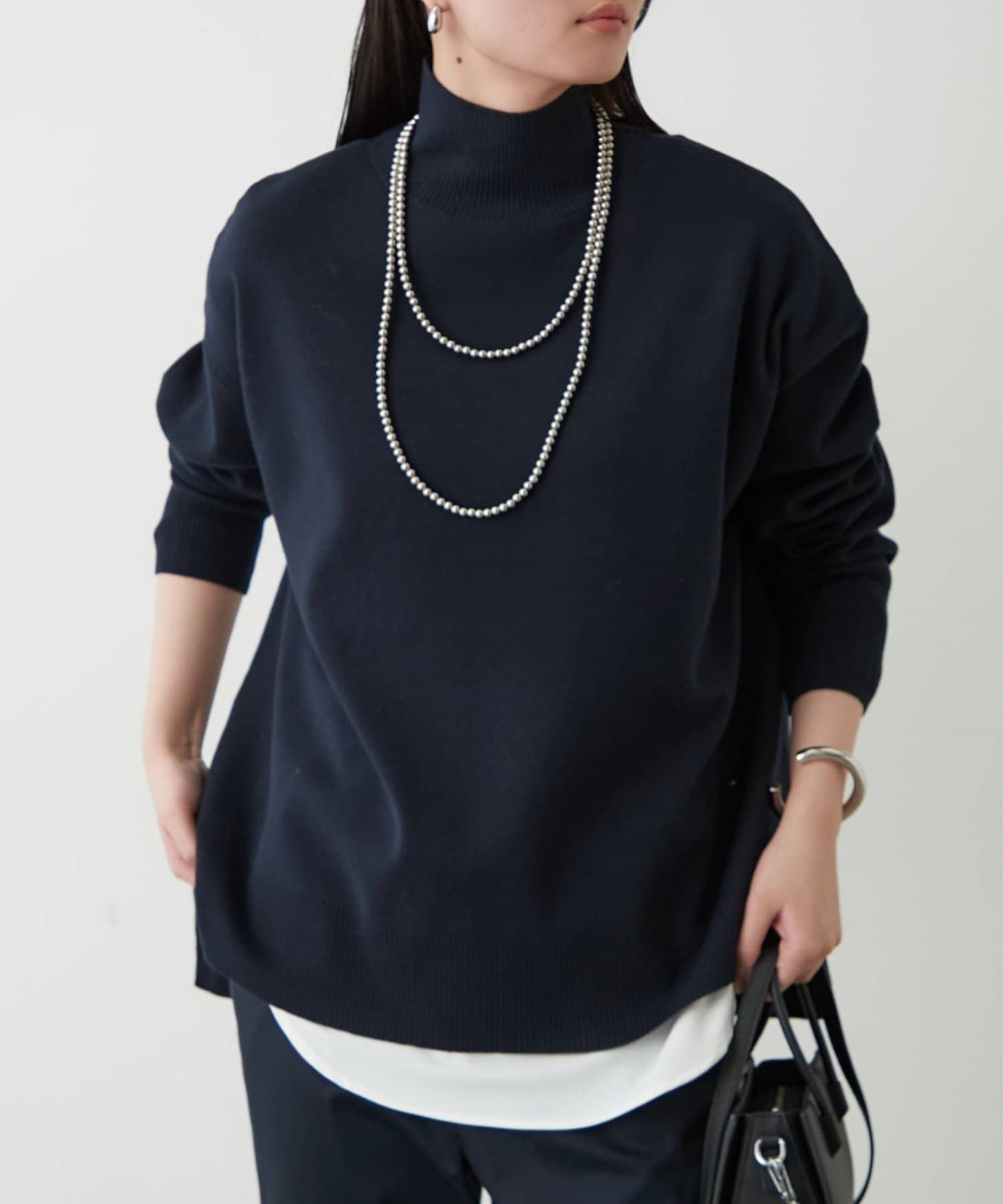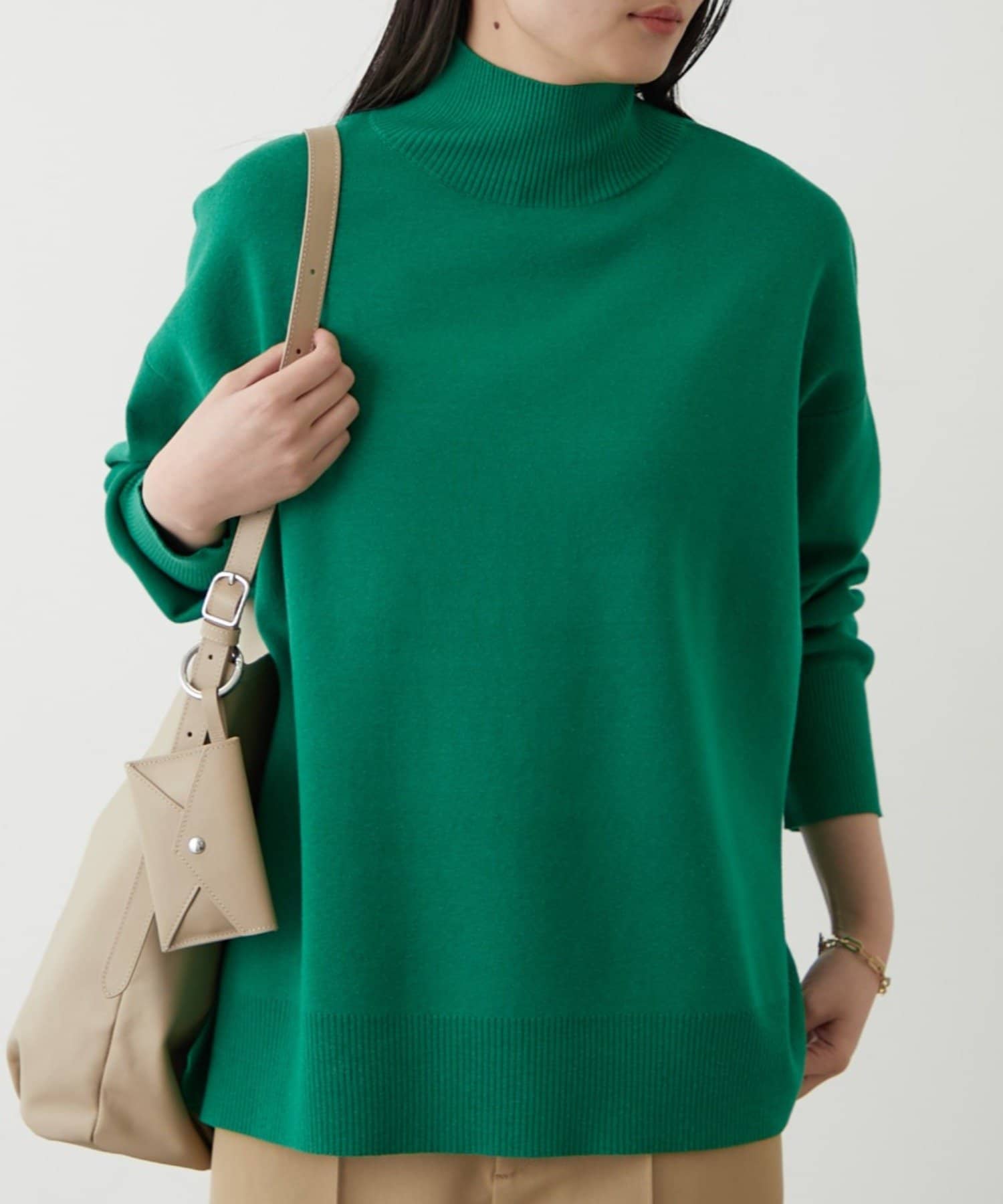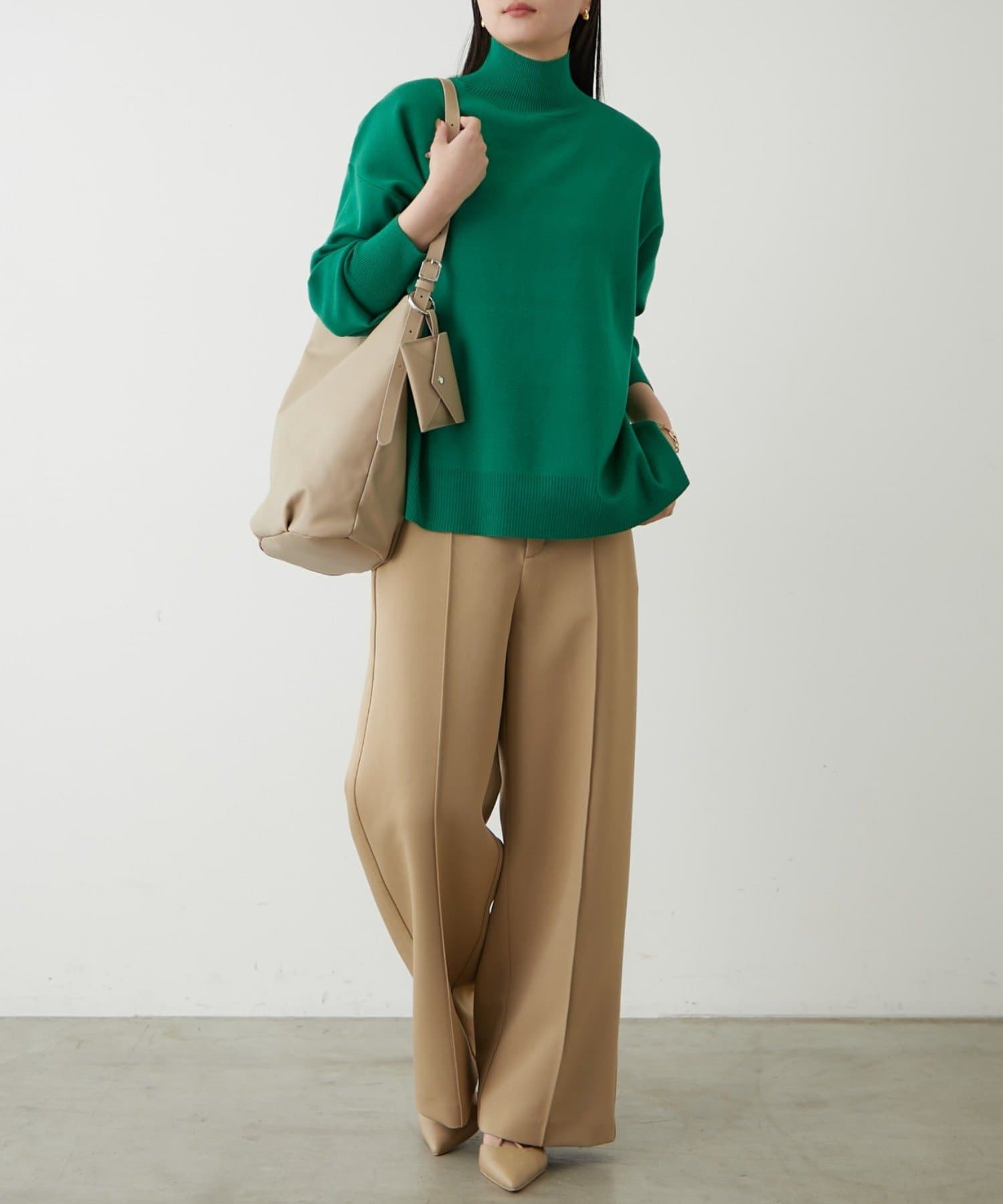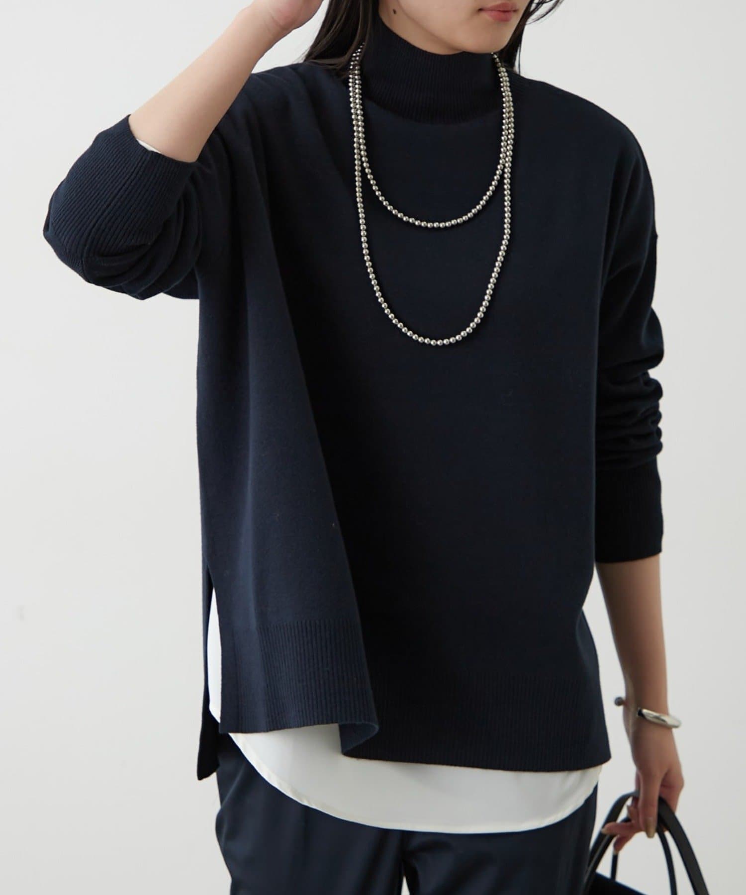 シンプルで、どんなボトムスとも合わせやすいハイネックニット。
