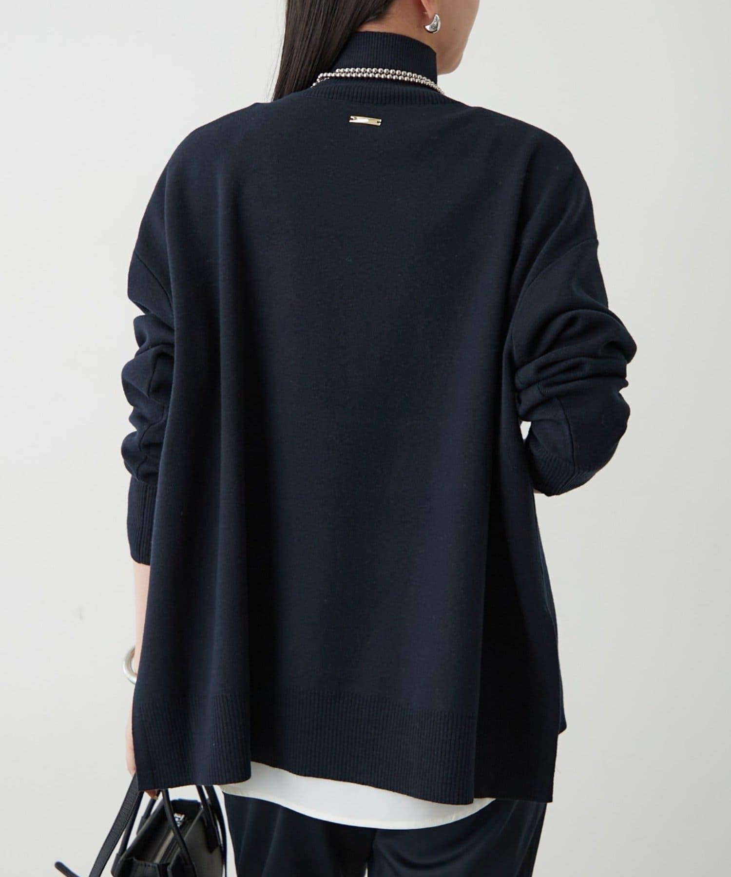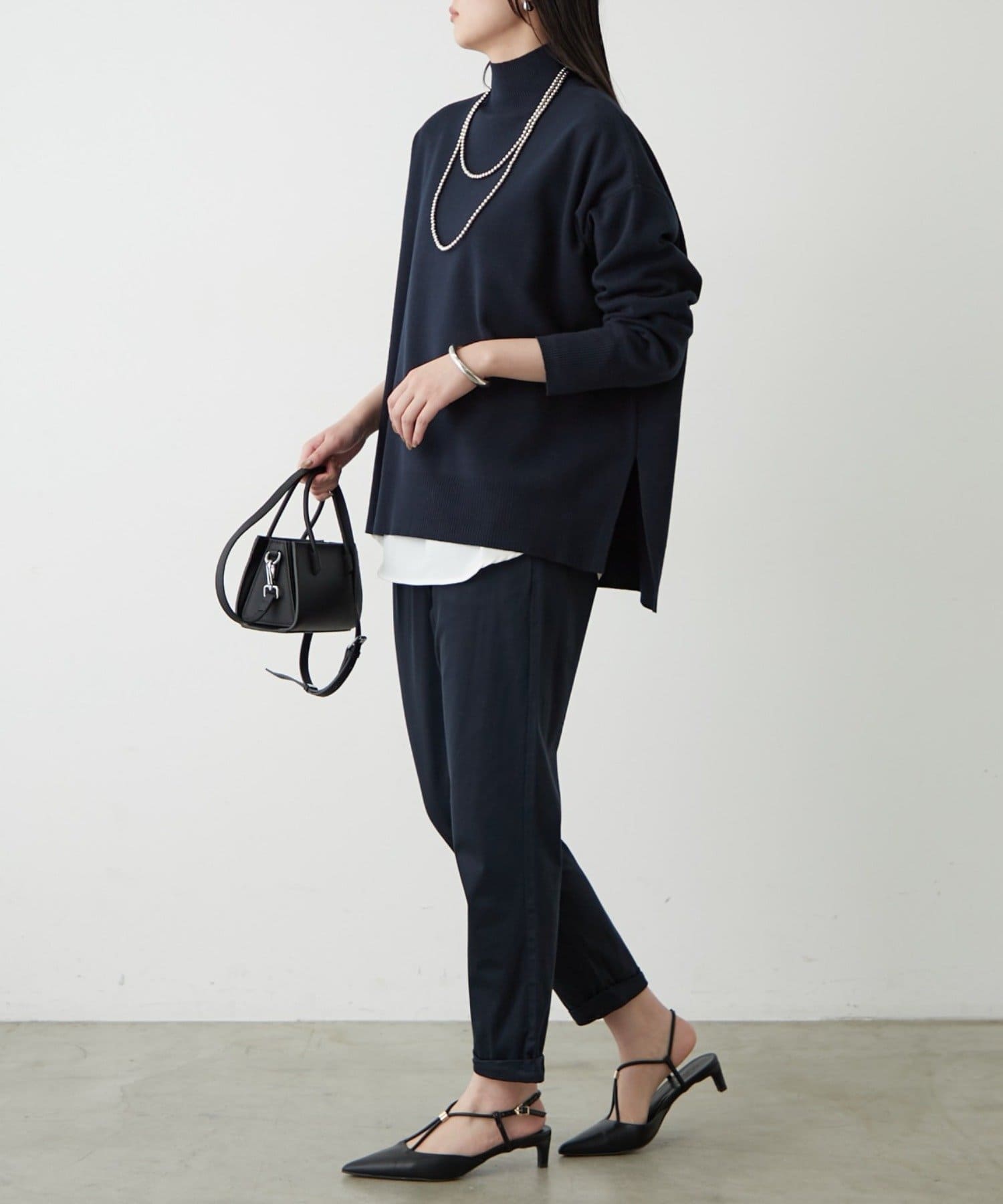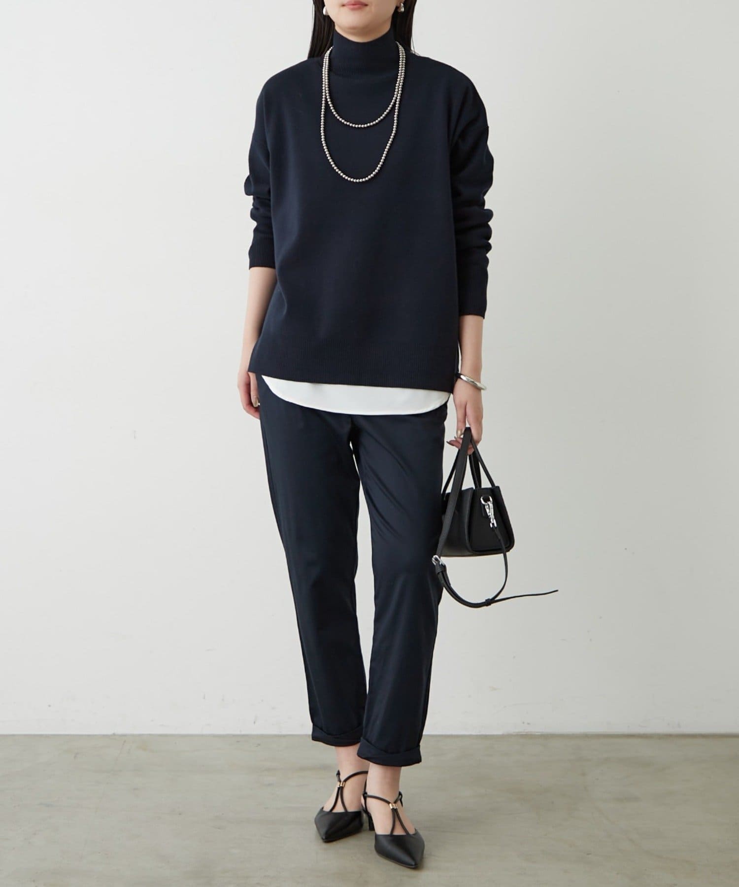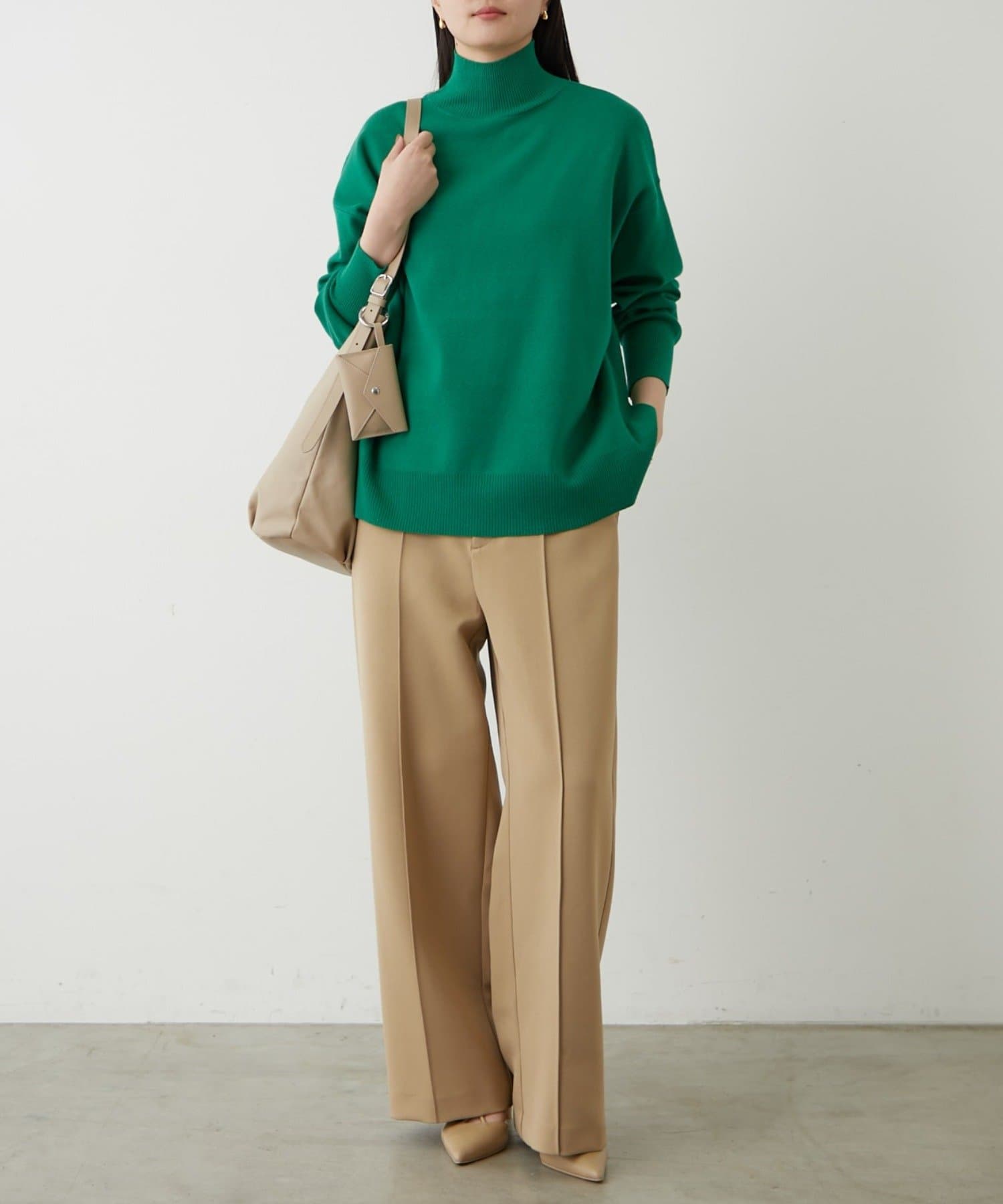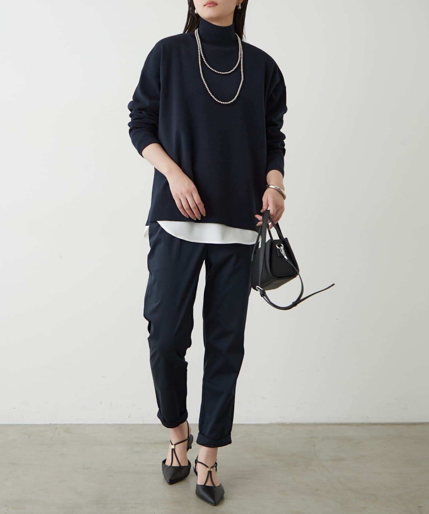 シンプルで、どんなボトムスとも合わせやすいハイネックニット。