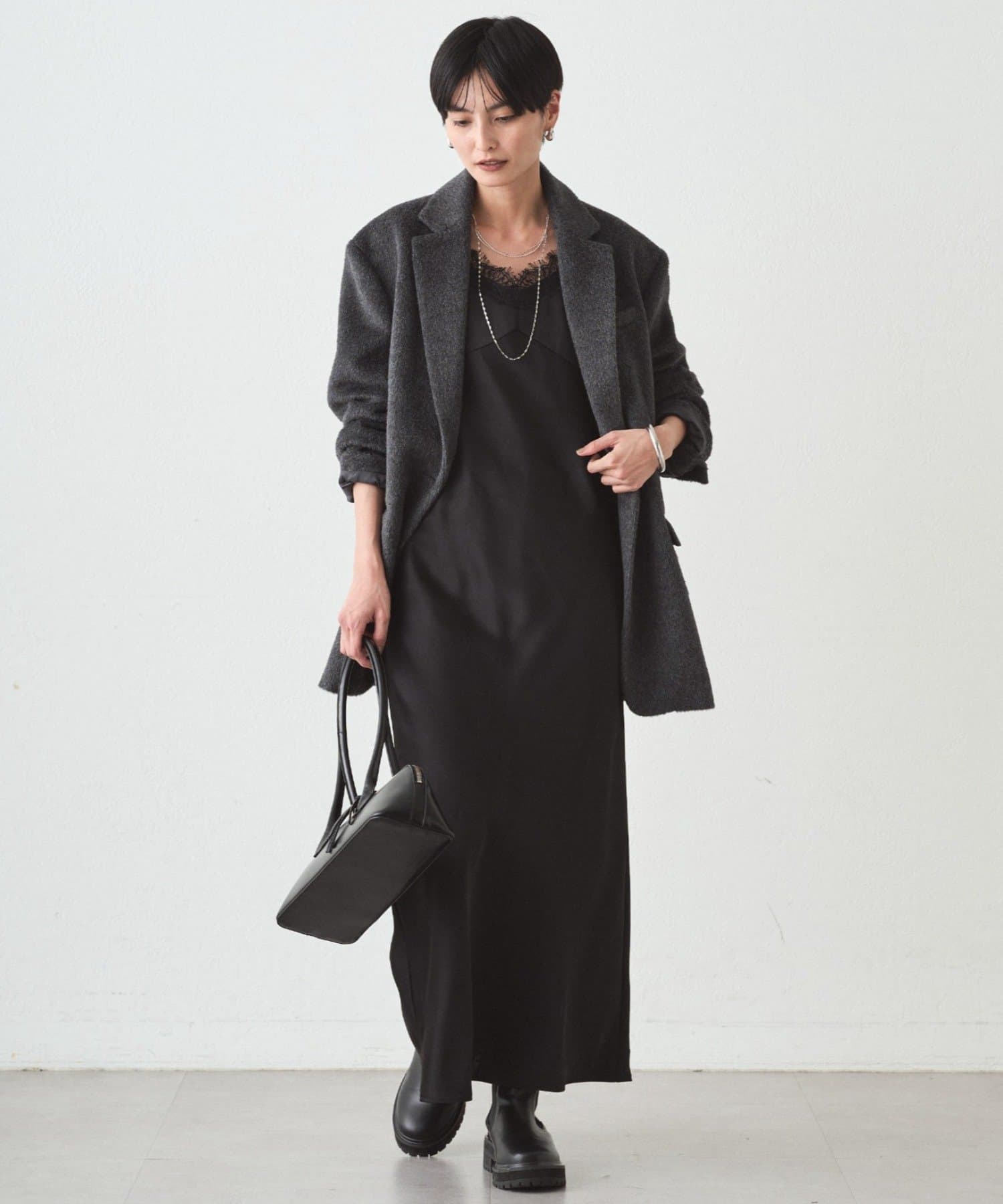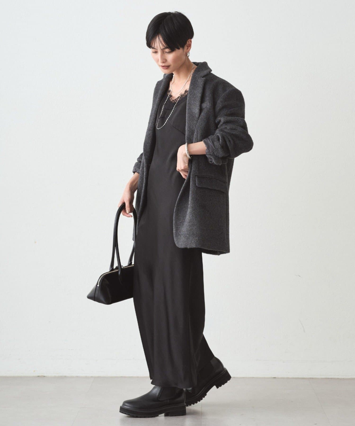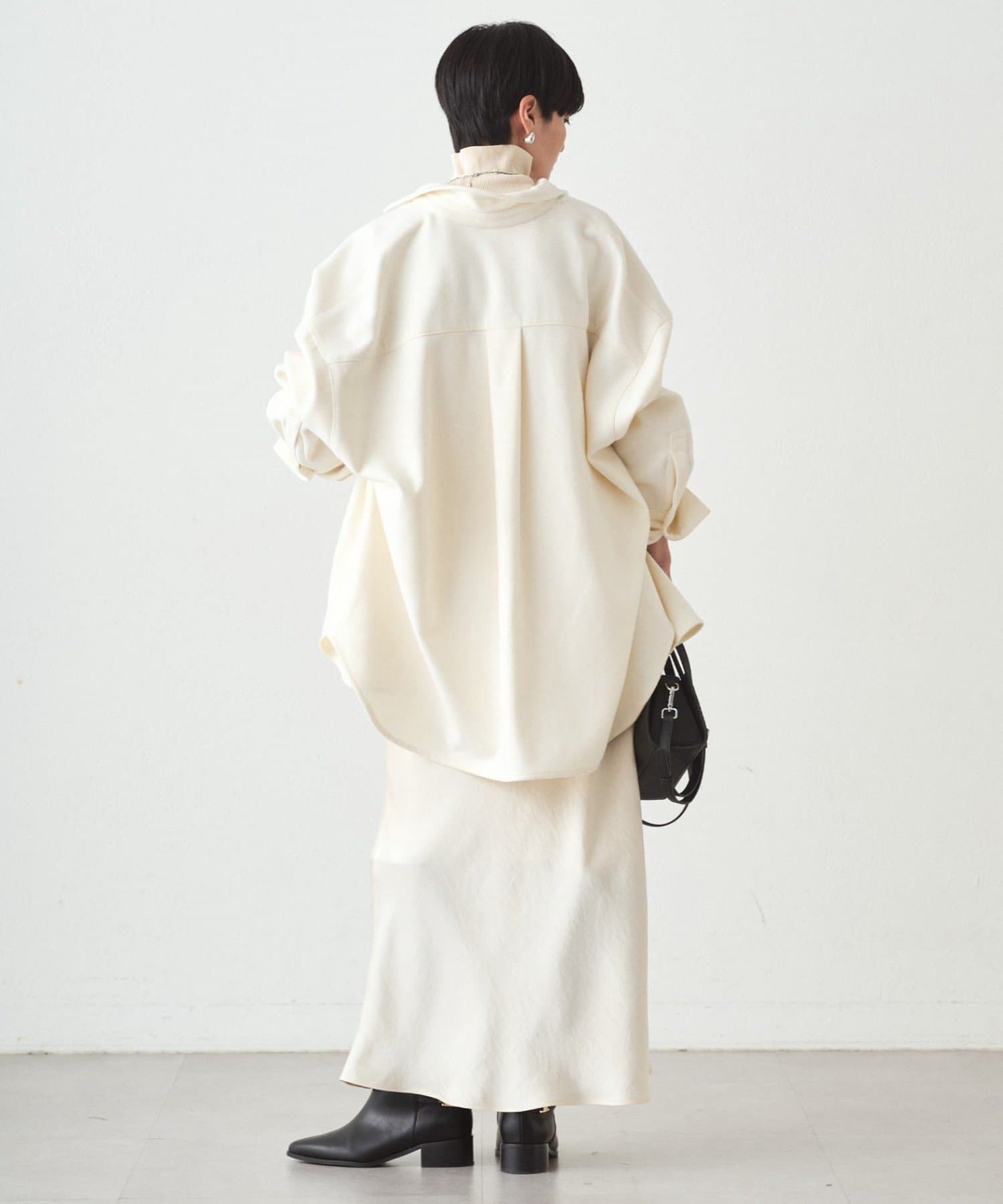 長めの丈感で気になる部分をさりげなくカバーしつつ、縦のラインを強調してスタイルアップも。