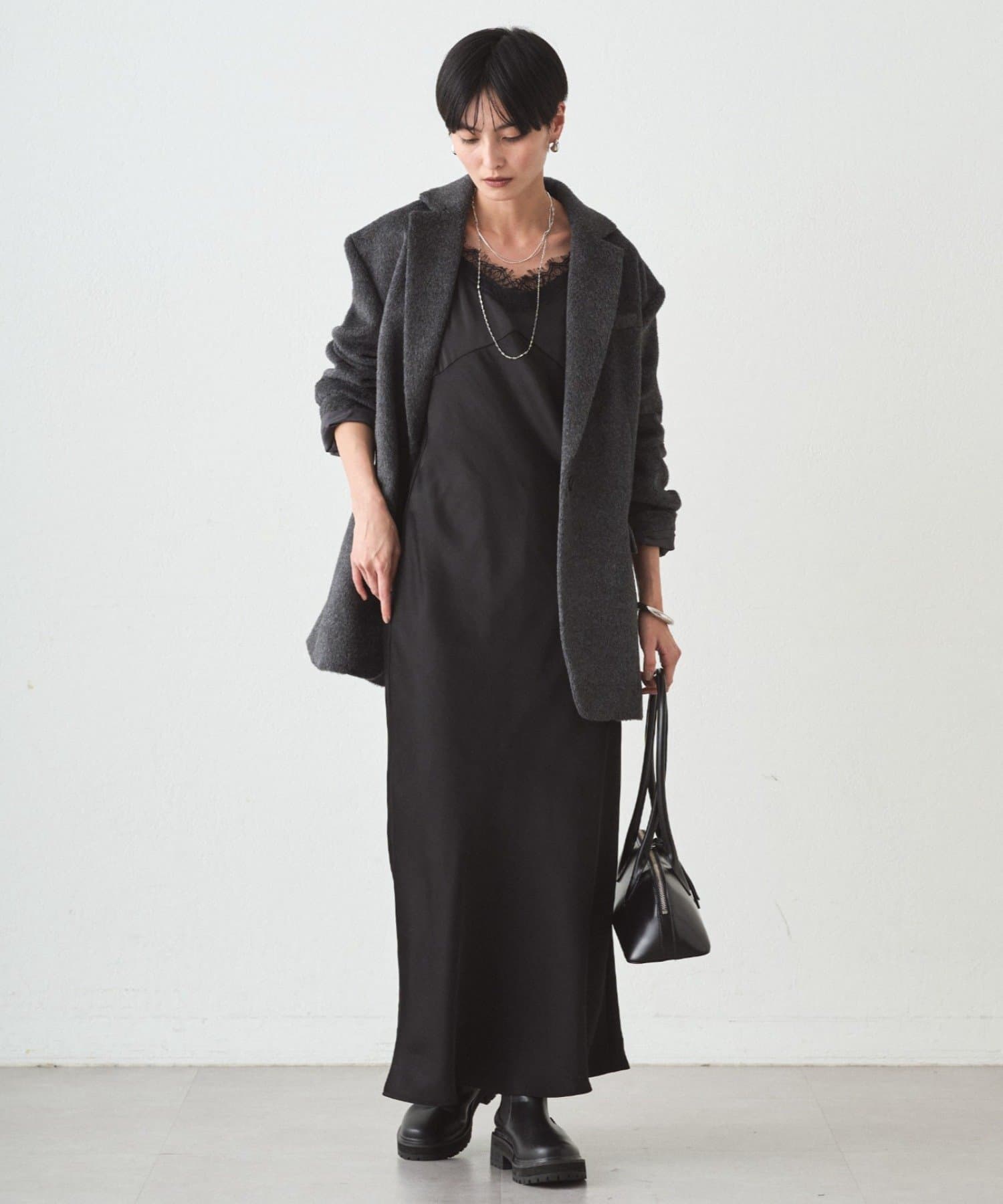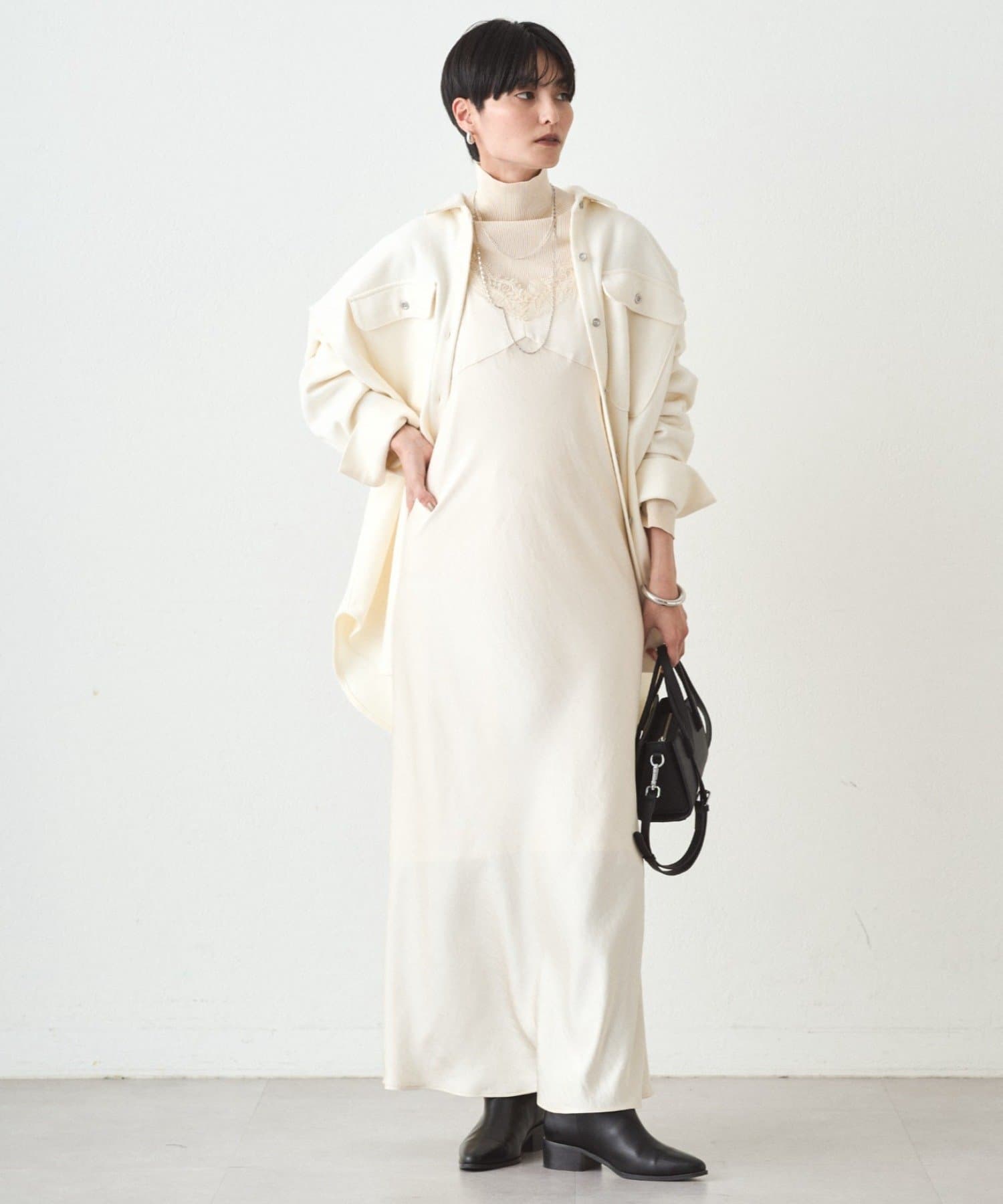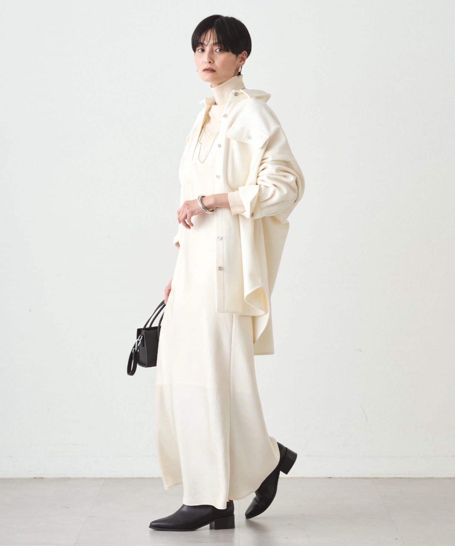 長めの丈感で気になる部分をさりげなくカバーしつつ、縦のラインを強調してスタイルアップも。