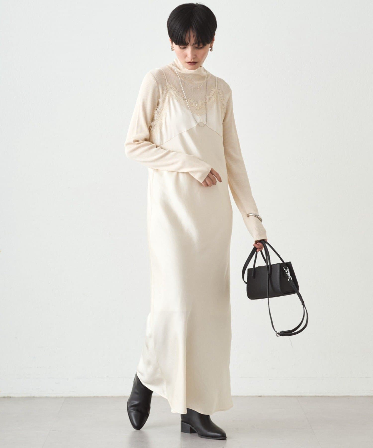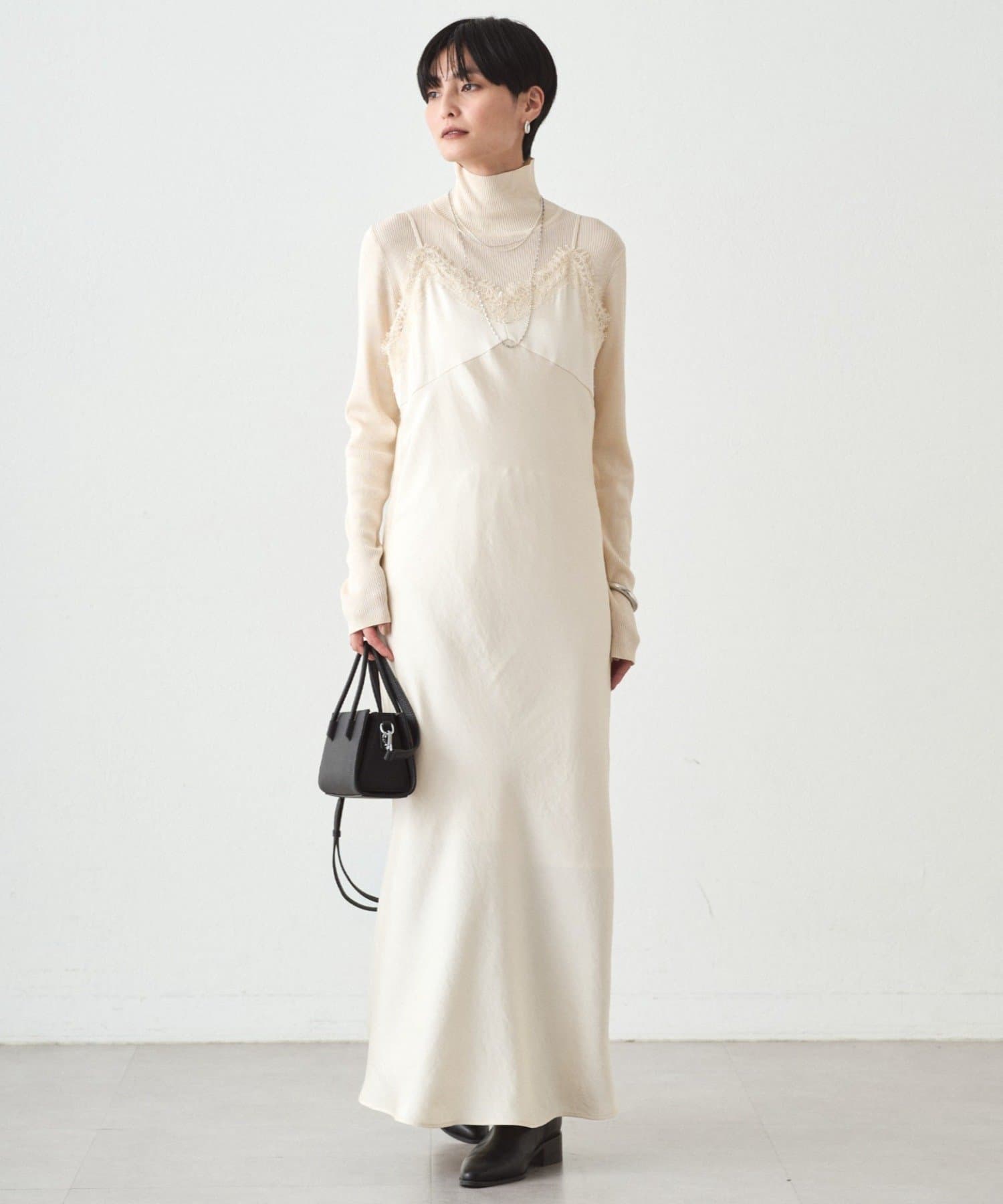 頑張りすぎず、上品に決まるレースキャミワンピース。
