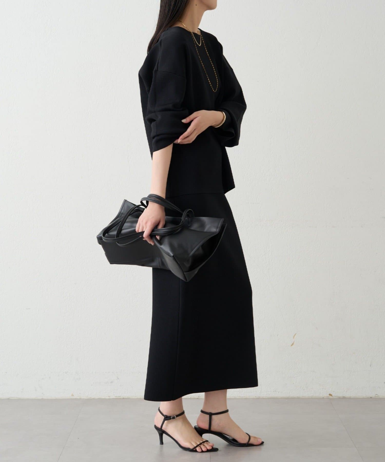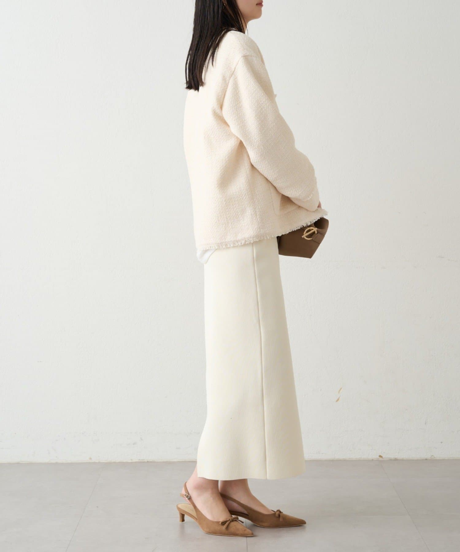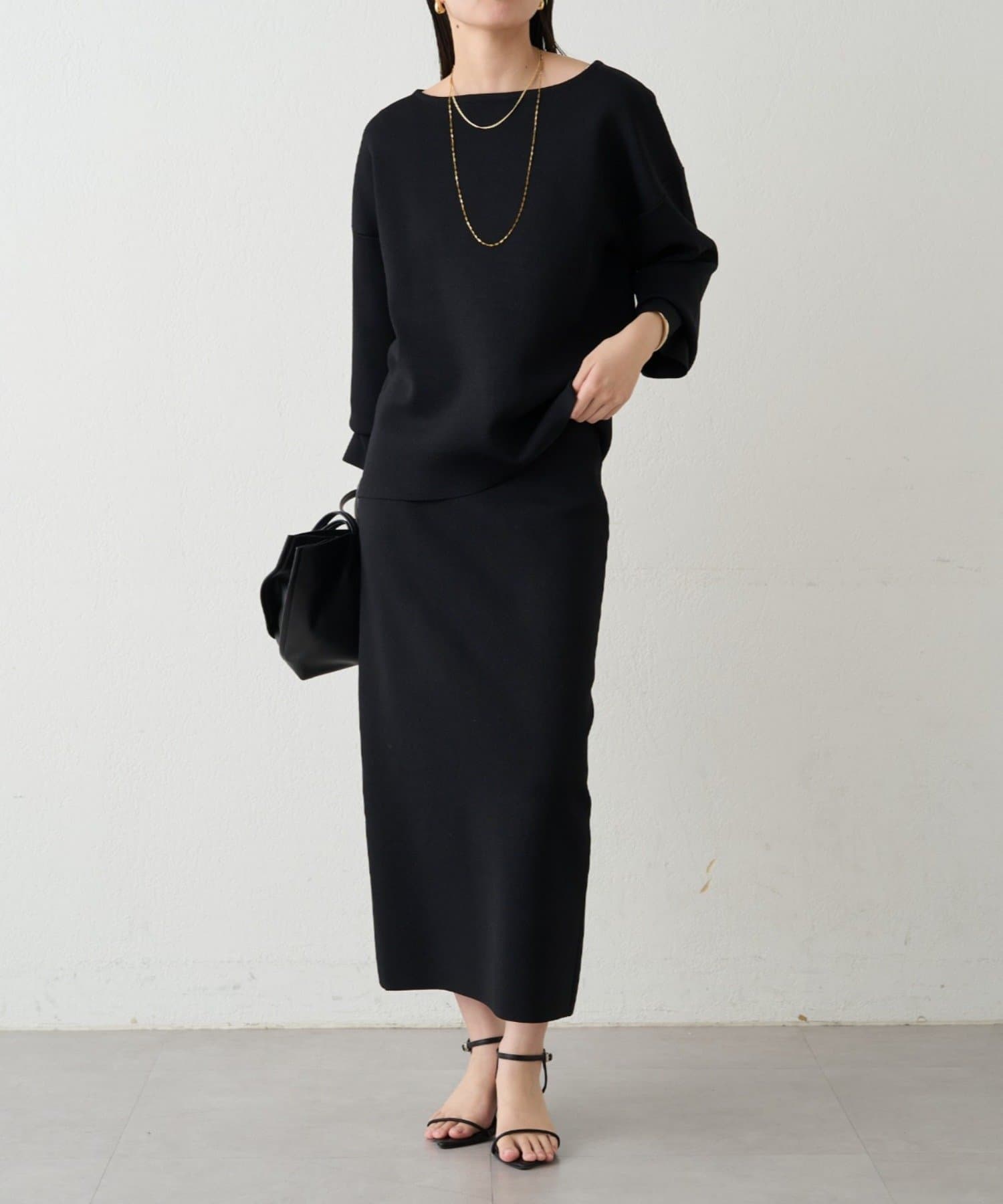 総シリーズのスムースボートネックニットとのセットアップもおすすめです。