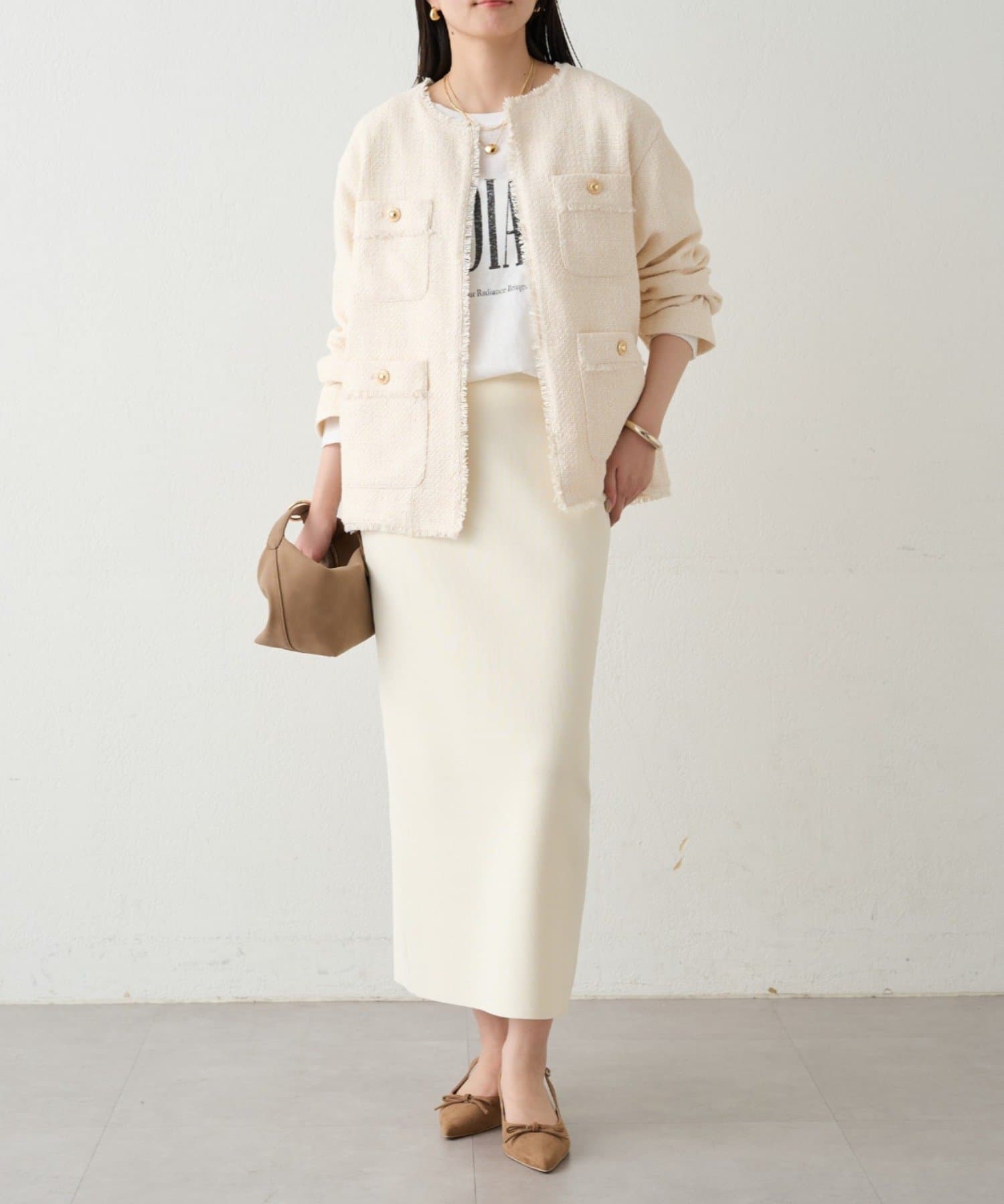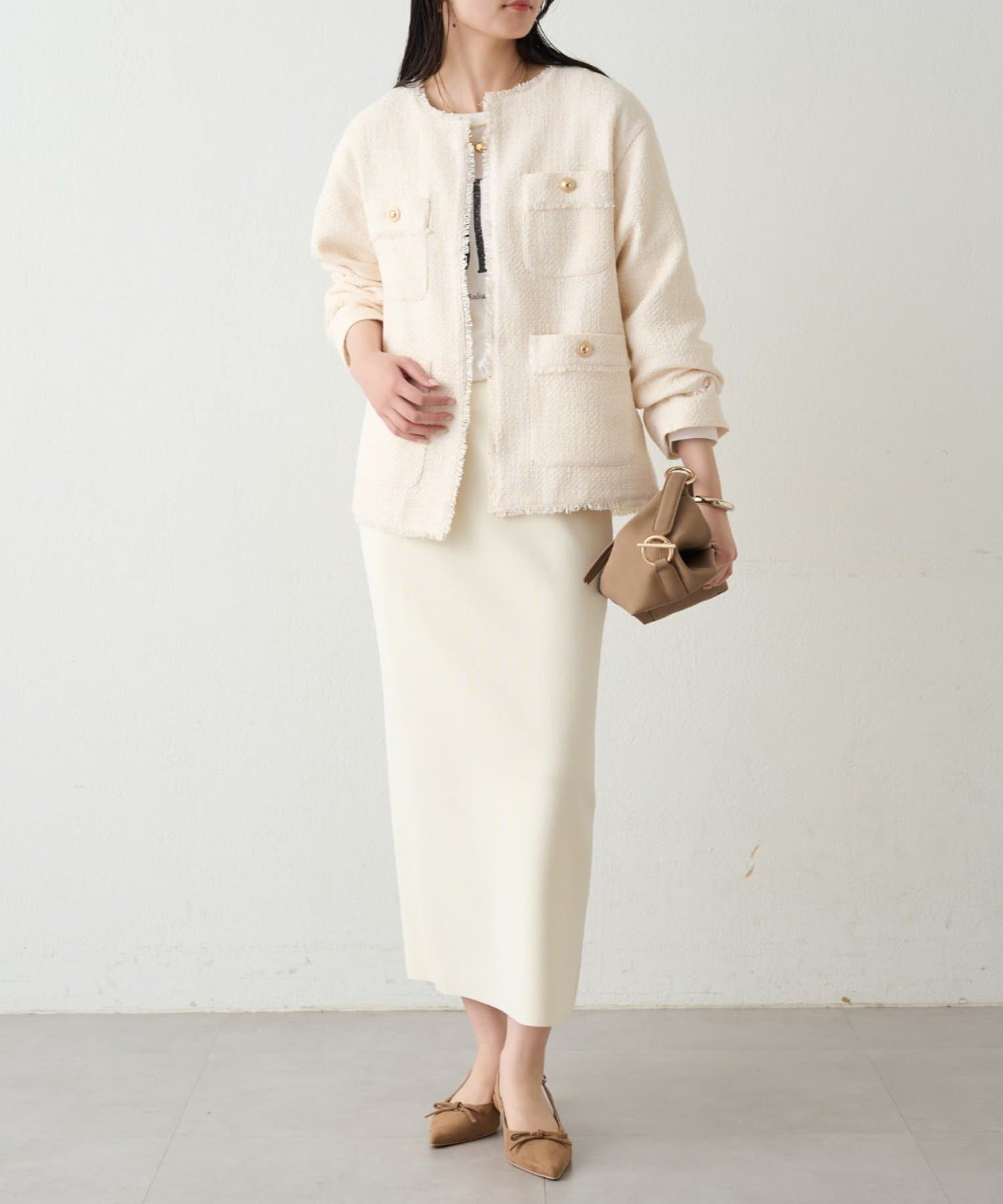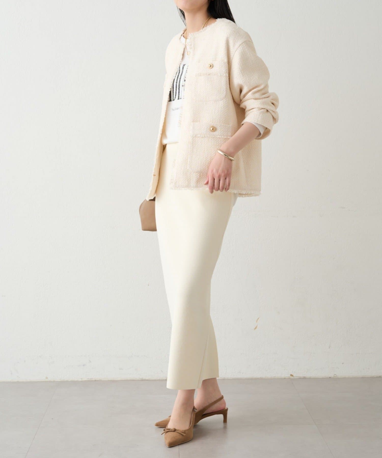 総シリーズのスムースボートネックニットとのセットアップもおすすめです。