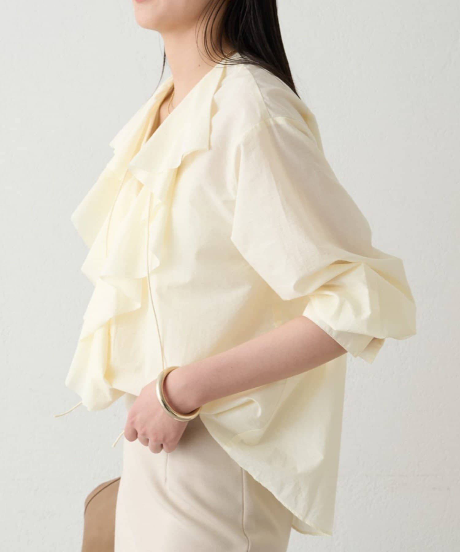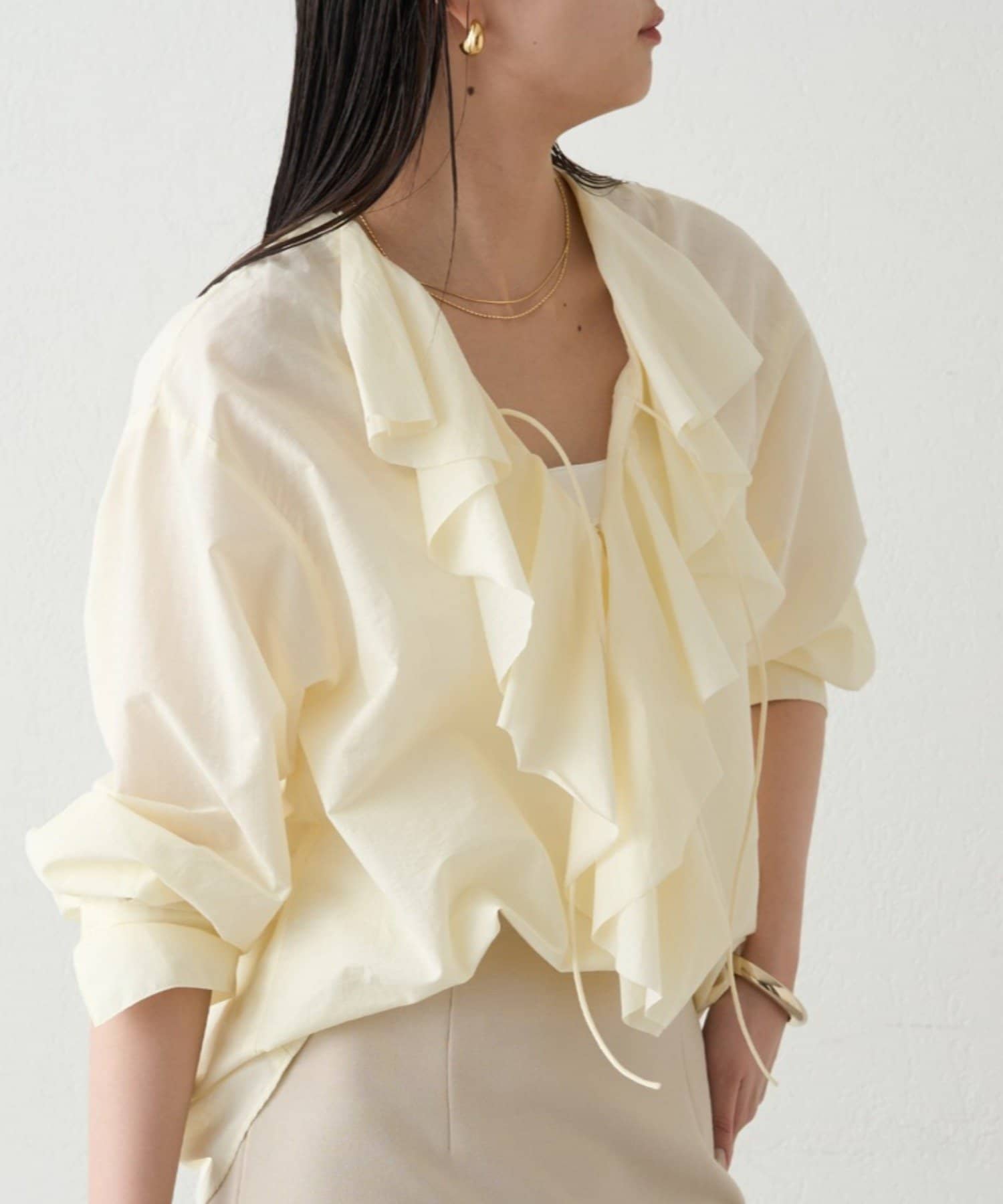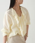 目を引く大胆なフリルが、顔まわりを華やかに彩るブラウス。