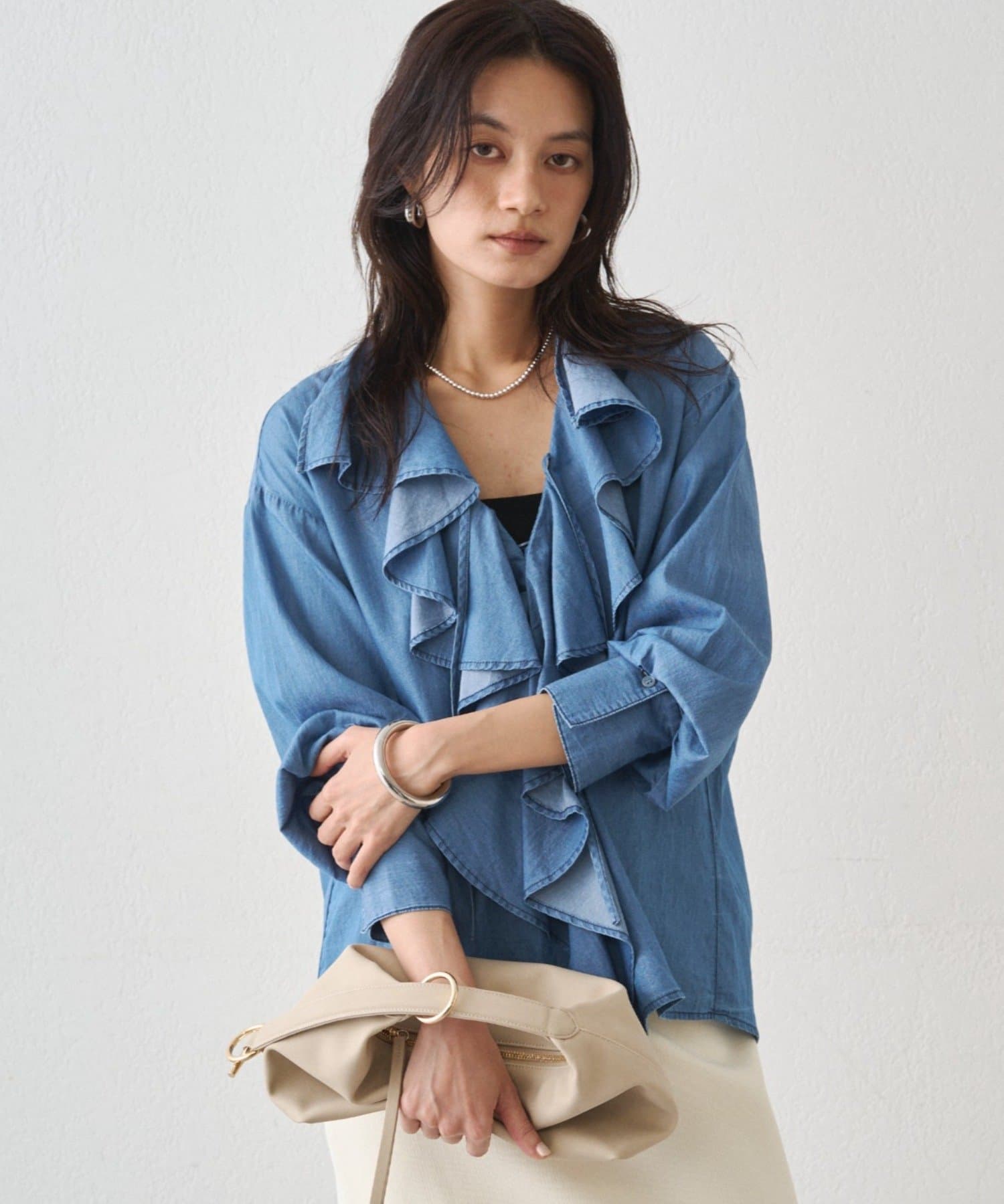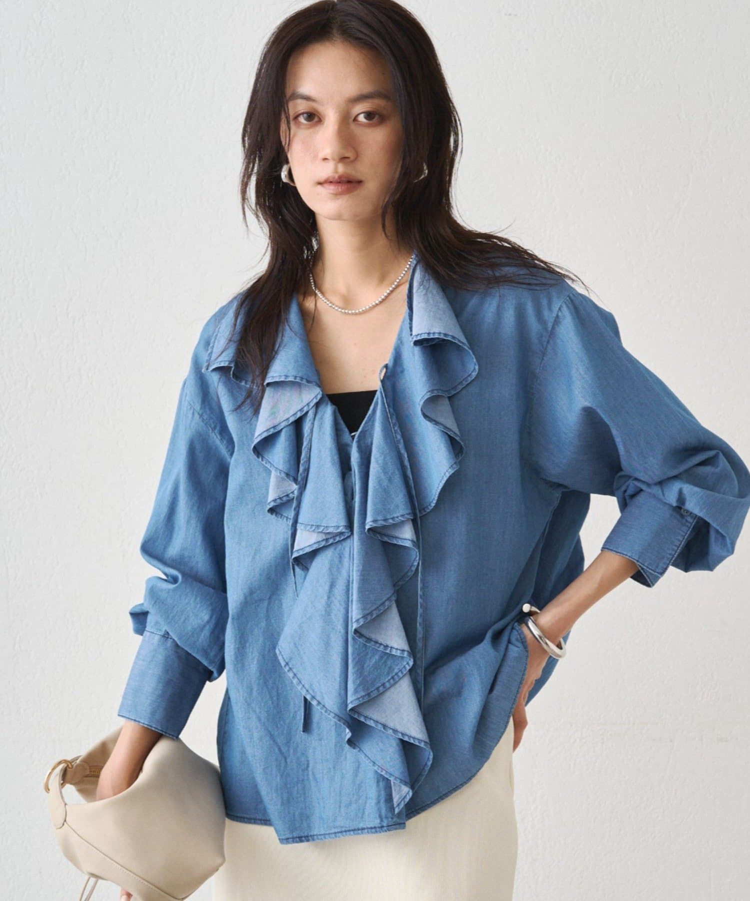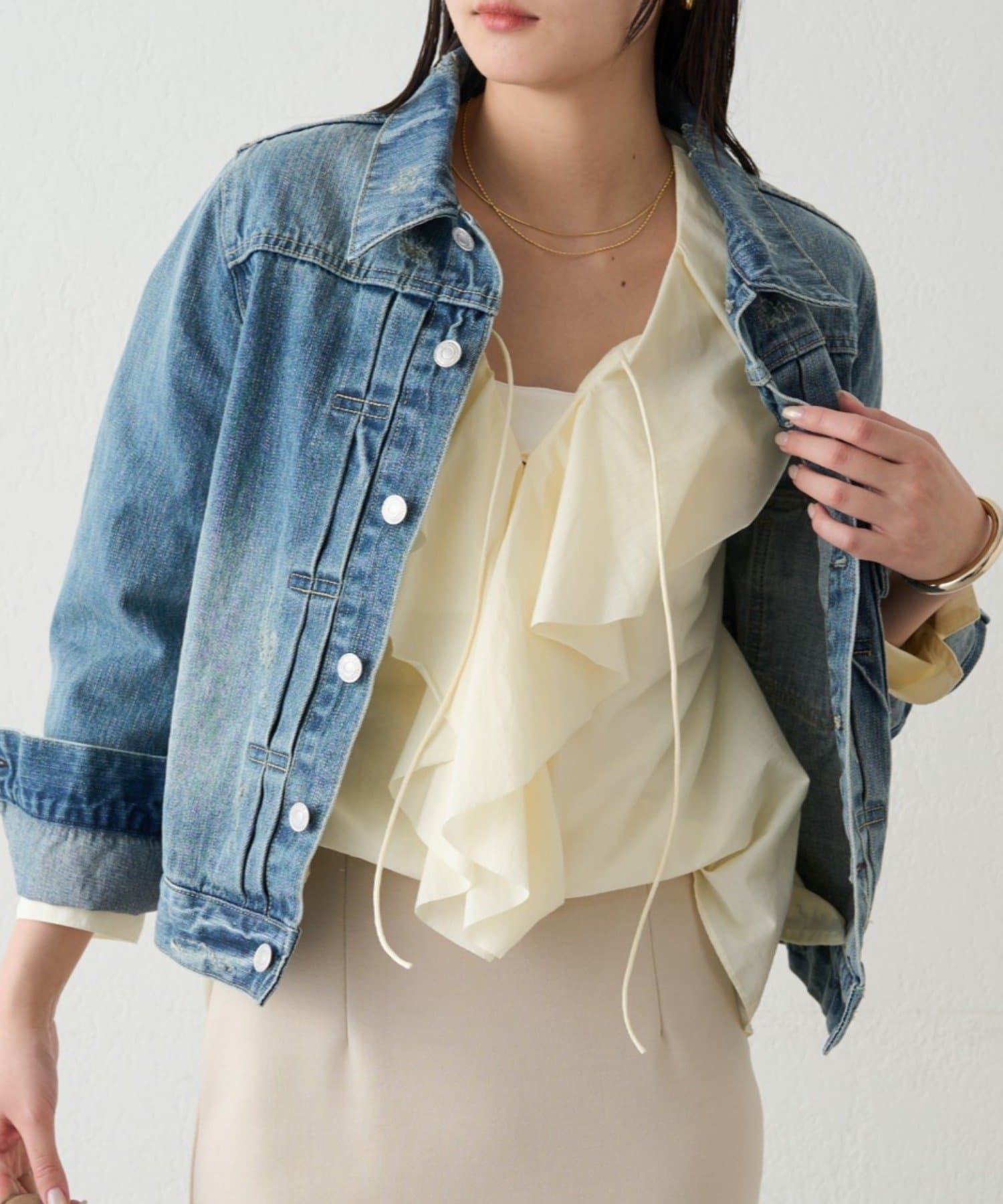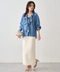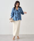 デニムやワイドパンツと合わせればブラウスの甘さを抑え、こなれ感のある大人カジュアルスタイルに。