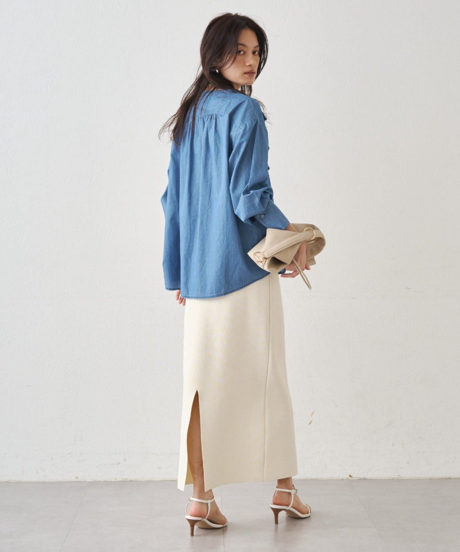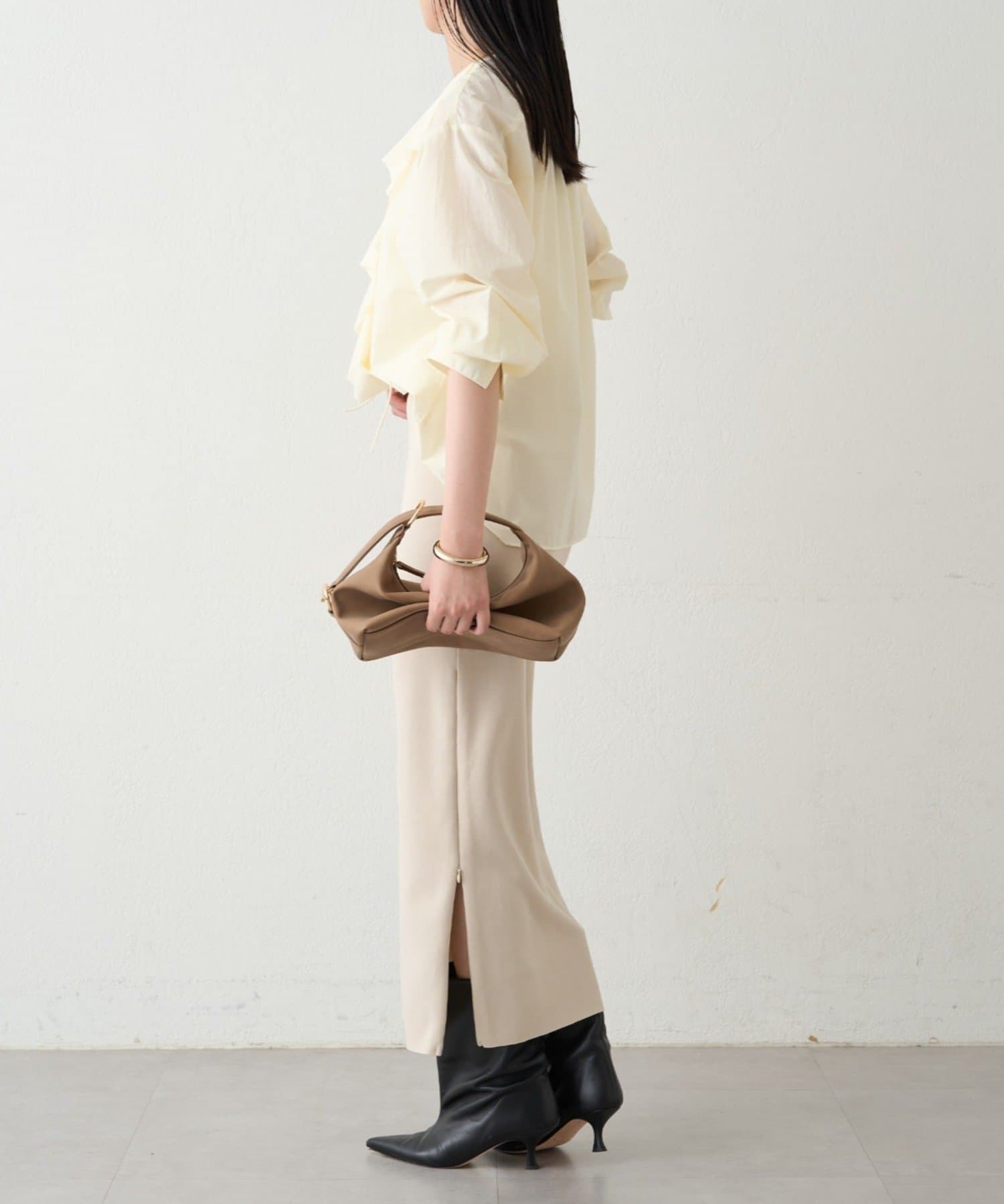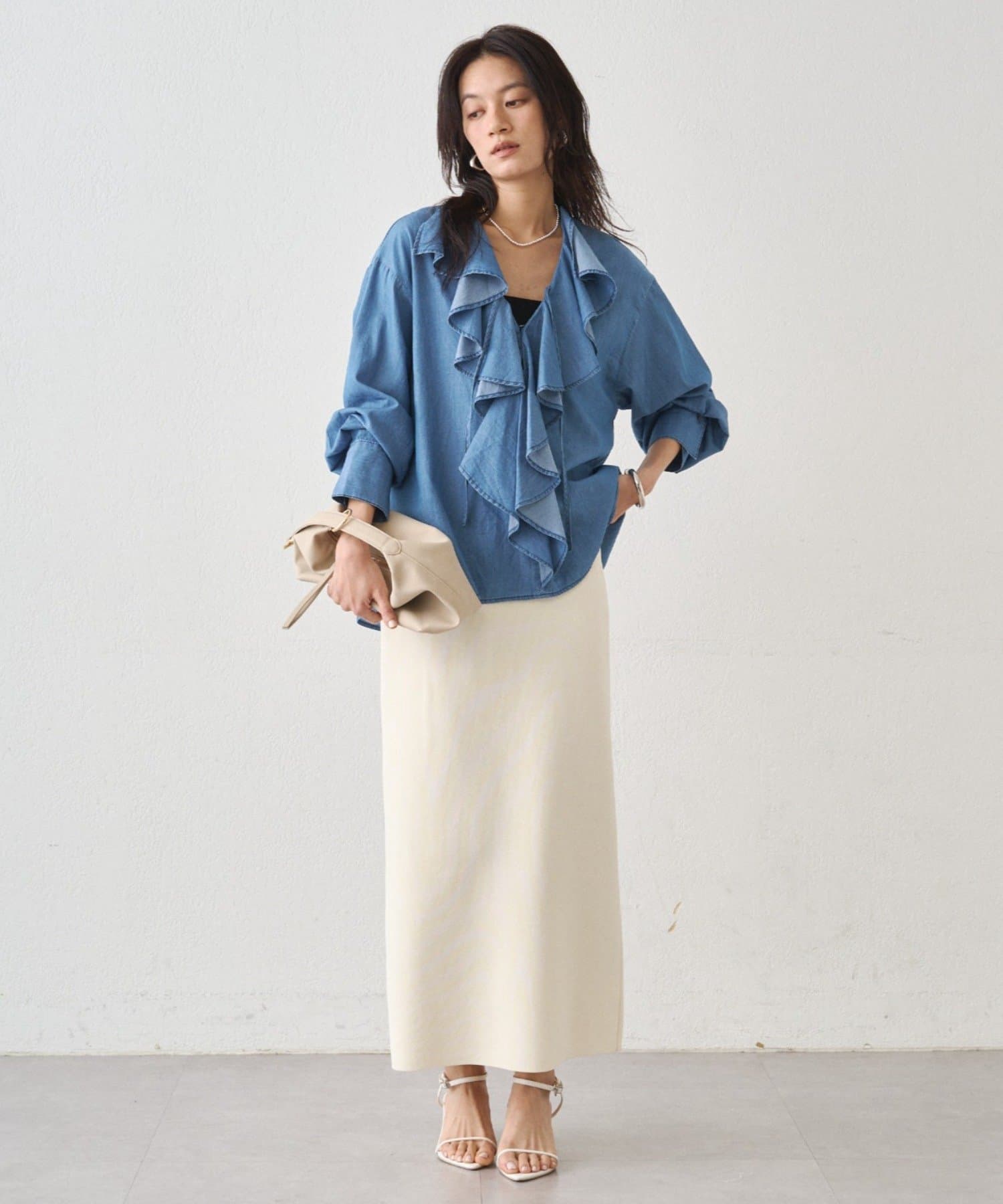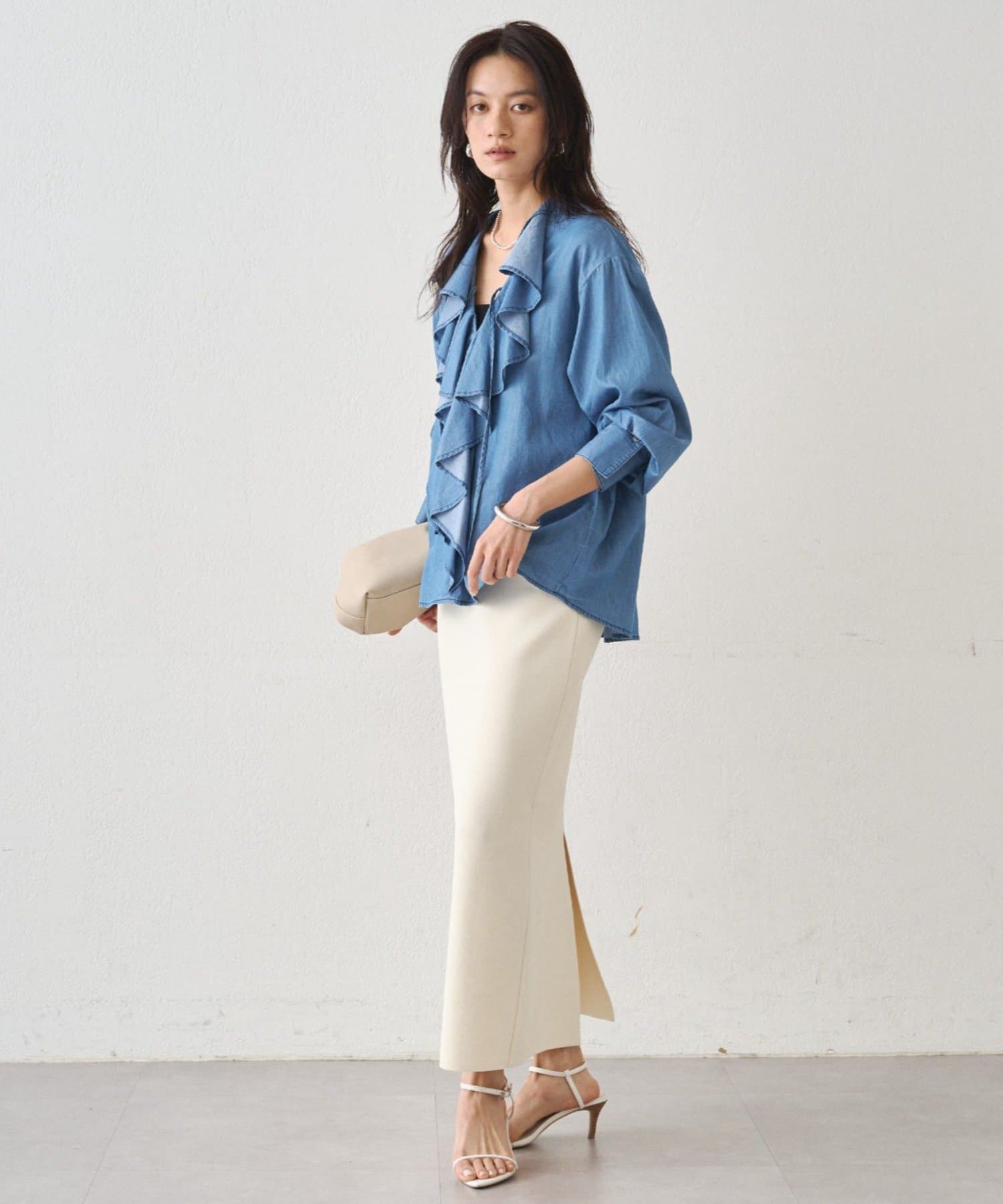 デニムやワイドパンツと合わせればブラウスの甘さを抑え、こなれ感のある大人カジュアルスタイルに。