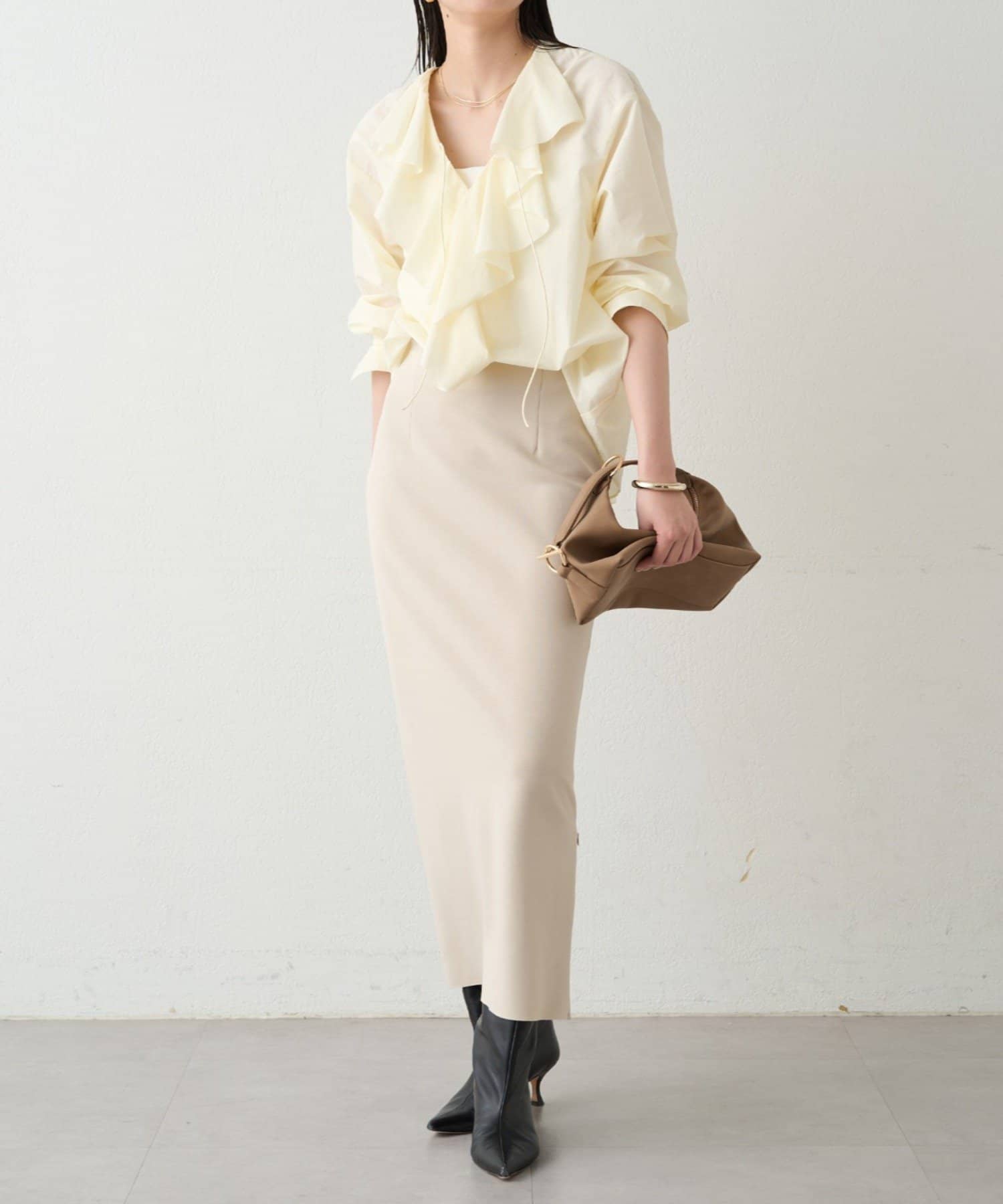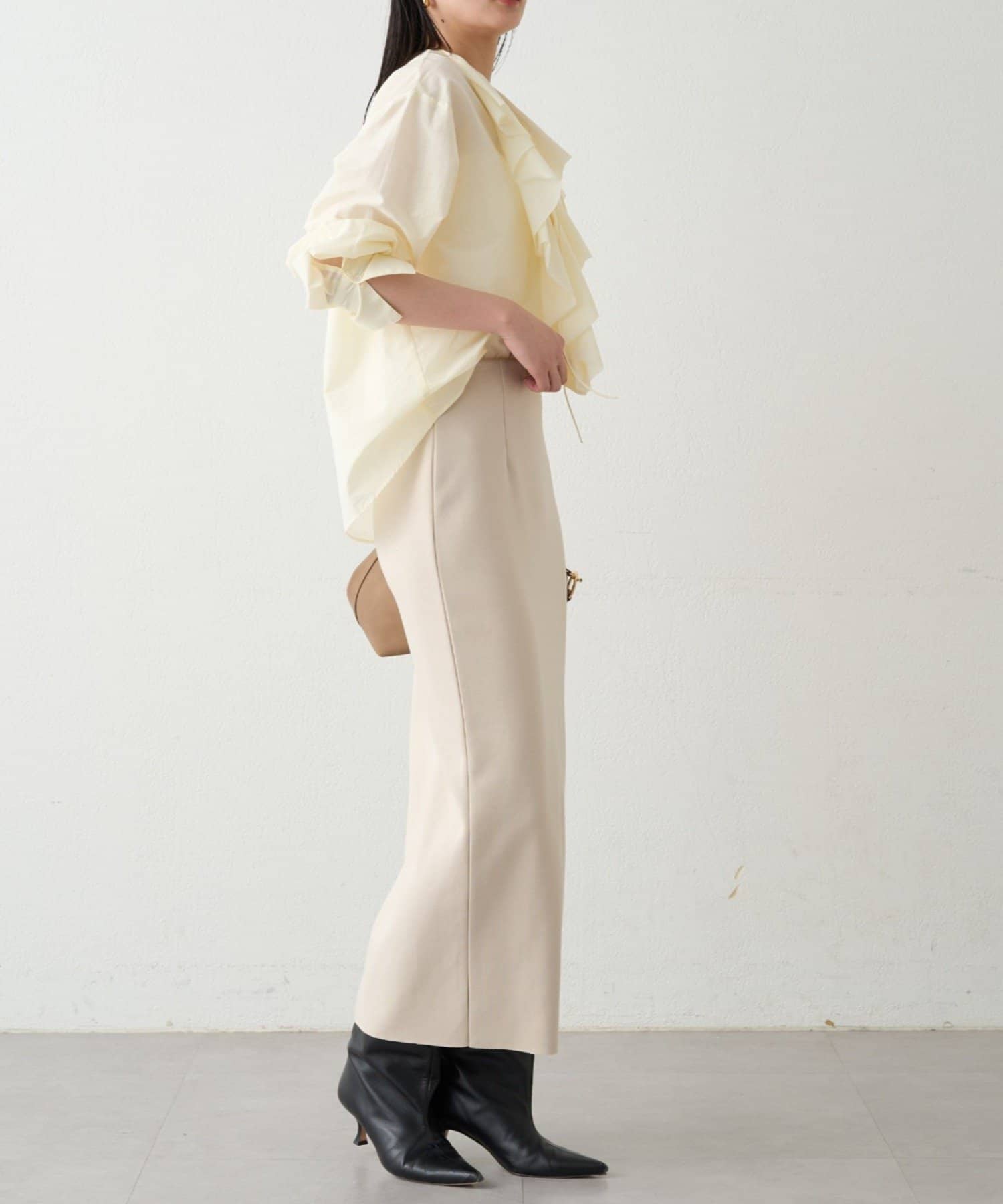 胸元のフリルをワンポイントに、ジャケットのインナーにもおすすめです。