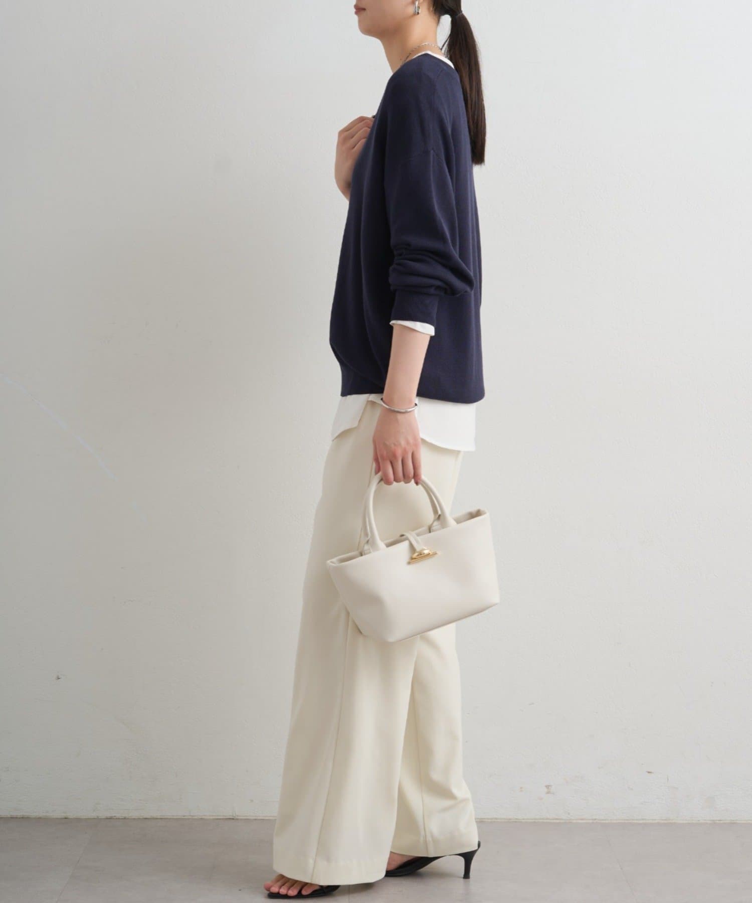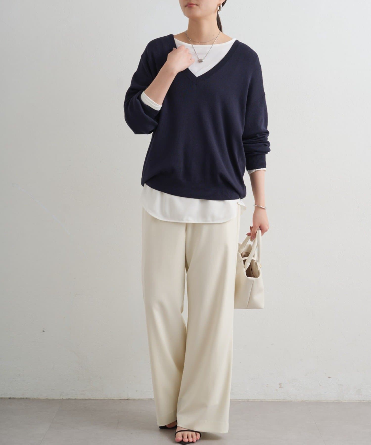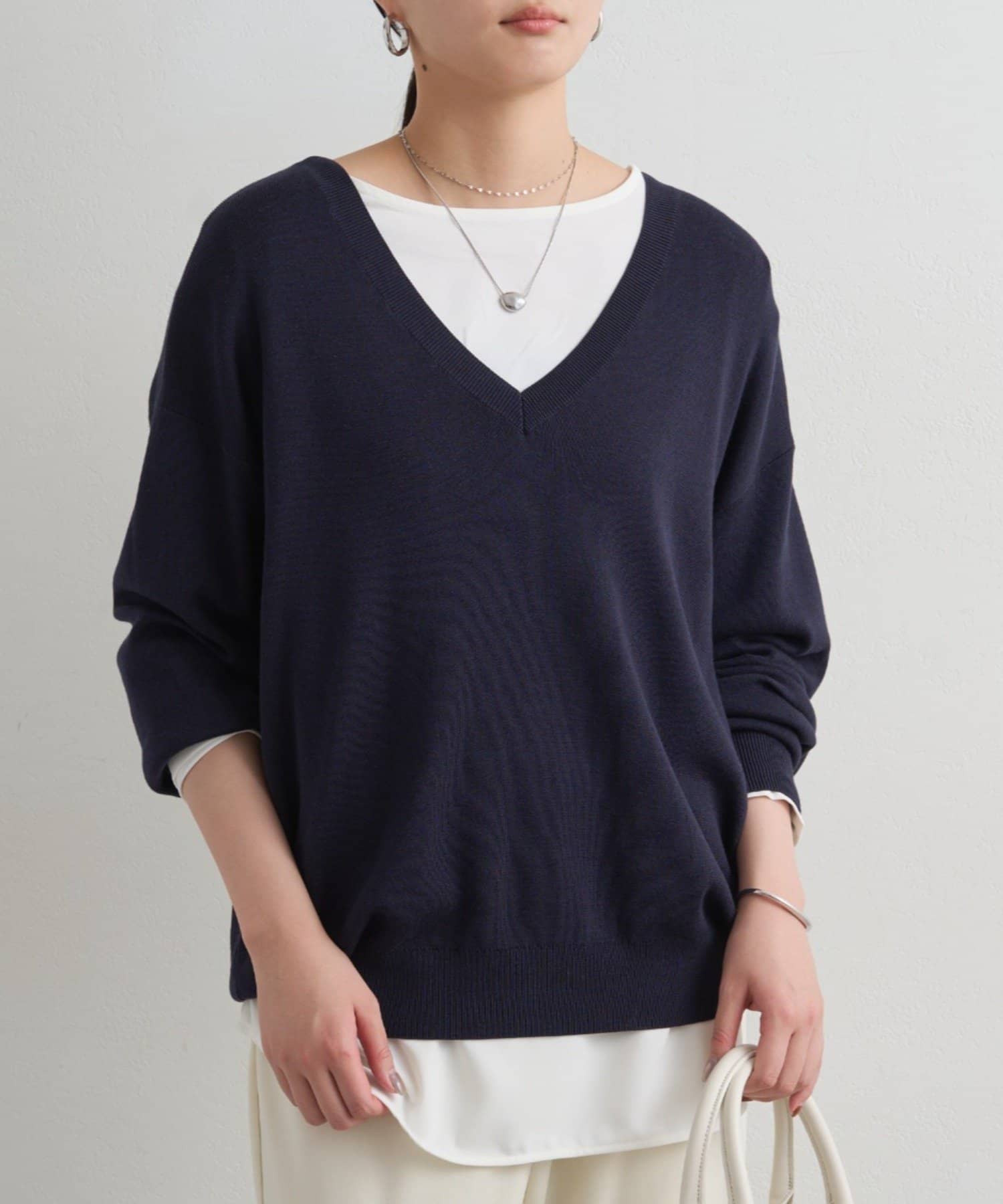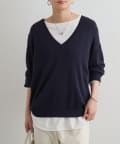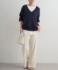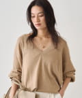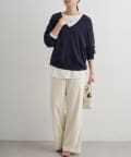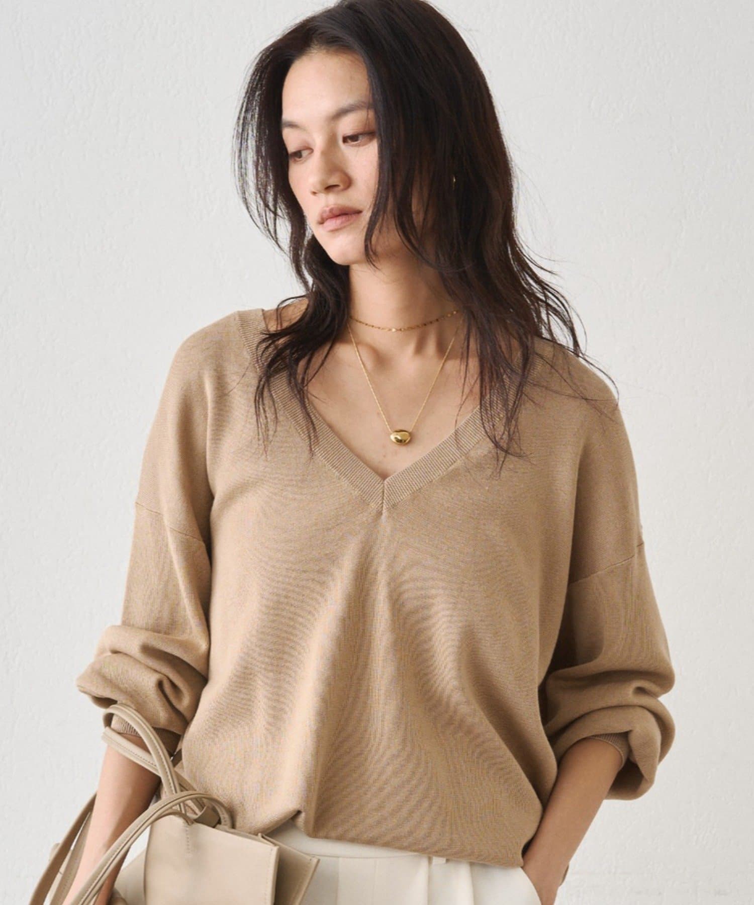 深めに開いたVネックがデコルテを美しく引き立てるニットトップス。