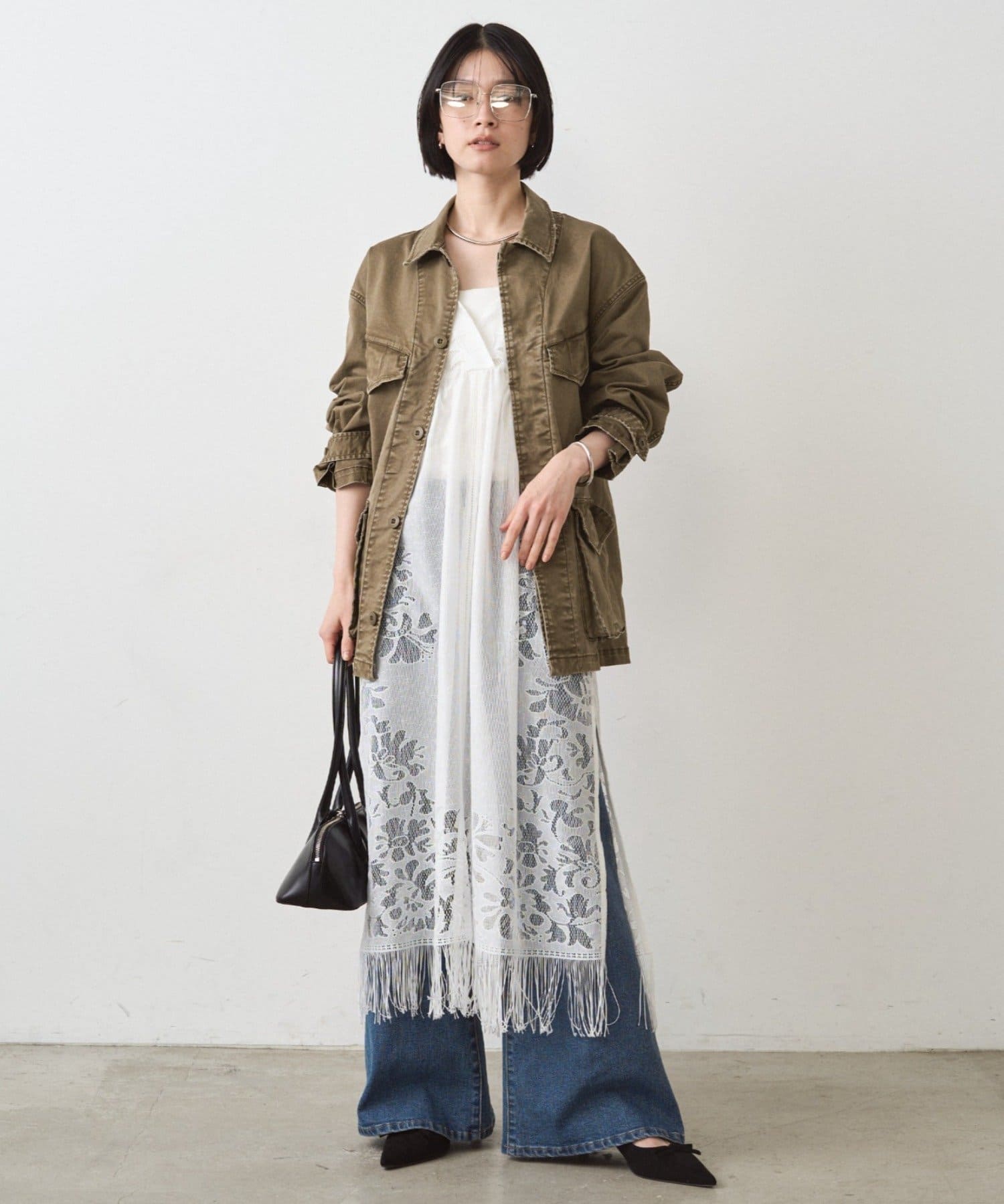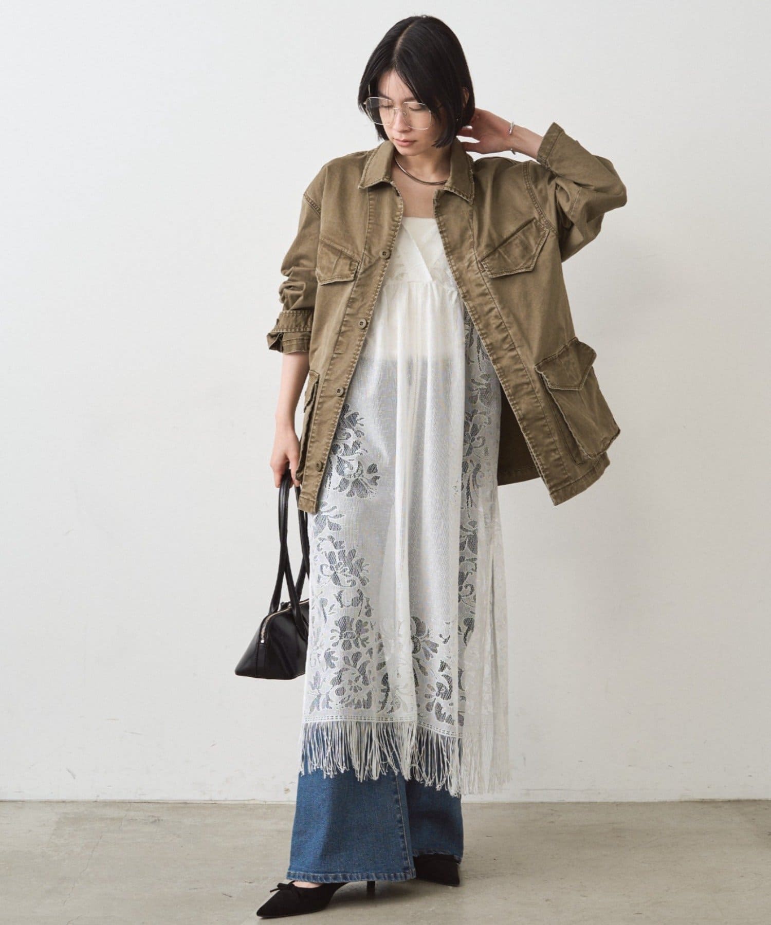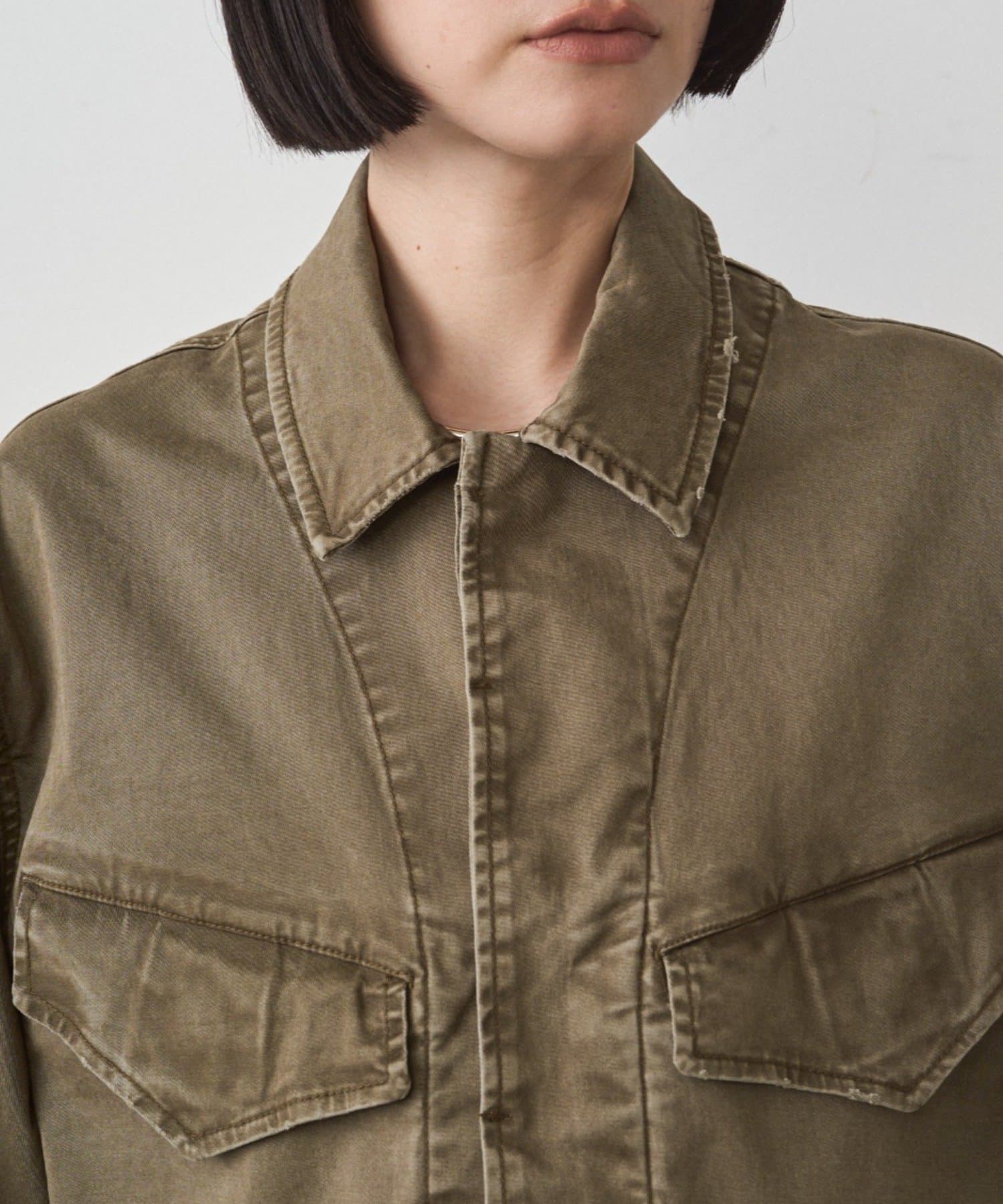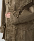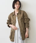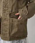 無骨な雰囲気が魅力のミリタリージャケット。深みのあるカーキ色と、使い込まれたような風合いがこなれ感を演出します。