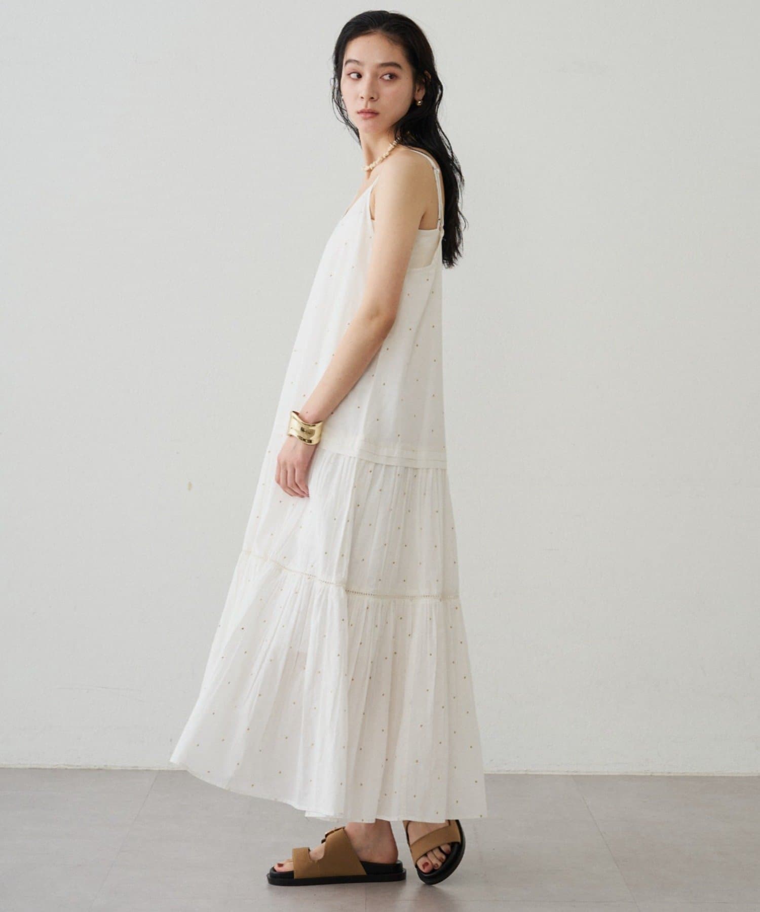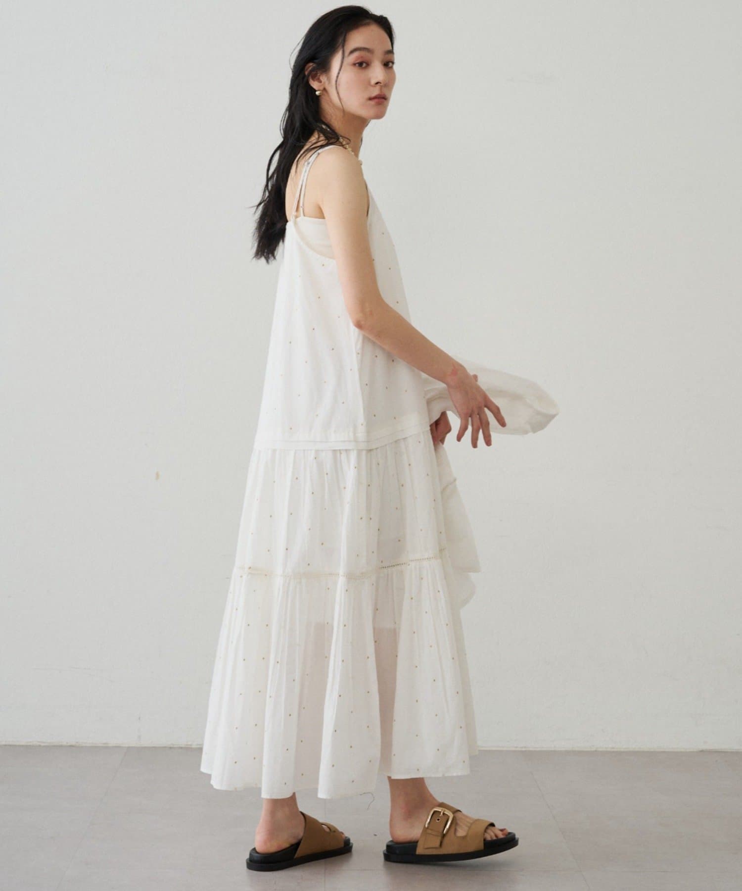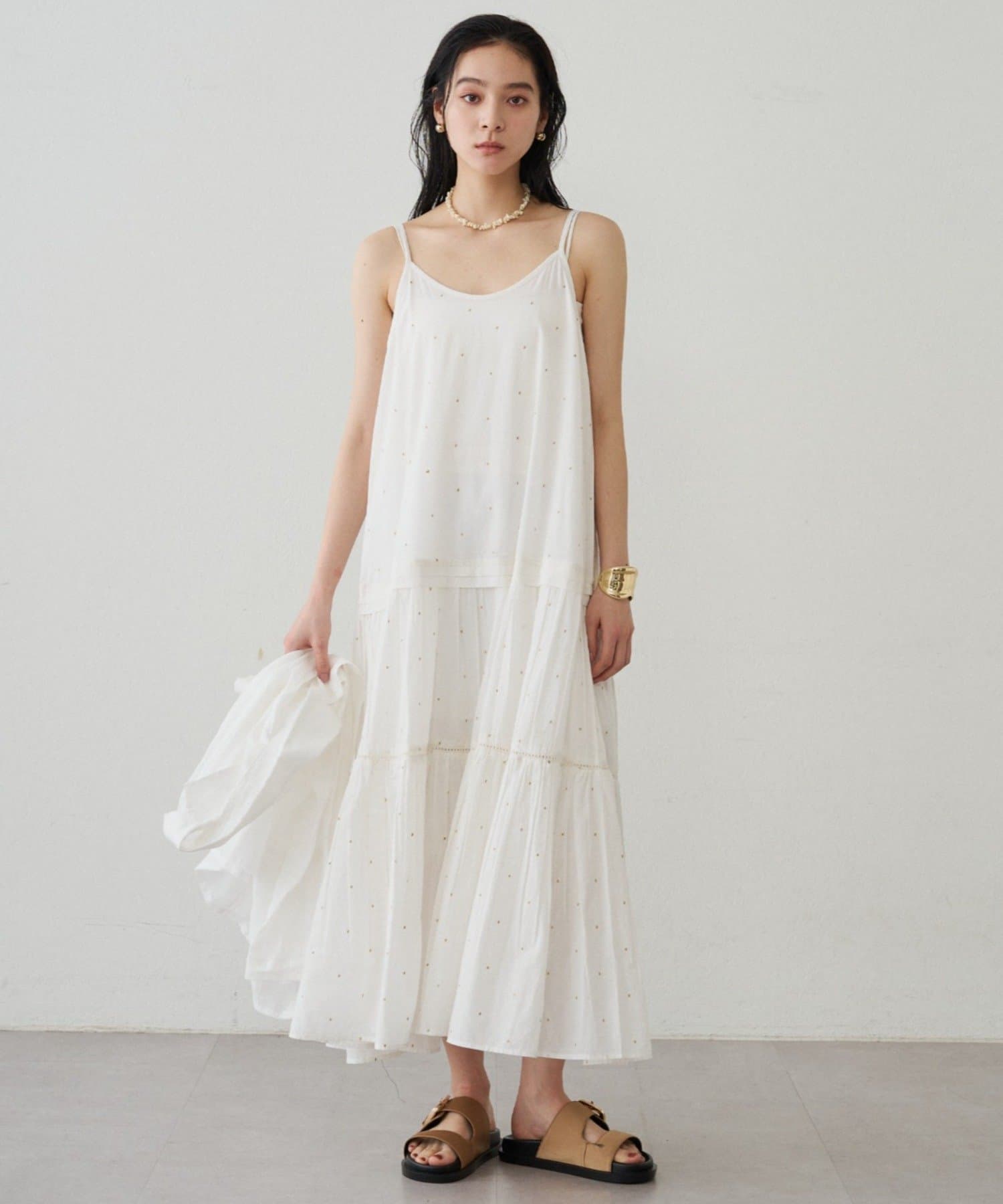 キラッとした甘すぎないドット刺繡で、大人も取り入れやすい上品な印象に。