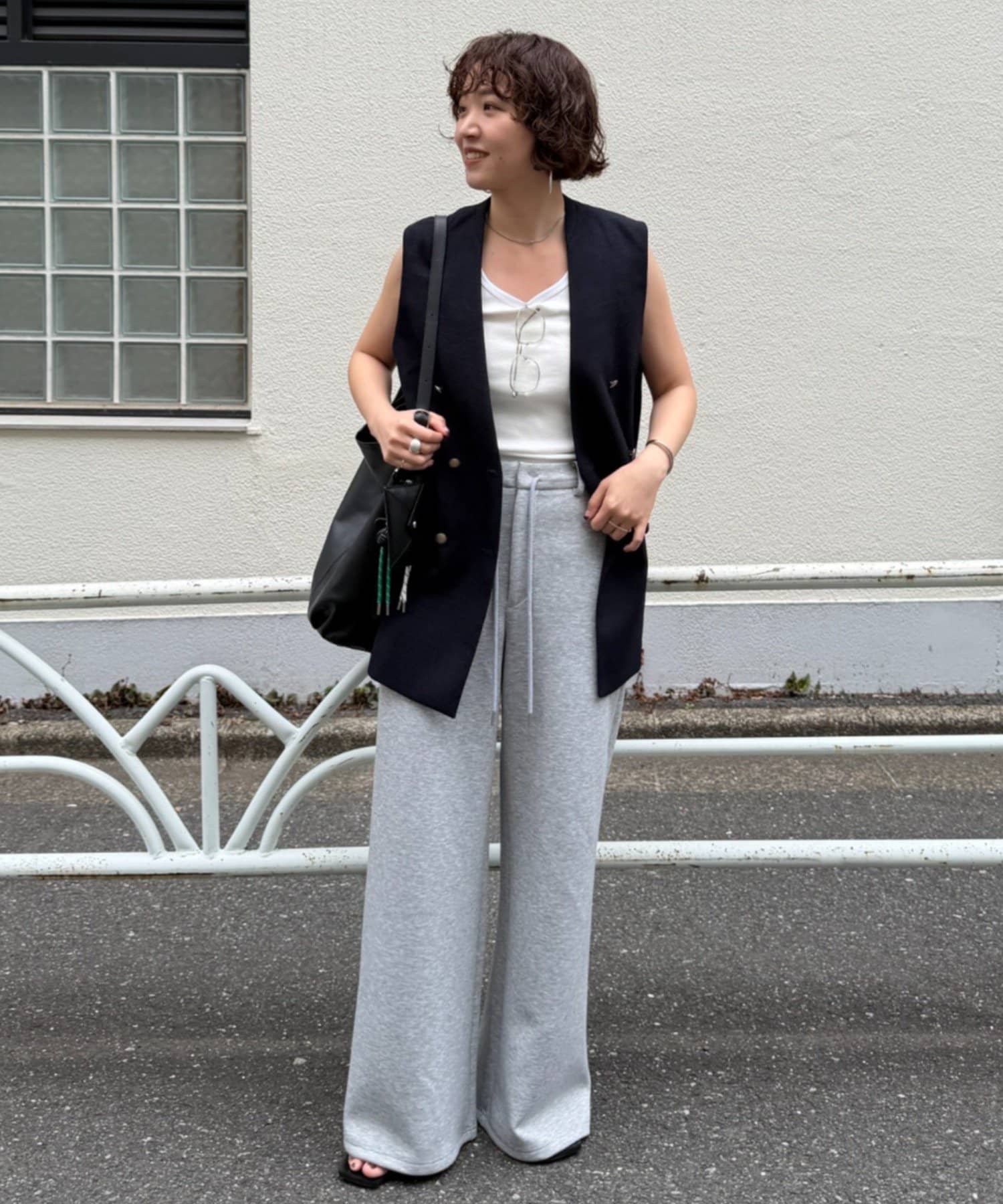 スウェット素材ながら、フロントは前開き仕様にすることで、カジュアルになりすぎず上品な印象に。