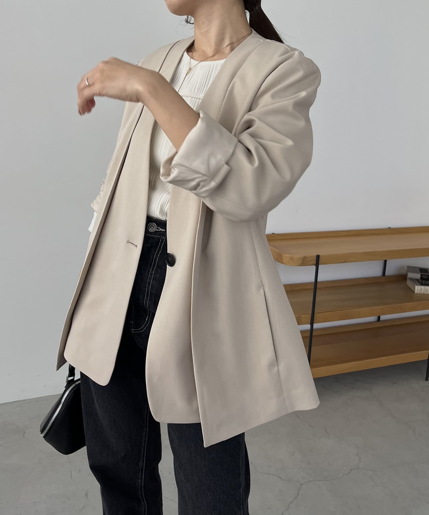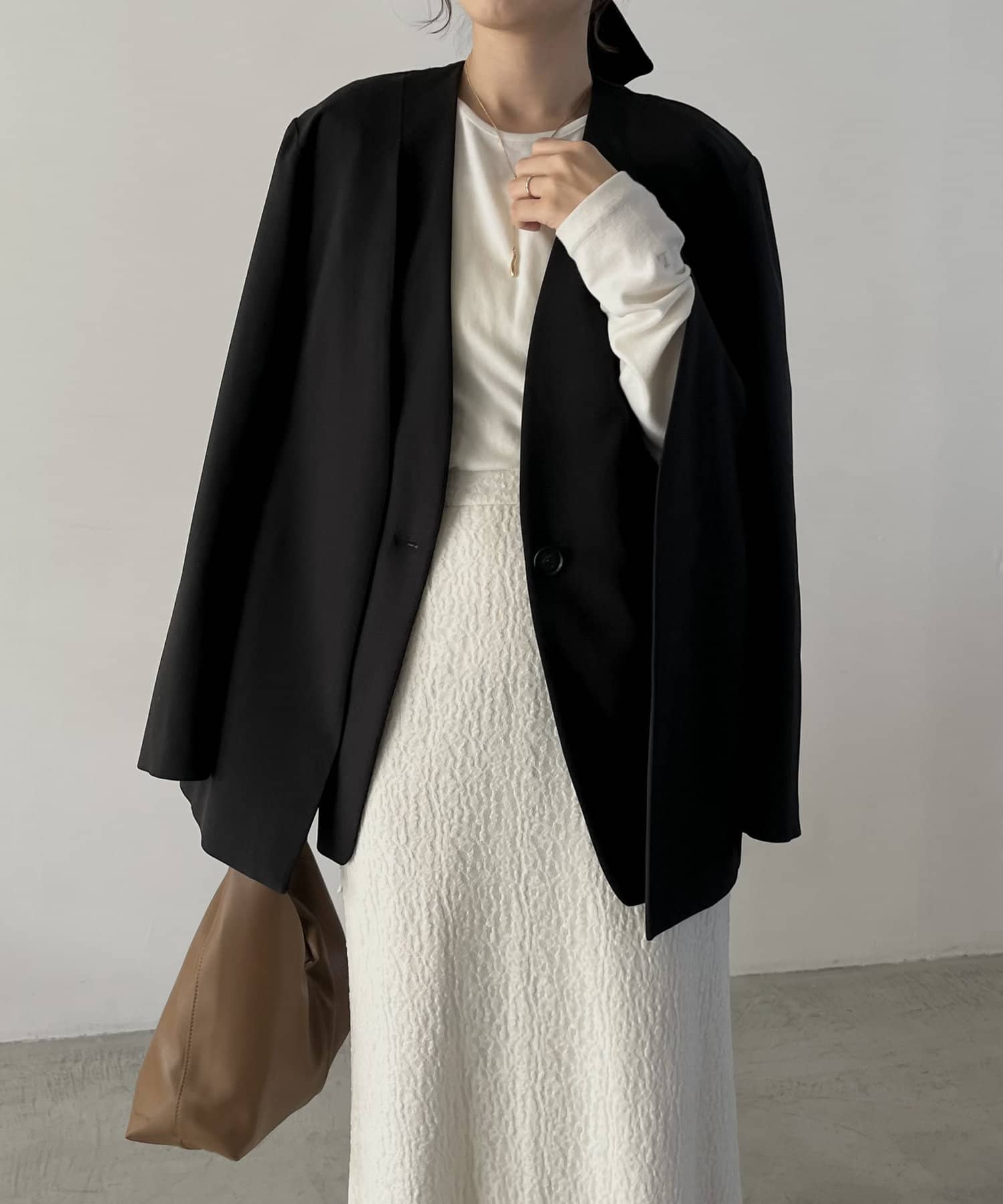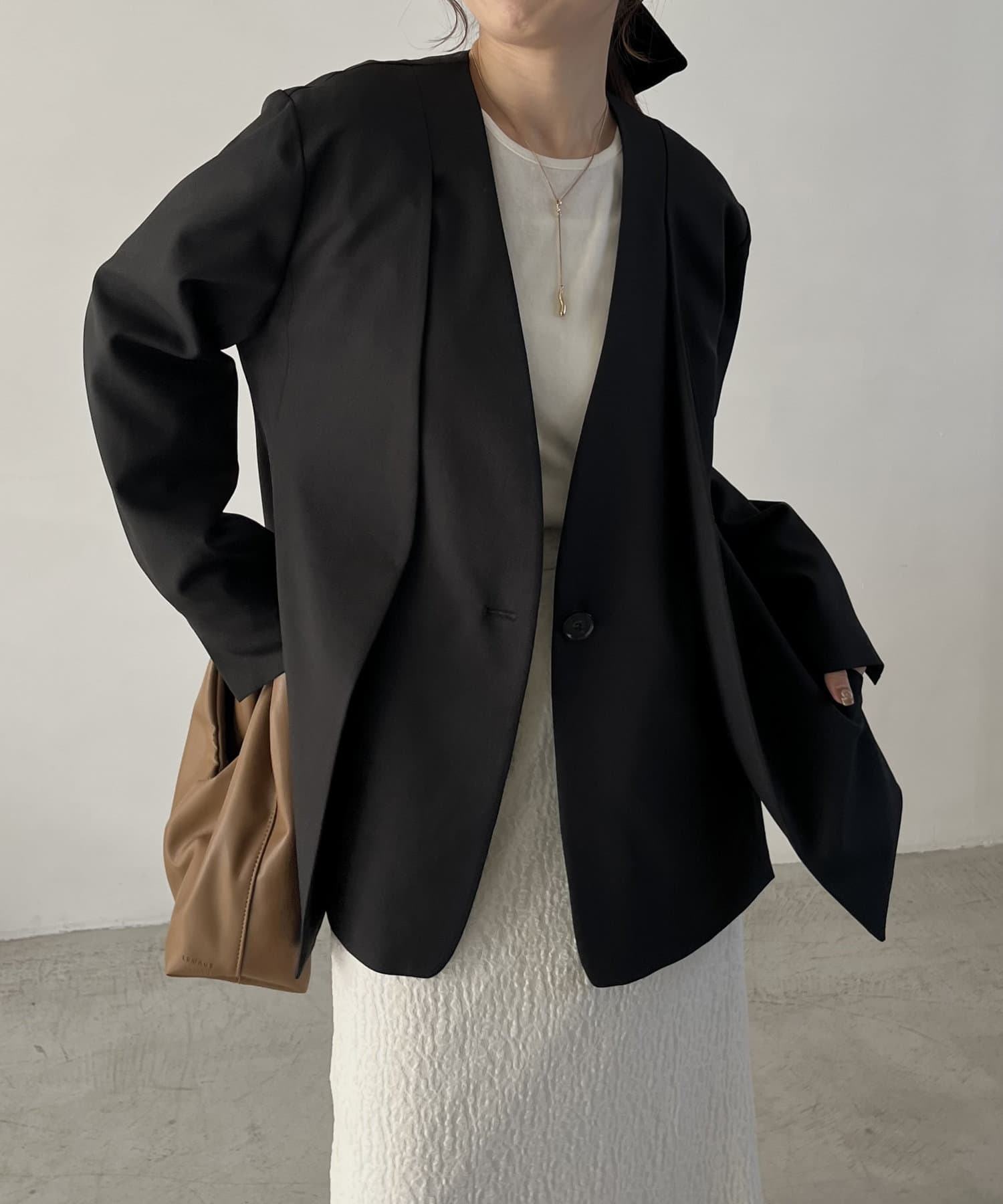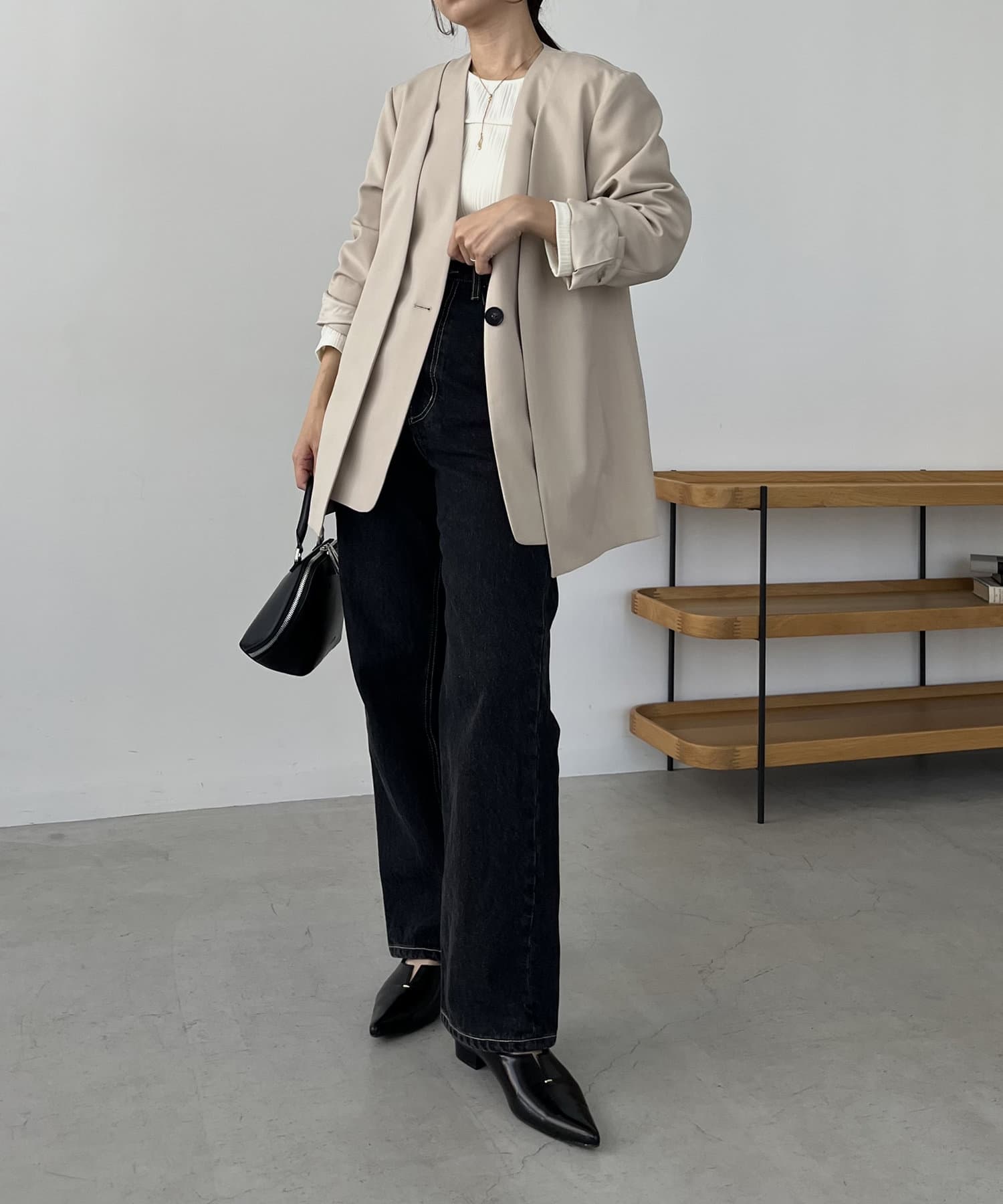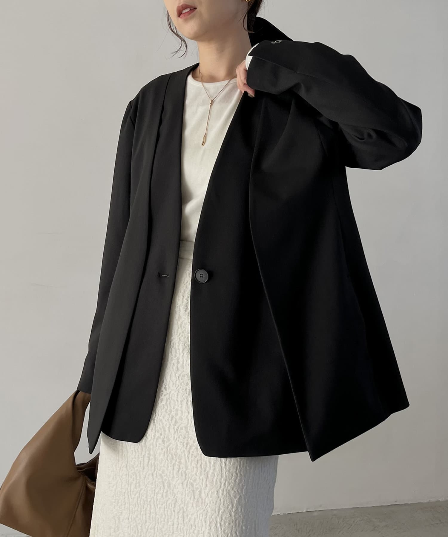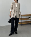 ・ジレをセットしたように見えるノーカラージャケットは、ベーシックで年代を問わず着られる