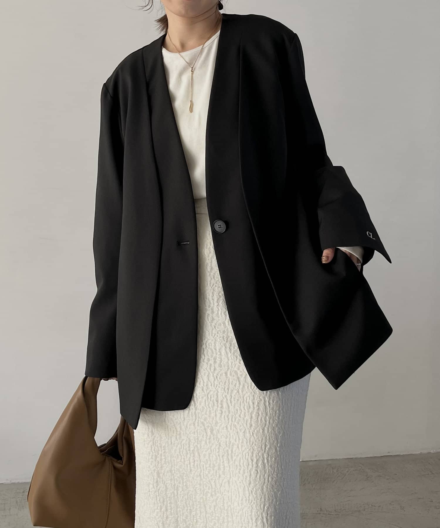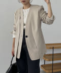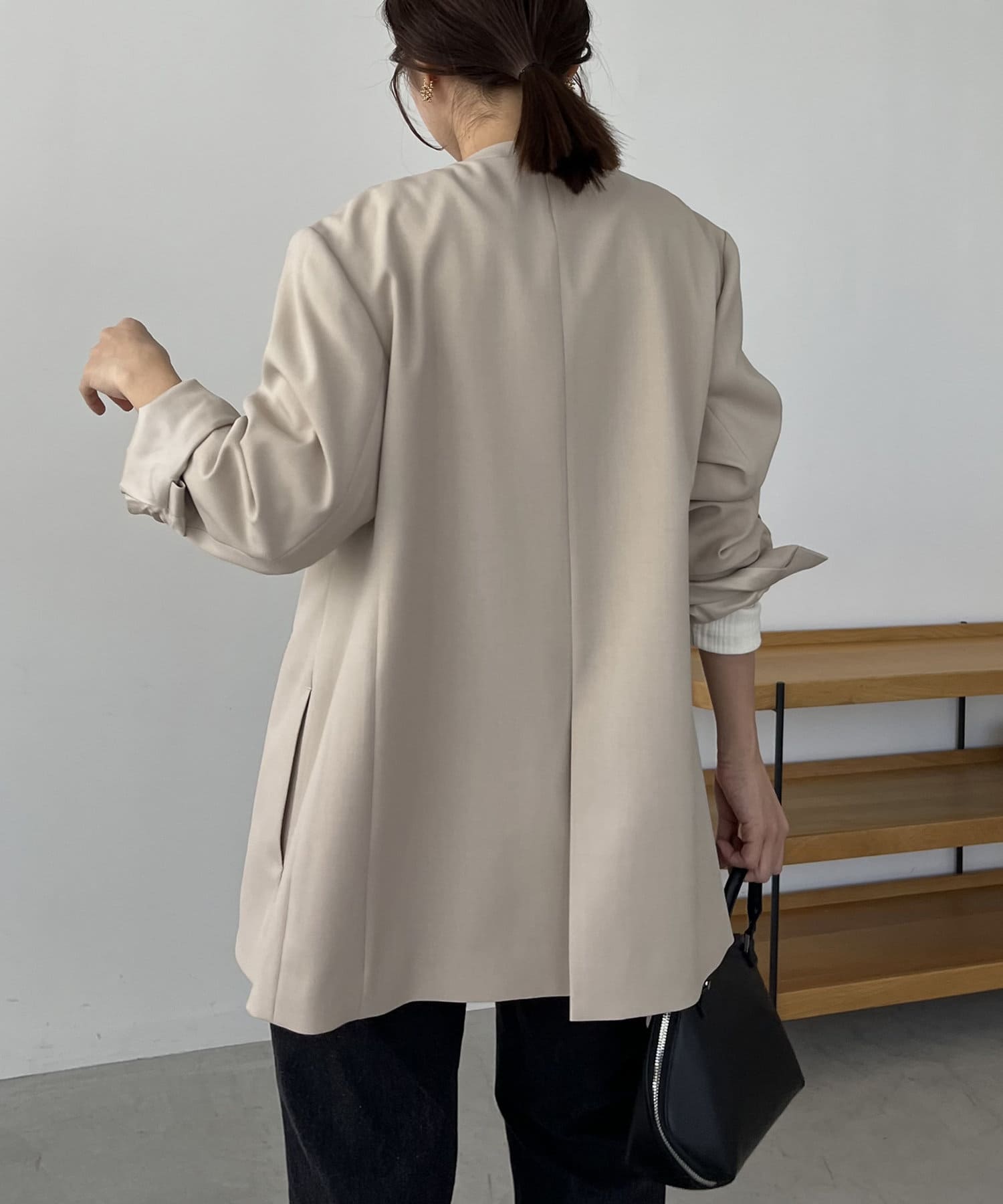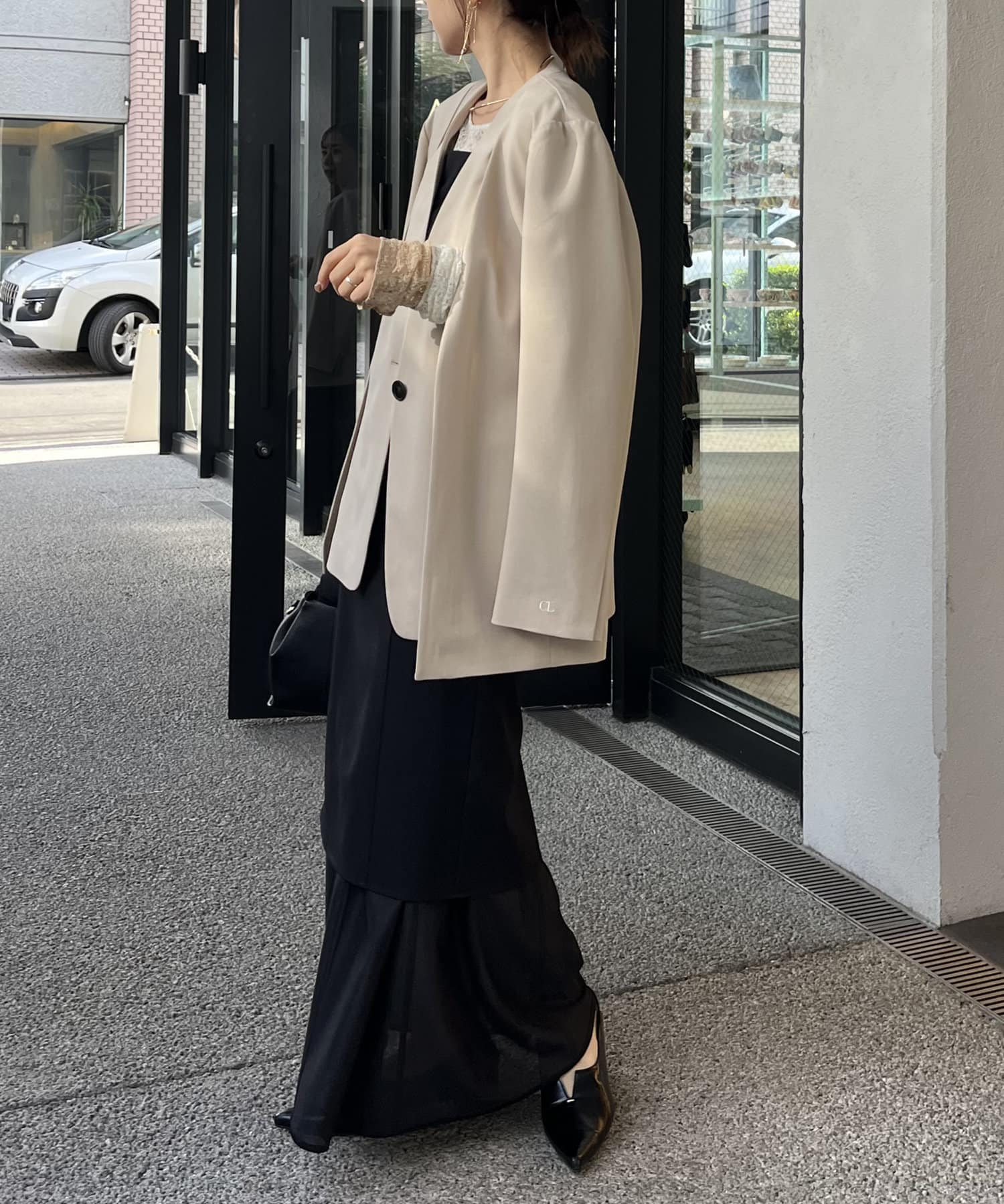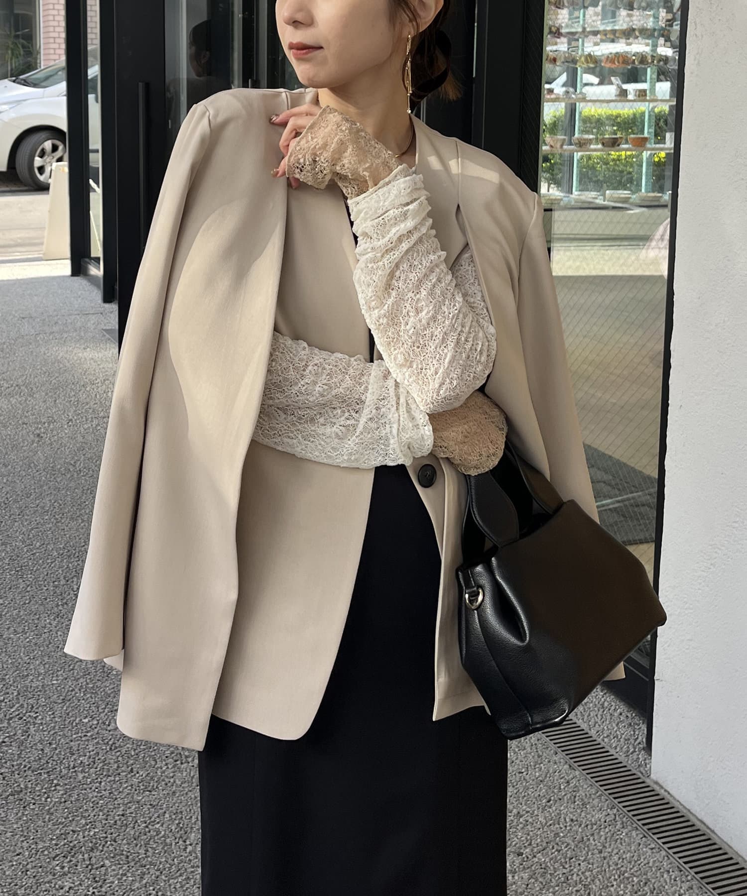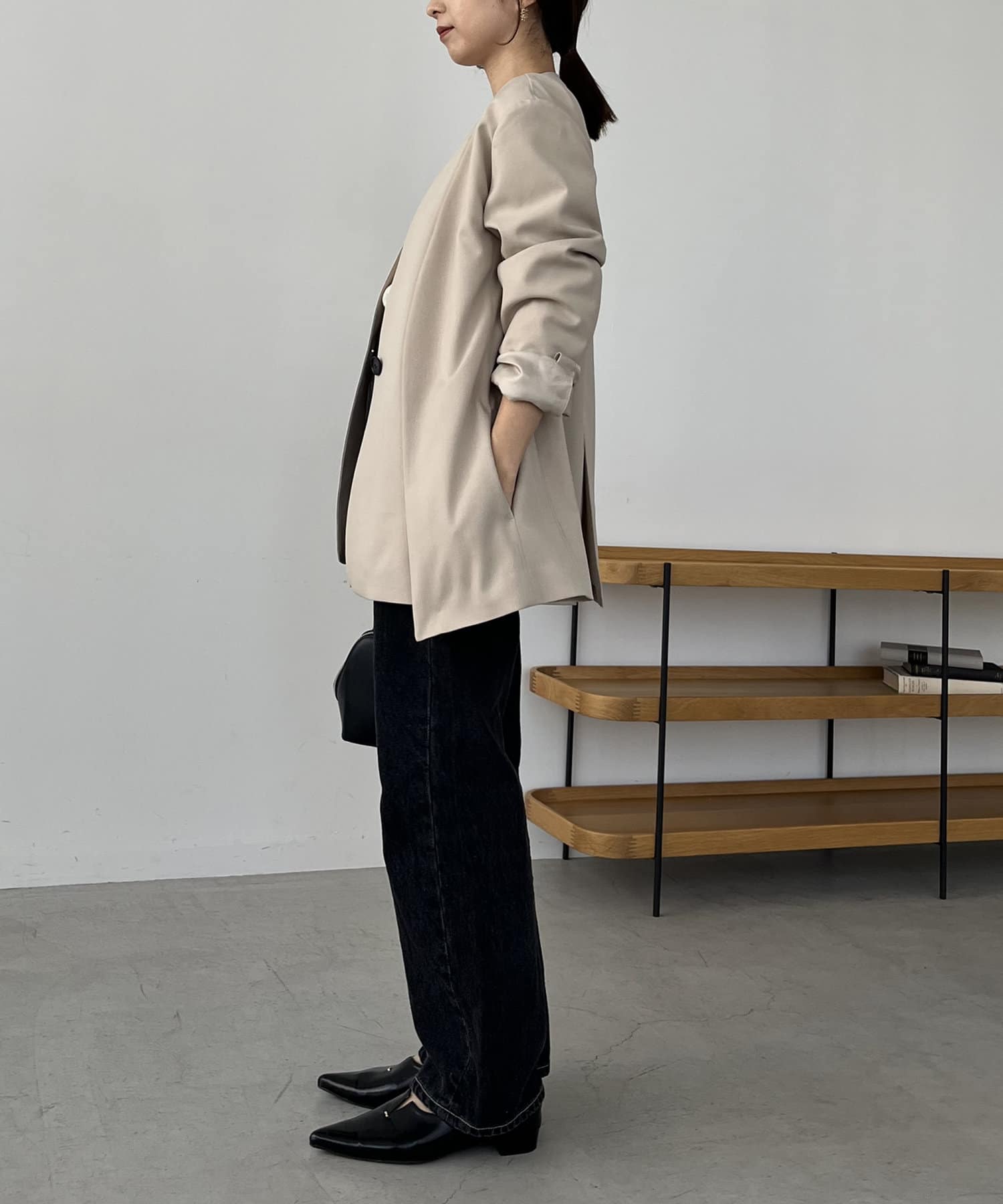・ジレをセットしたように見えるノーカラージャケットは、ベーシックで年代を問わず着られる