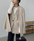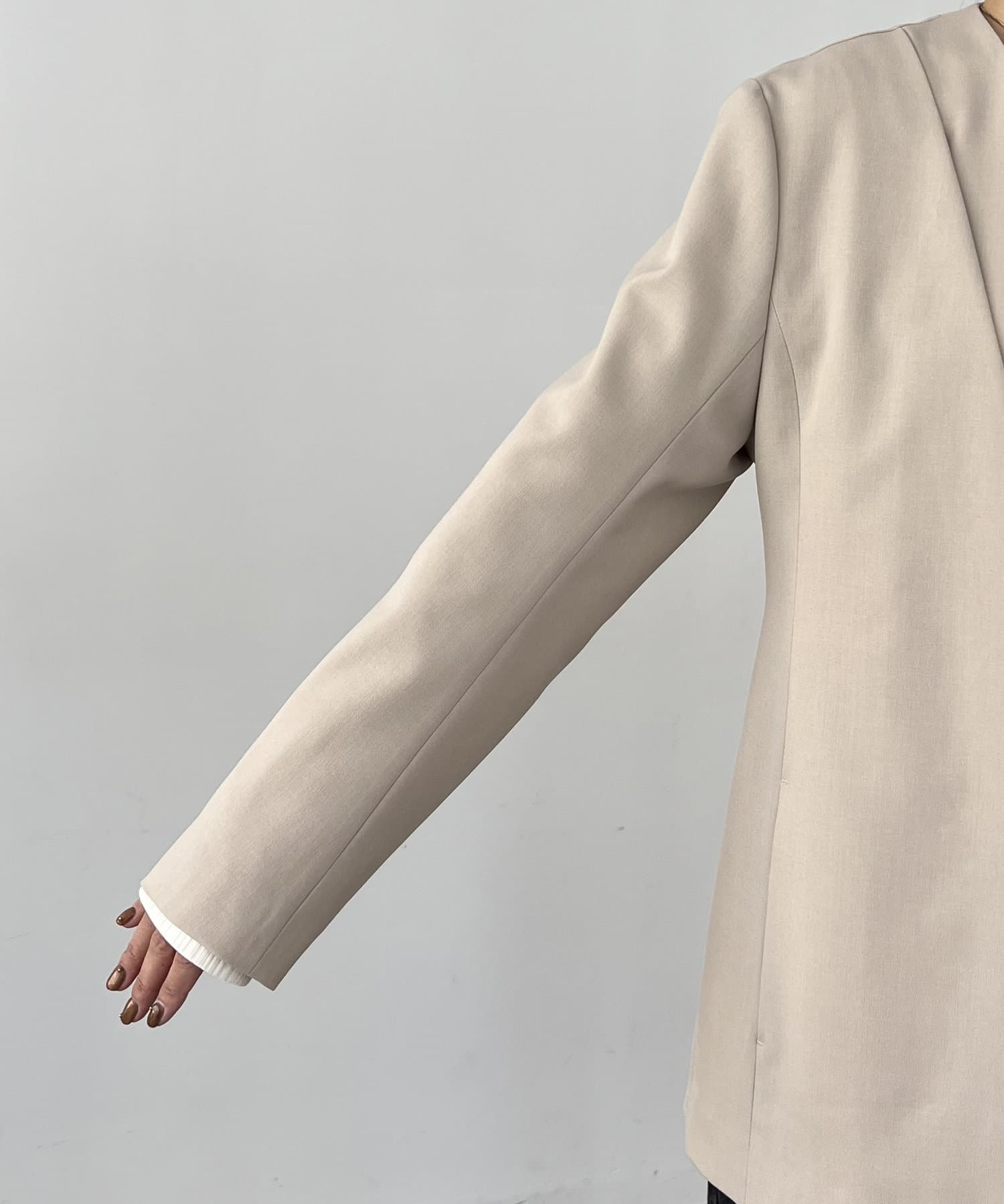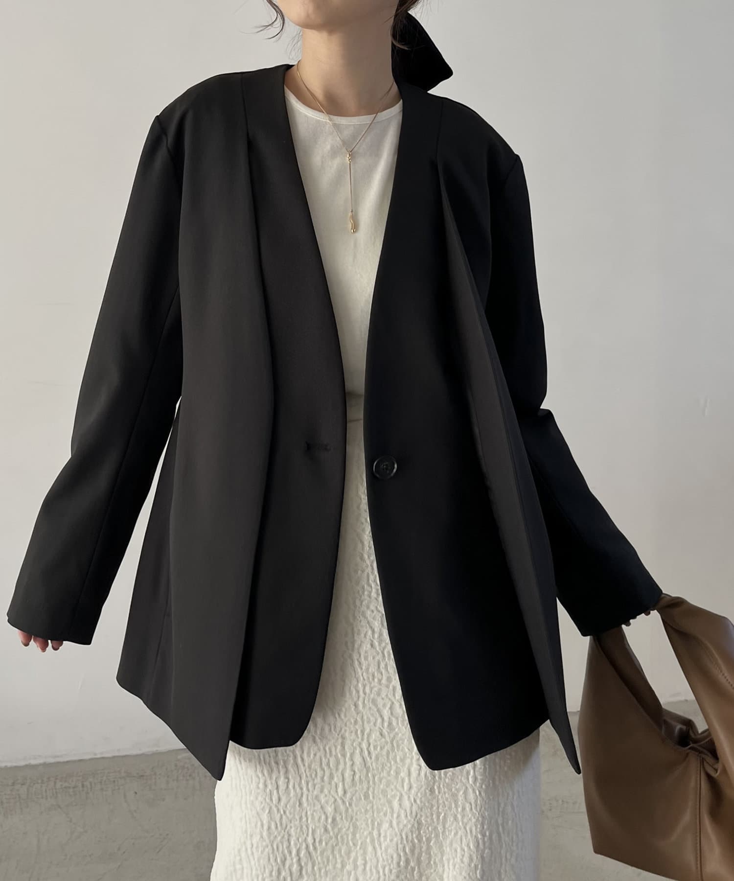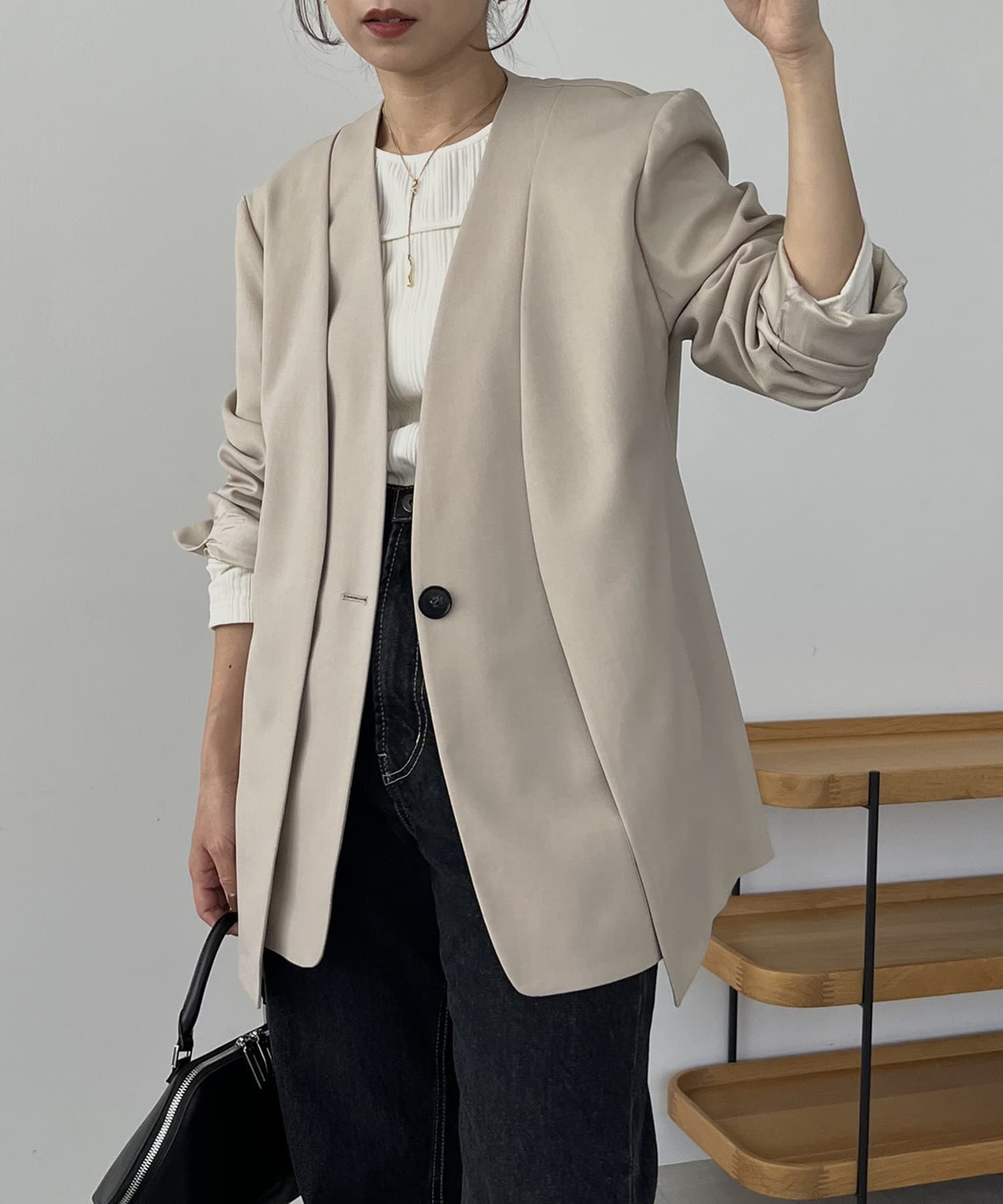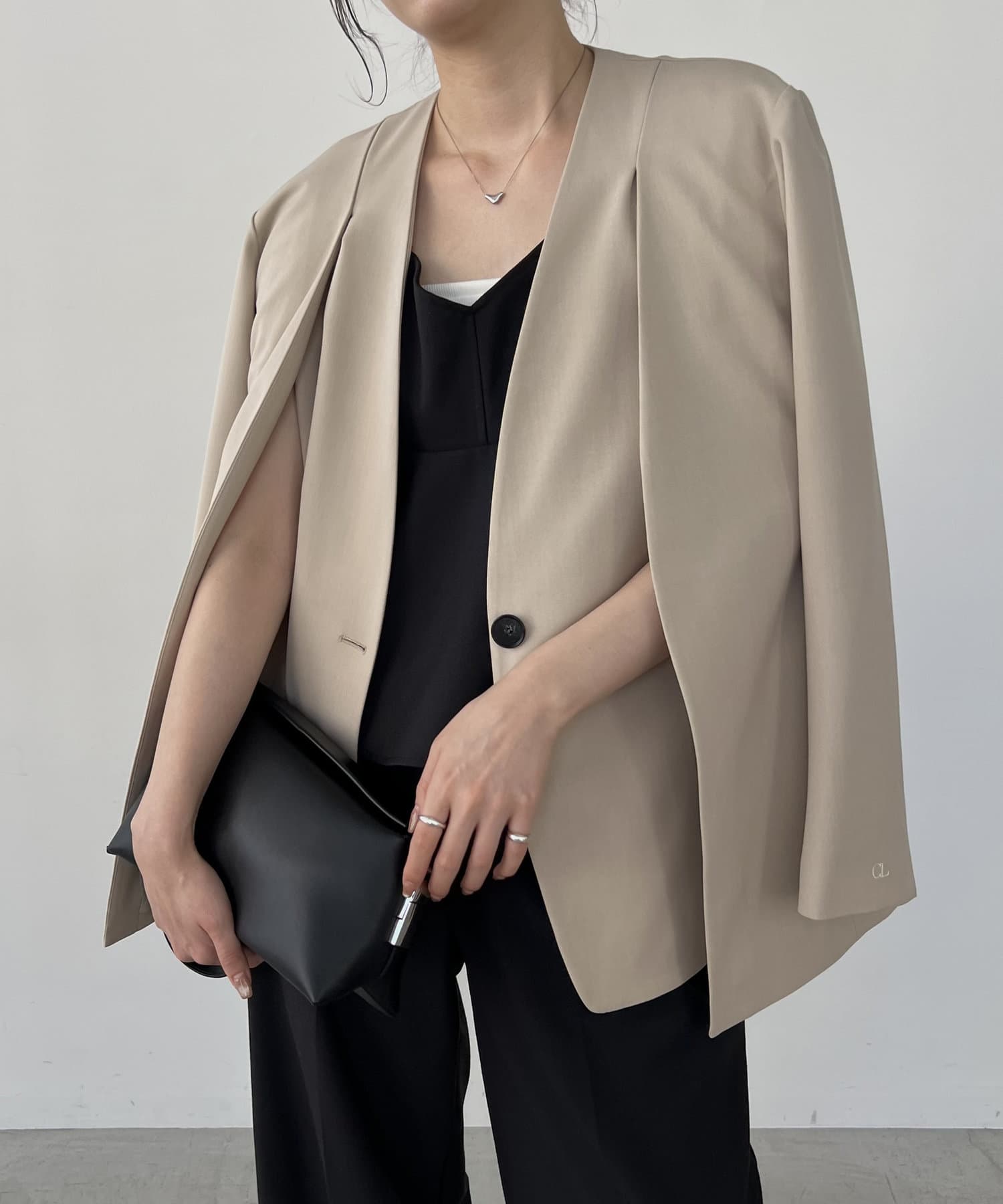 ・ジレをセットしたように見えるノーカラージャケットは、ベーシックで年代を問わず着られる