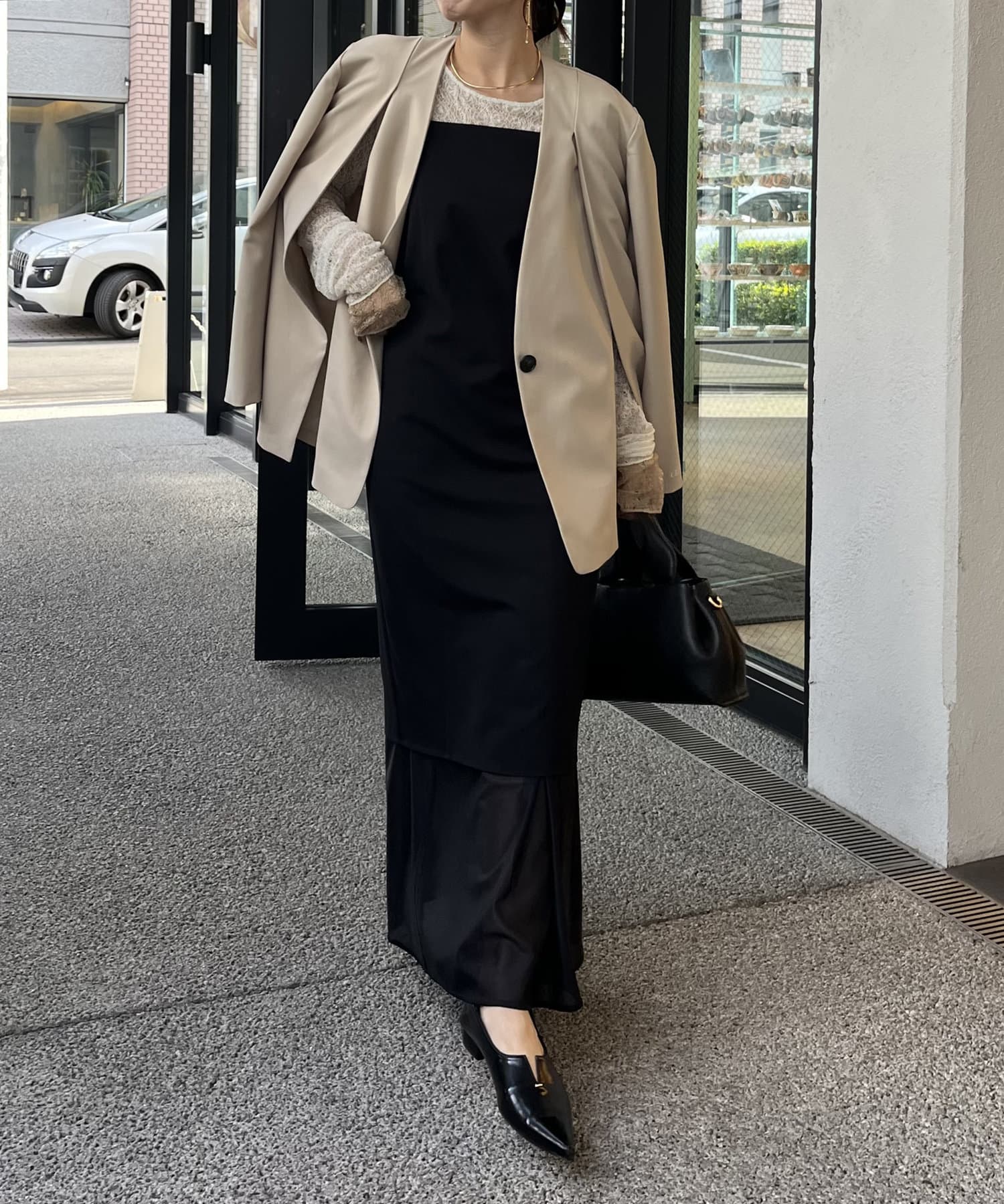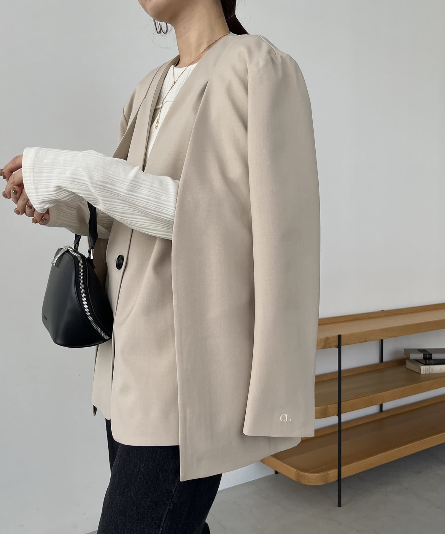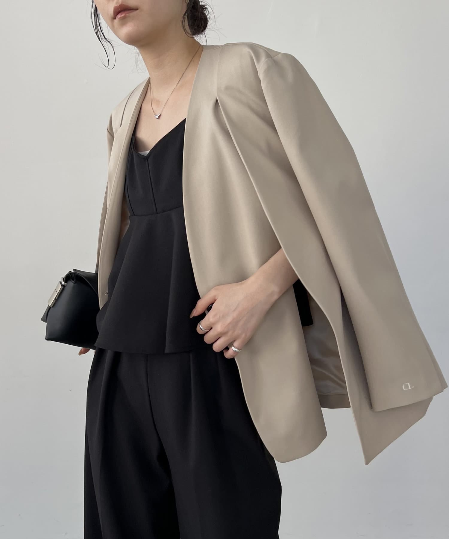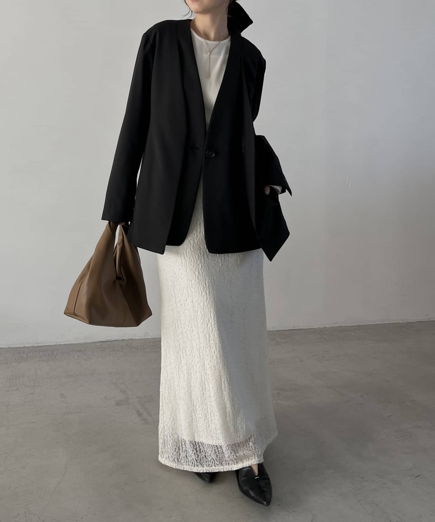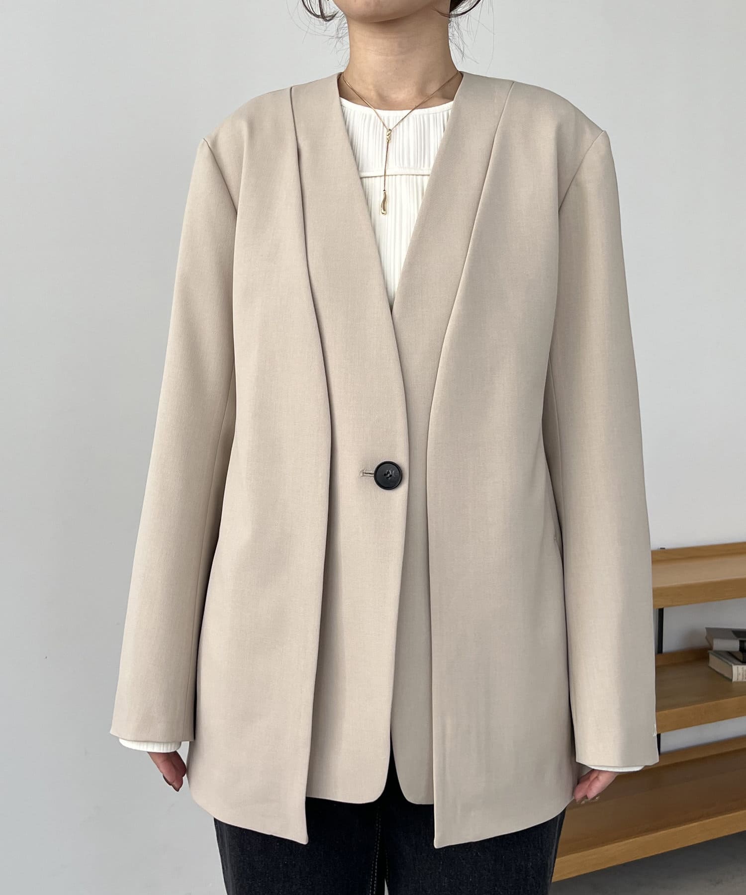 ・ジレをセットしたように見えるノーカラージャケットは、ベーシックで年代を問わず着られる