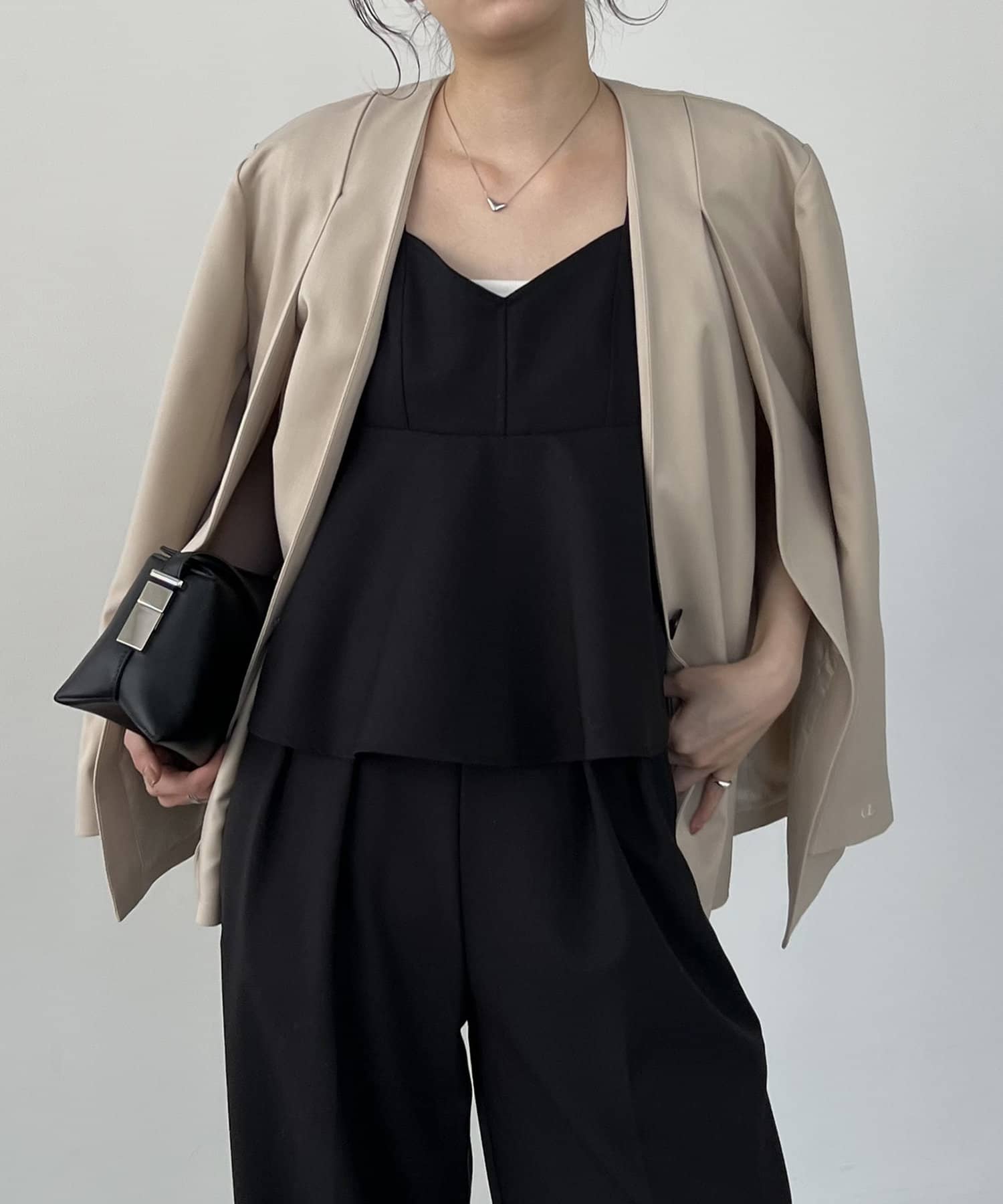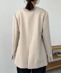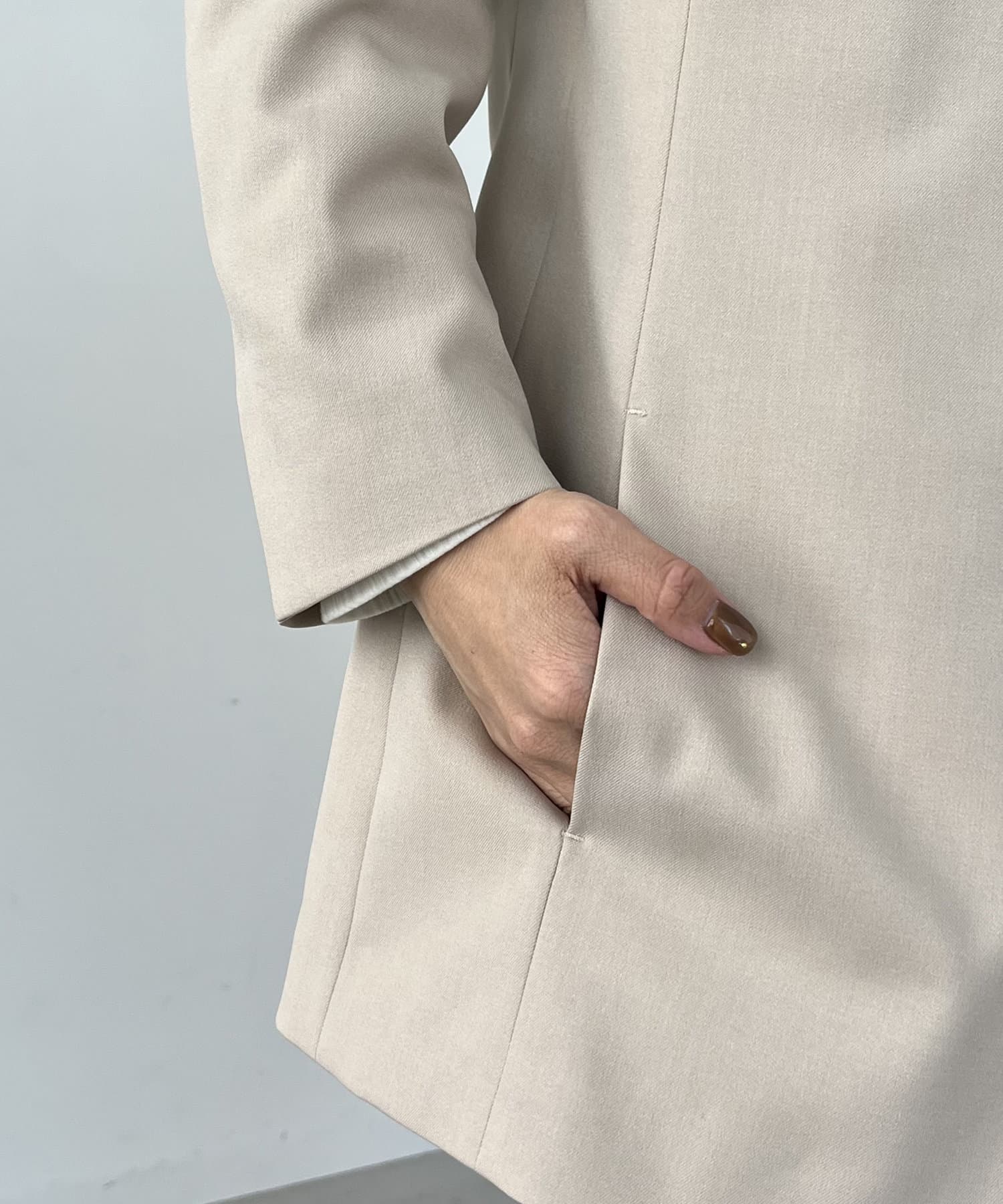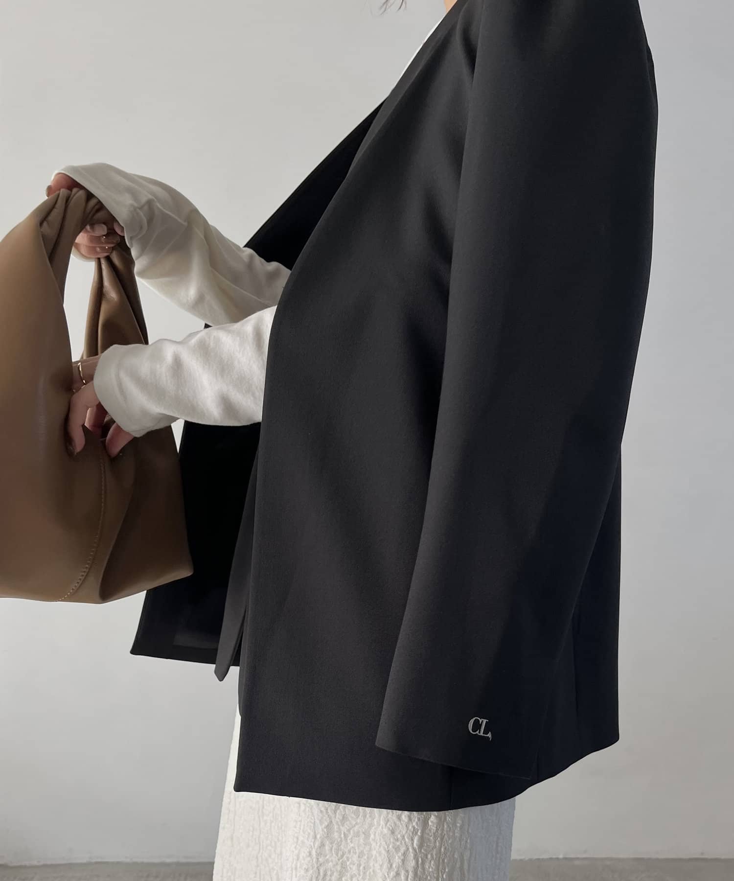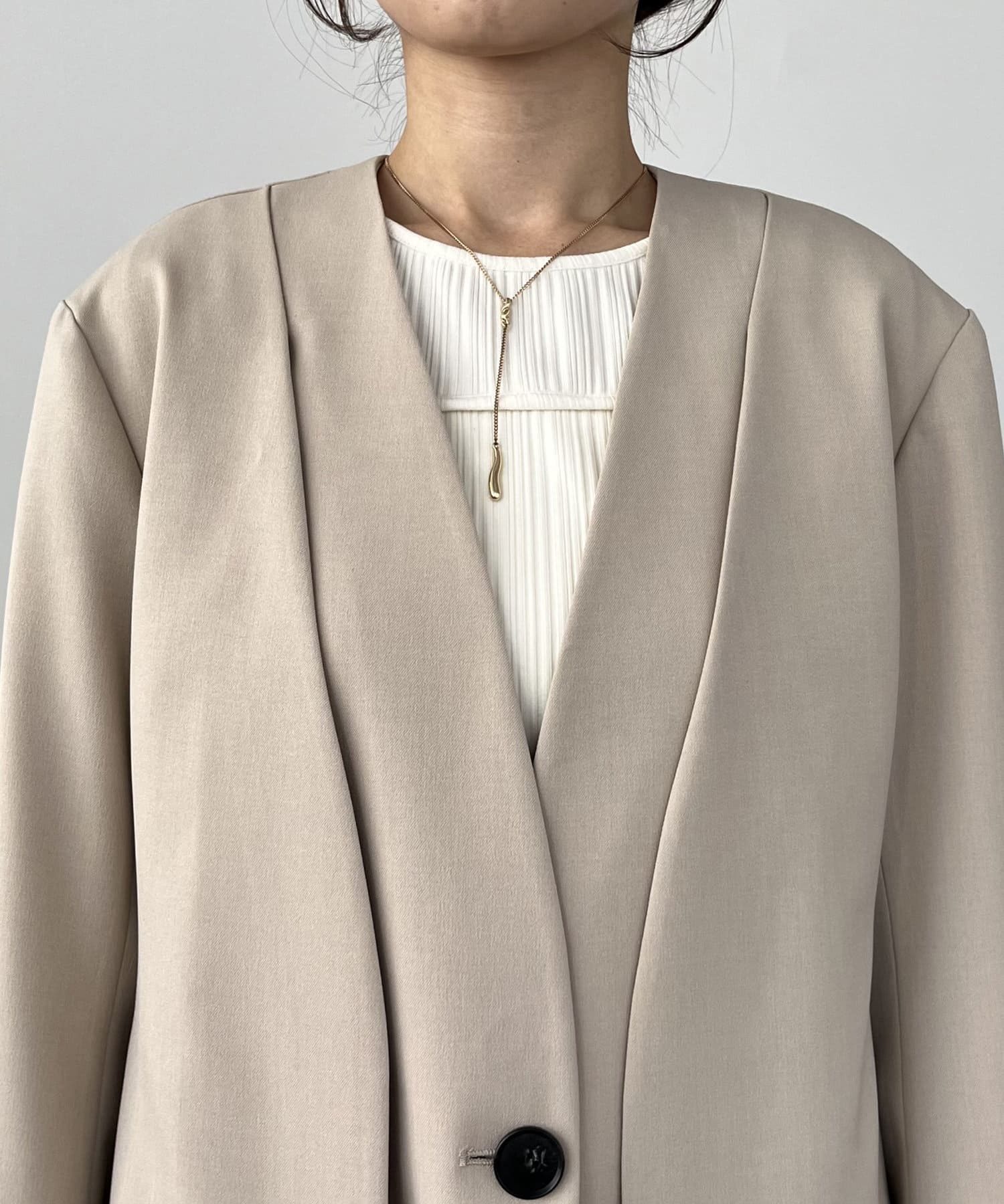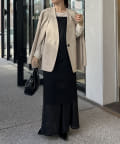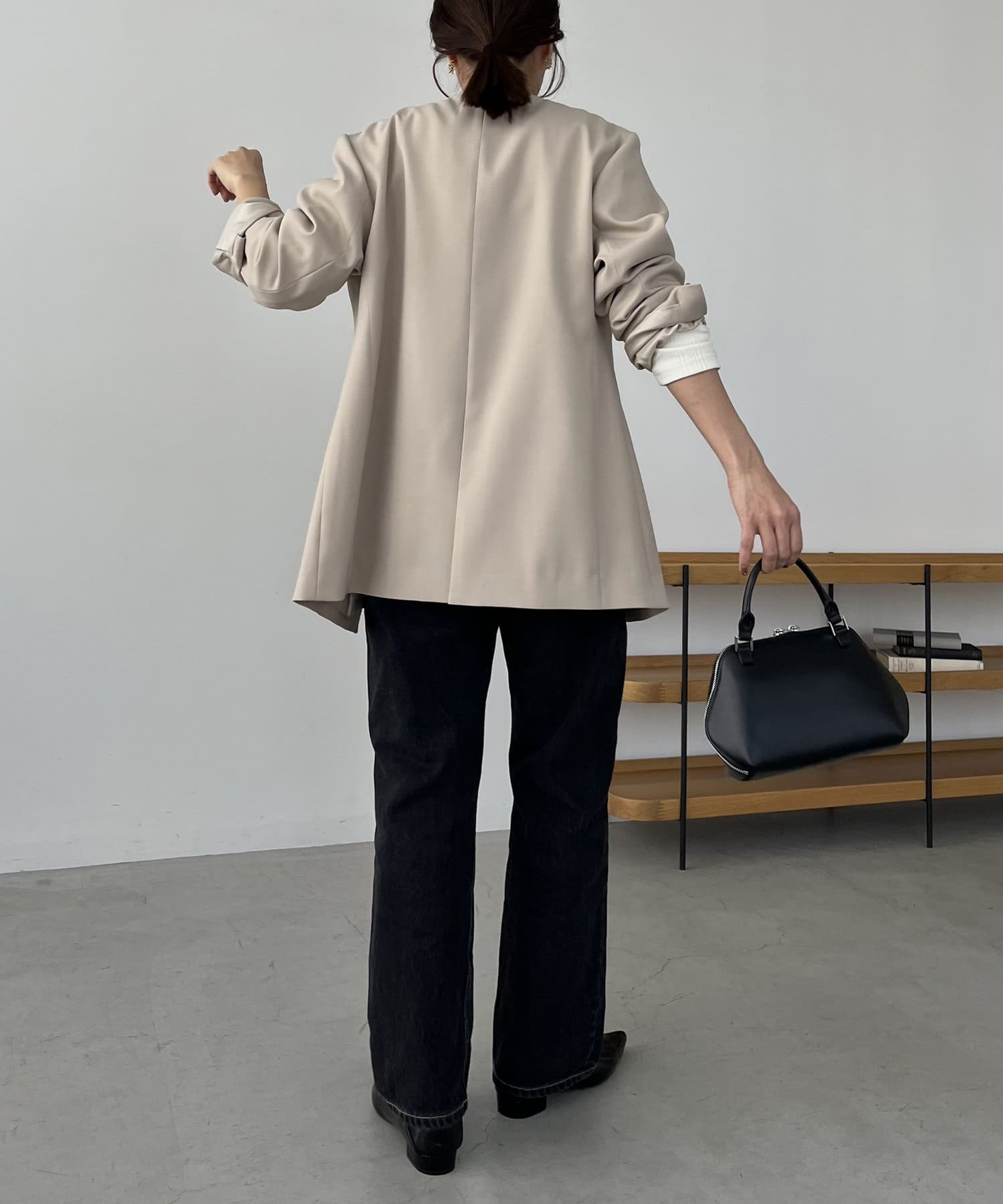・ジレをセットしたように見えるノーカラージャケットは、ベーシックで年代を問わず着られる