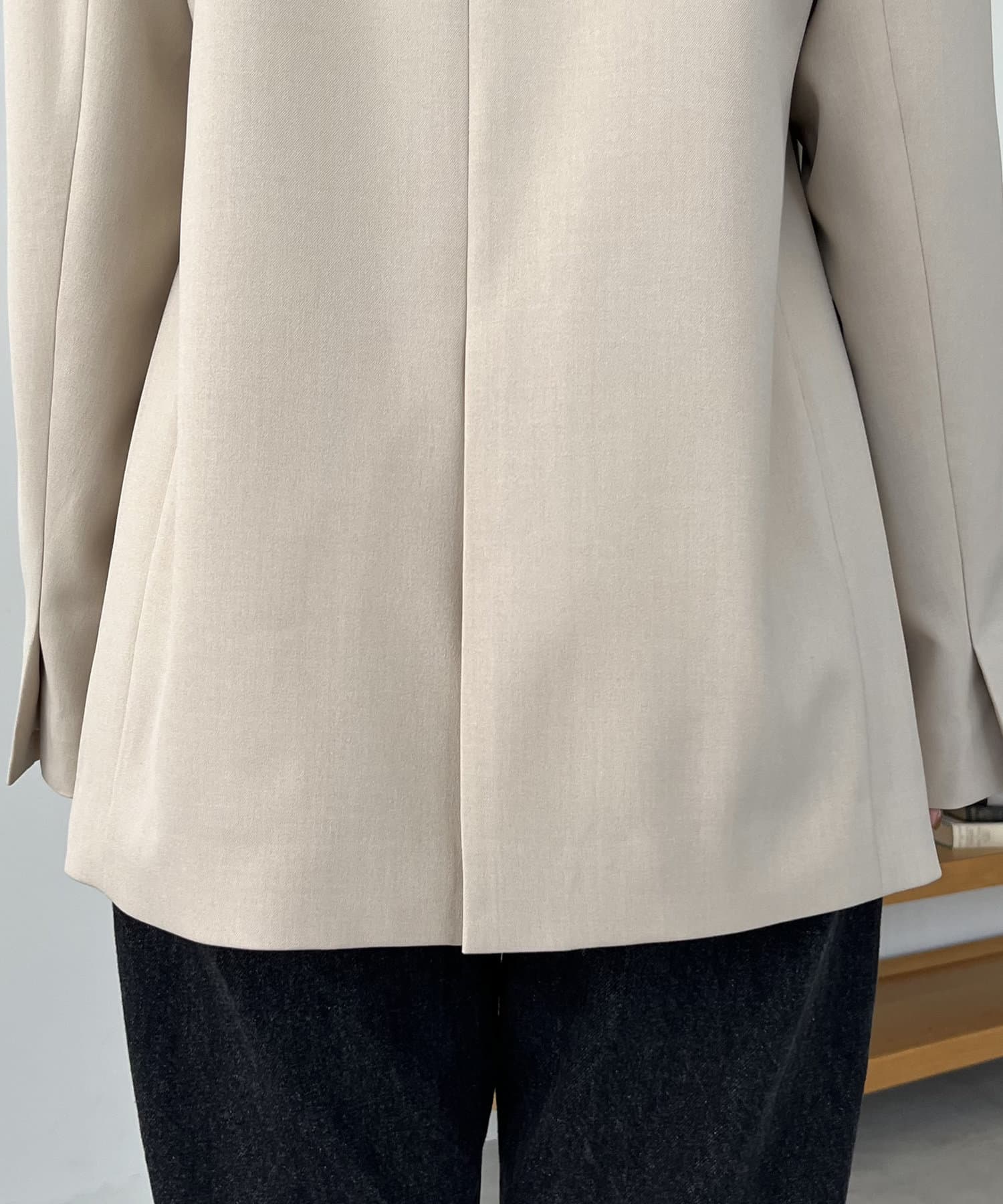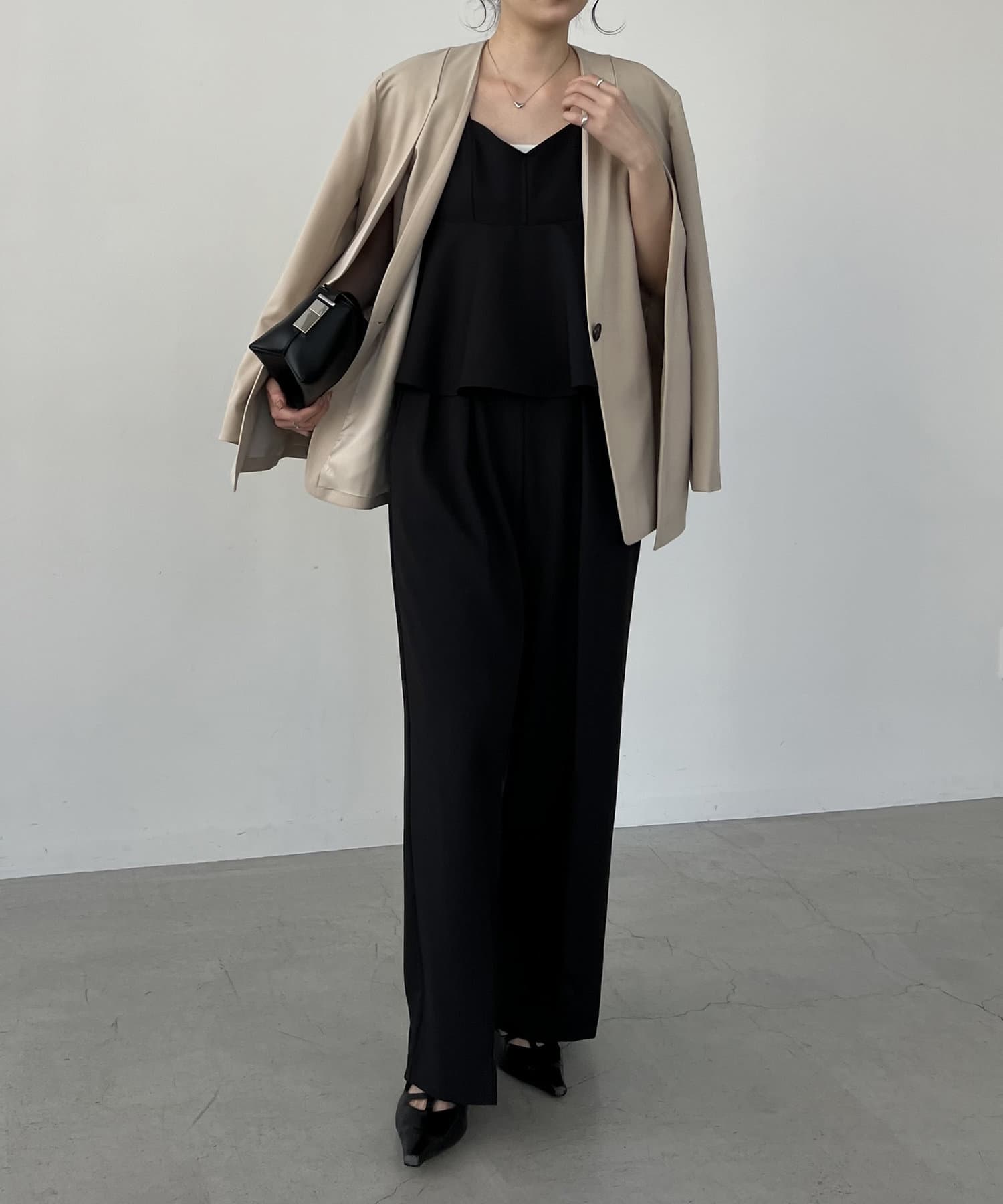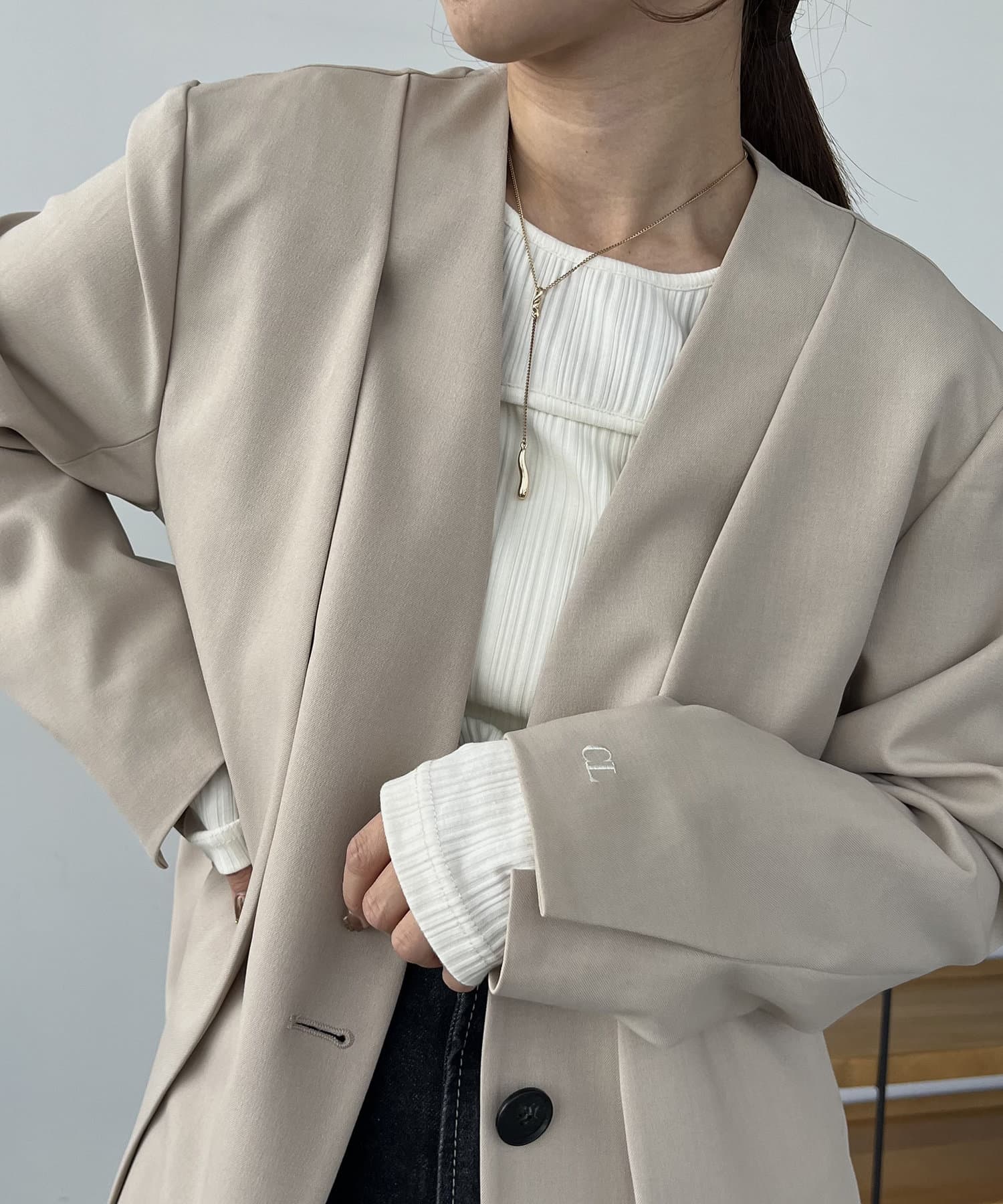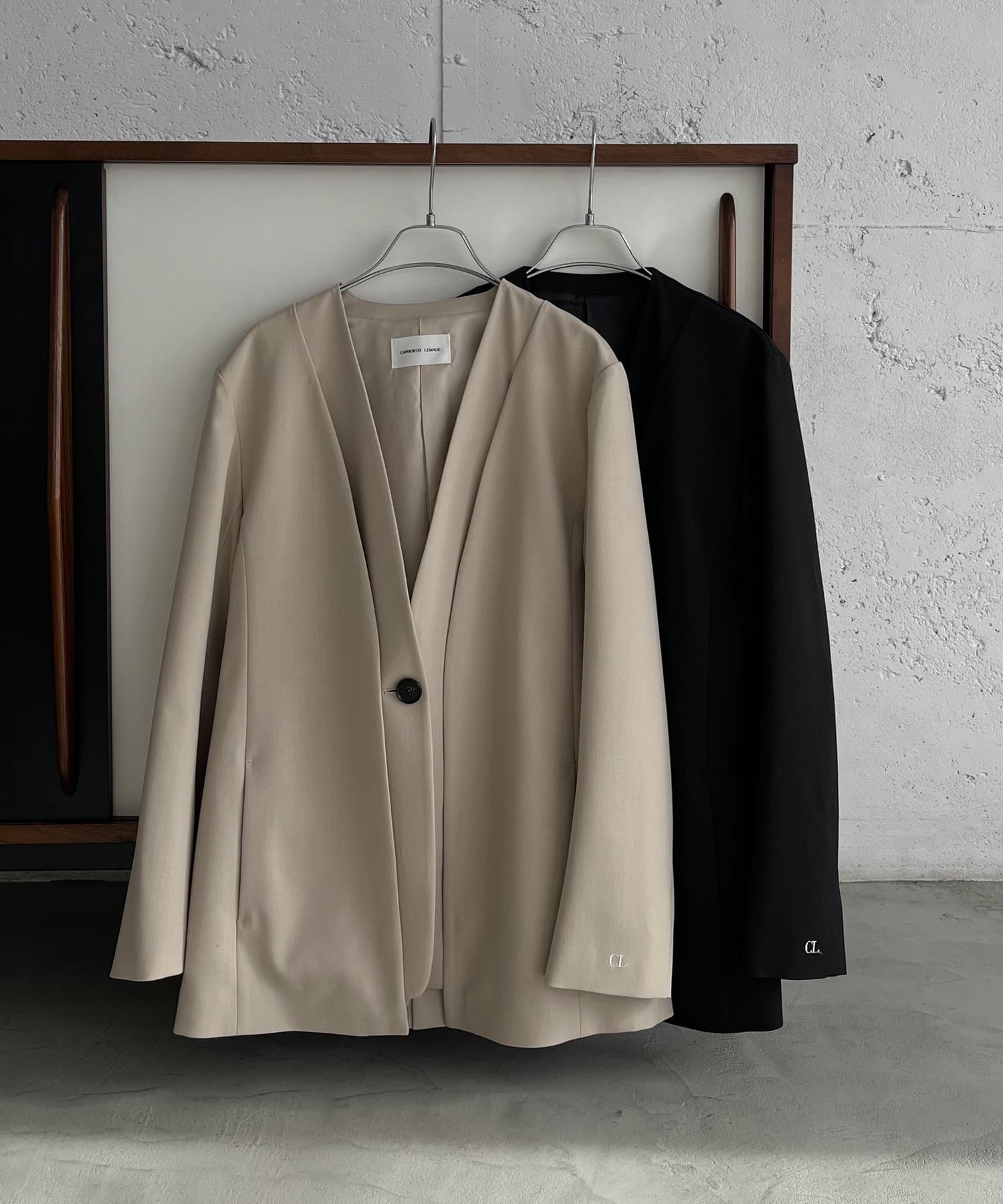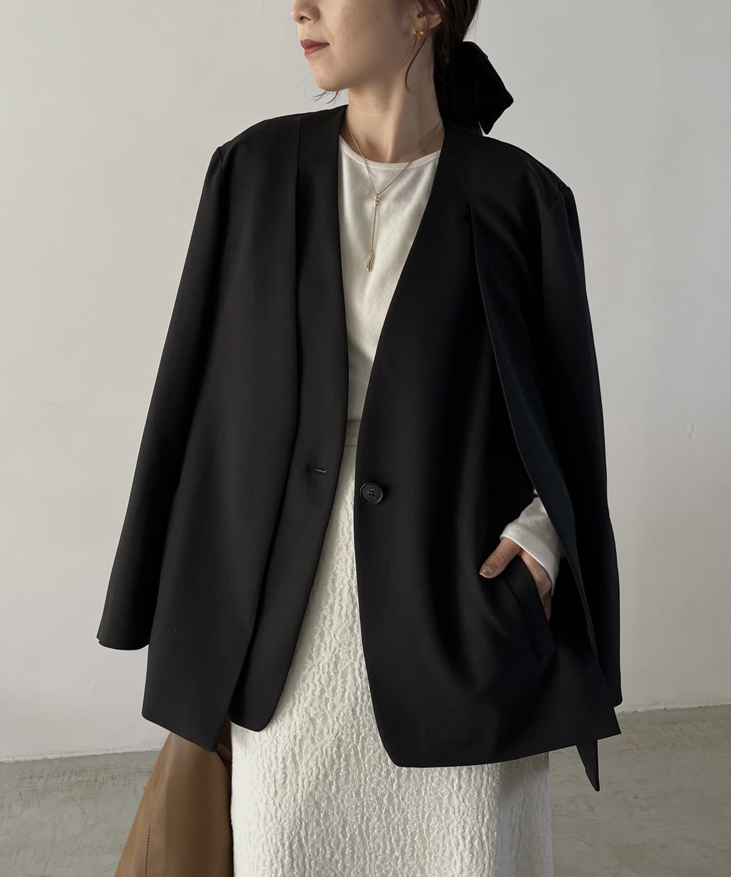 ・ジレをセットしたように見えるノーカラージャケットは、ベーシックで年代を問わず着られる