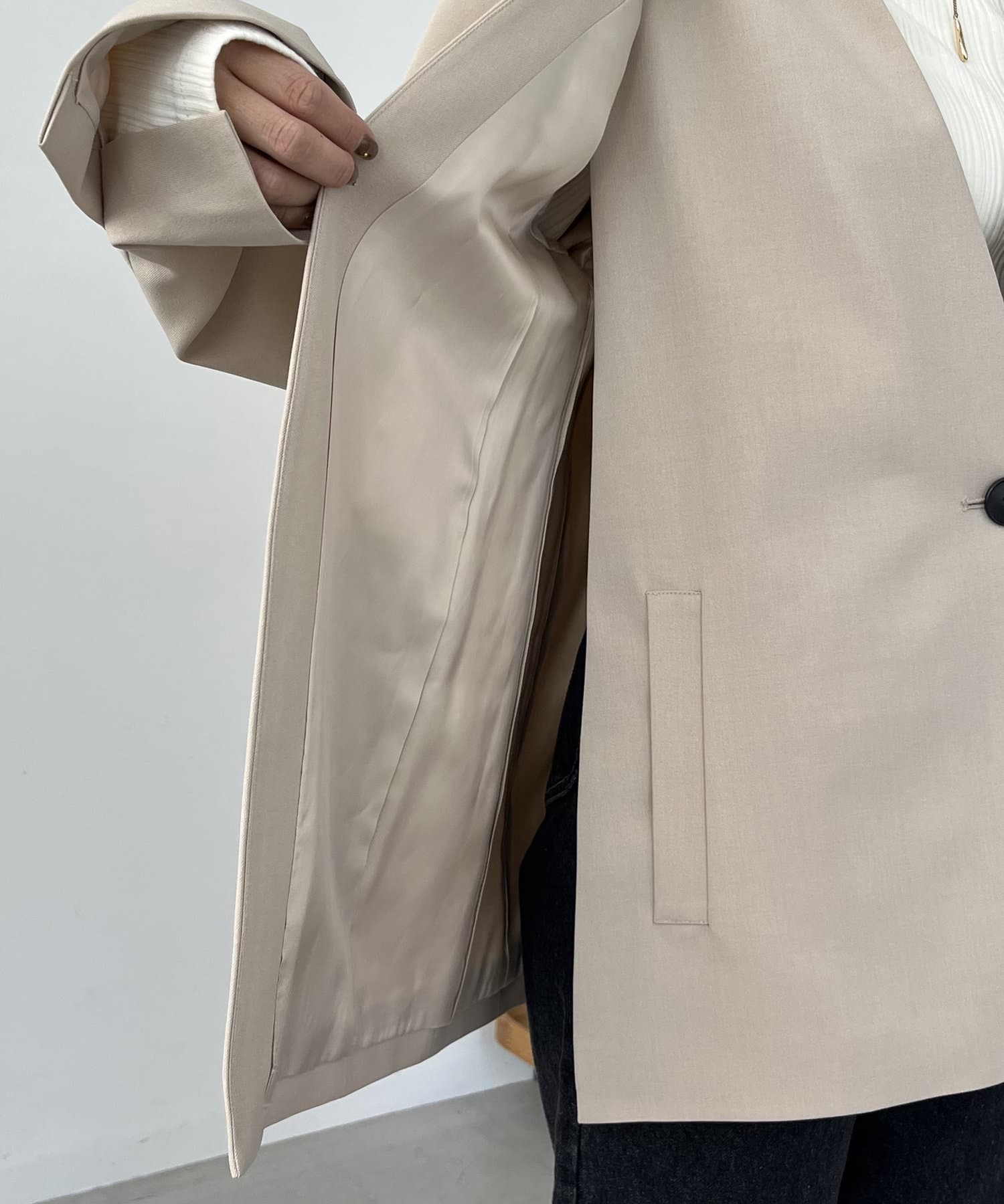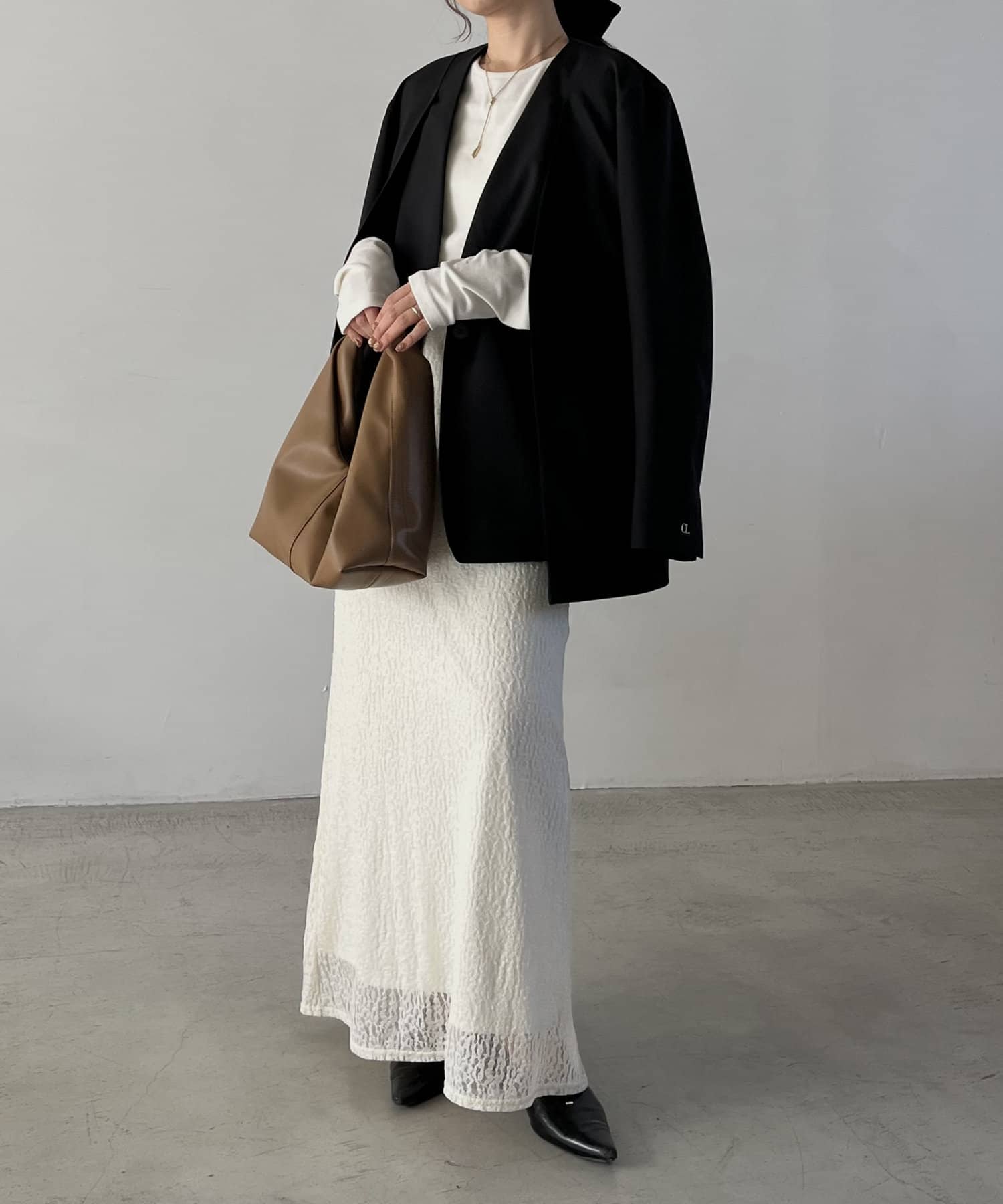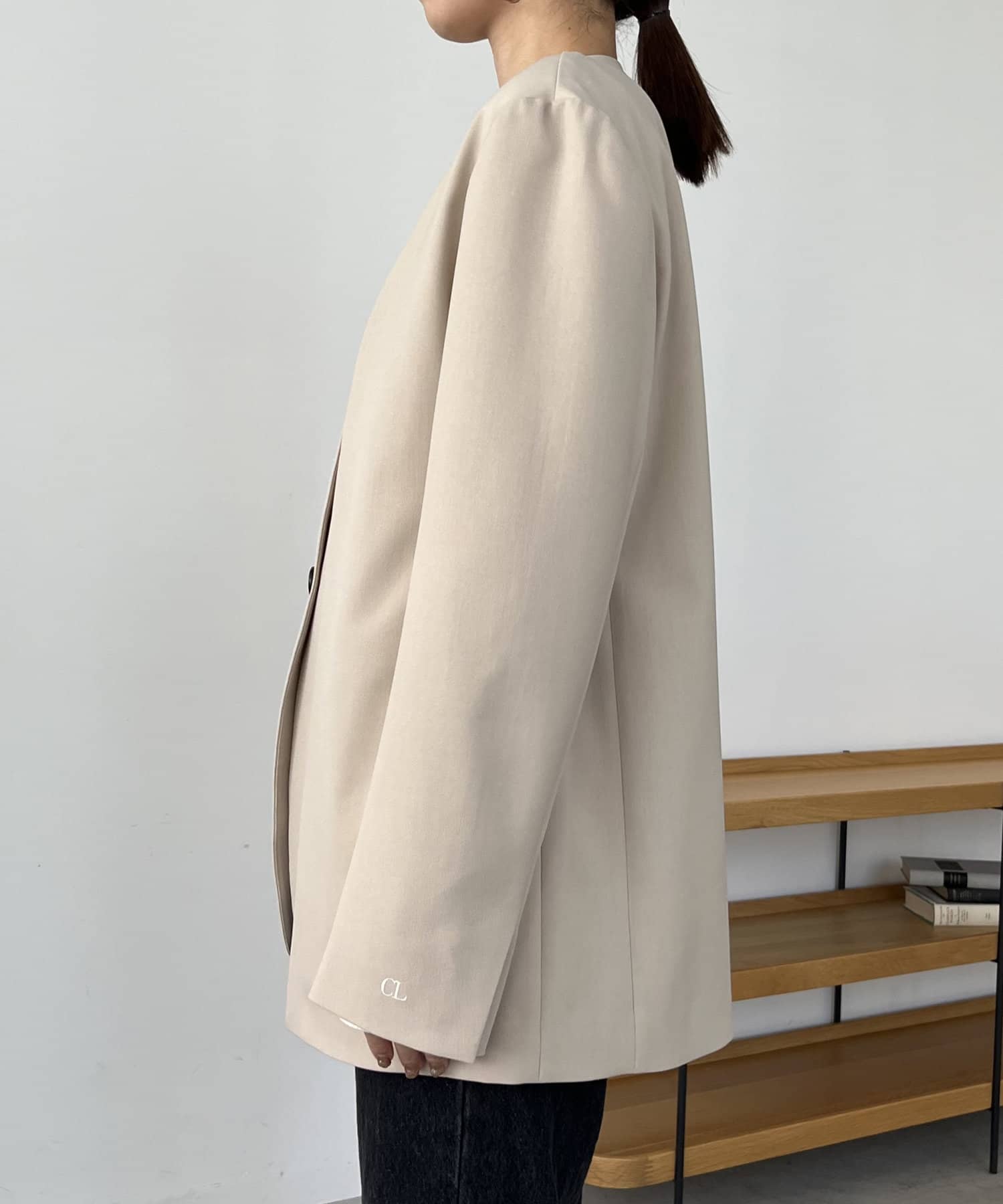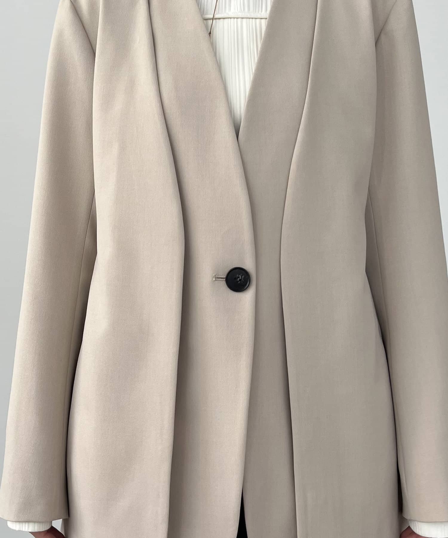 ・ジレをセットしたように見えるノーカラージャケットは、ベーシックで年代を問わず着られる