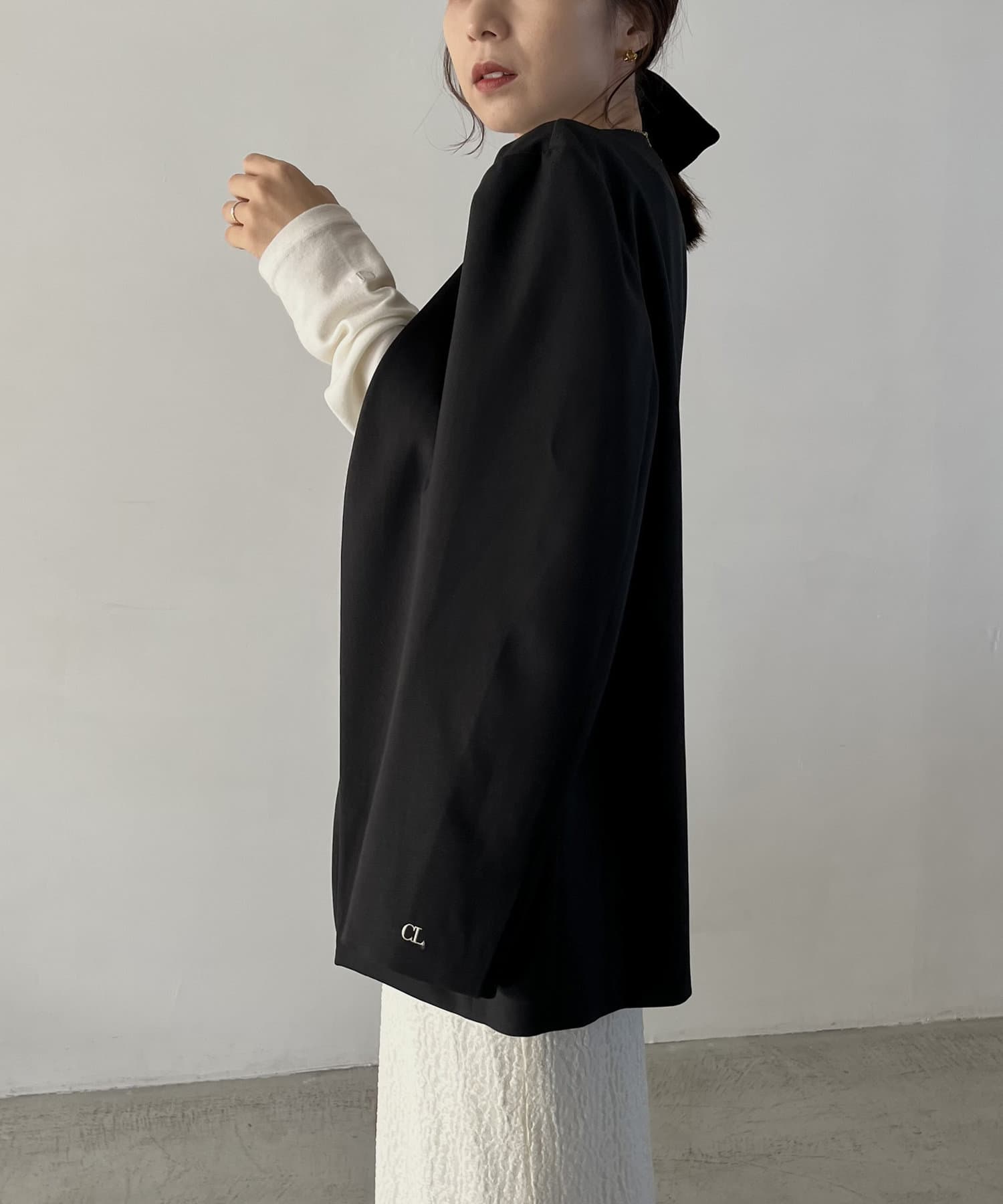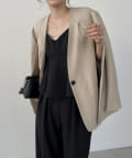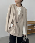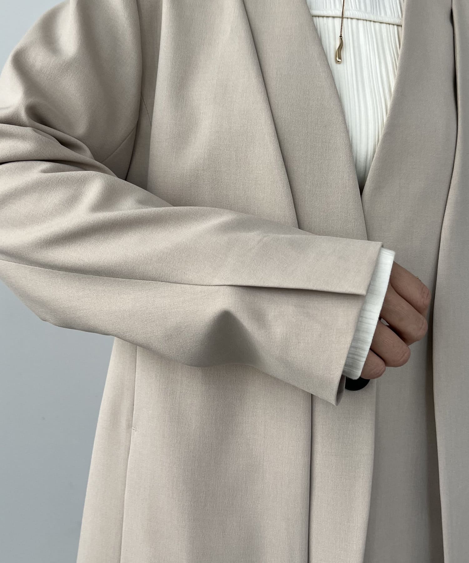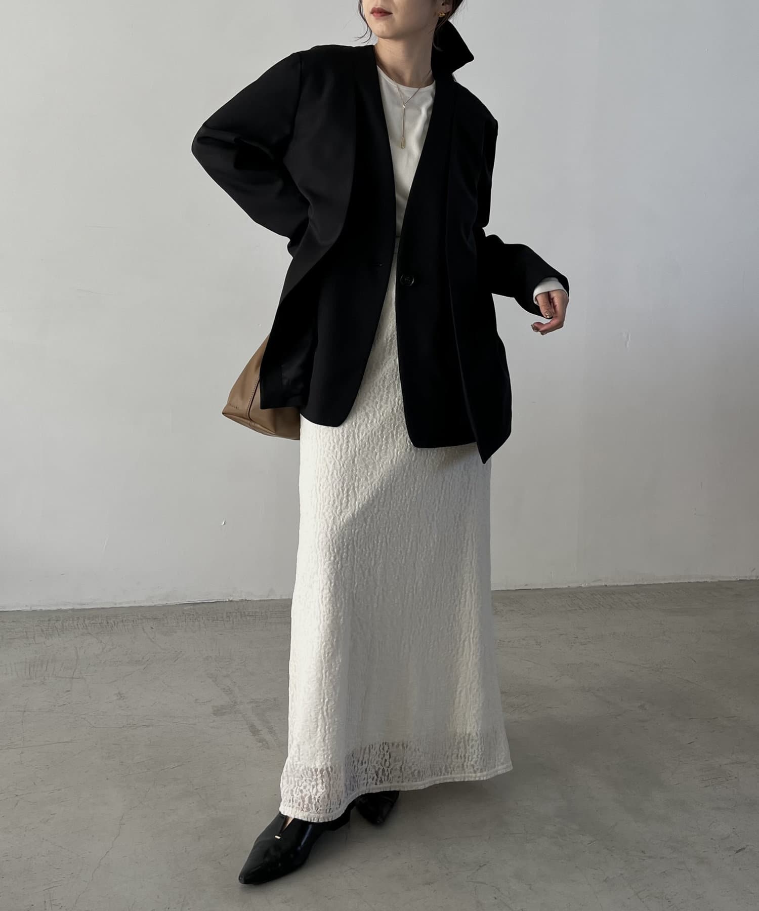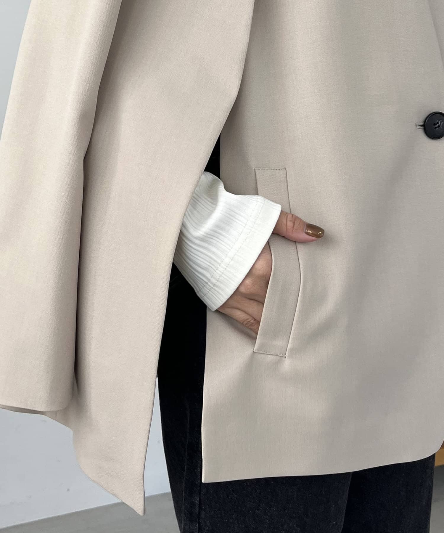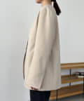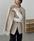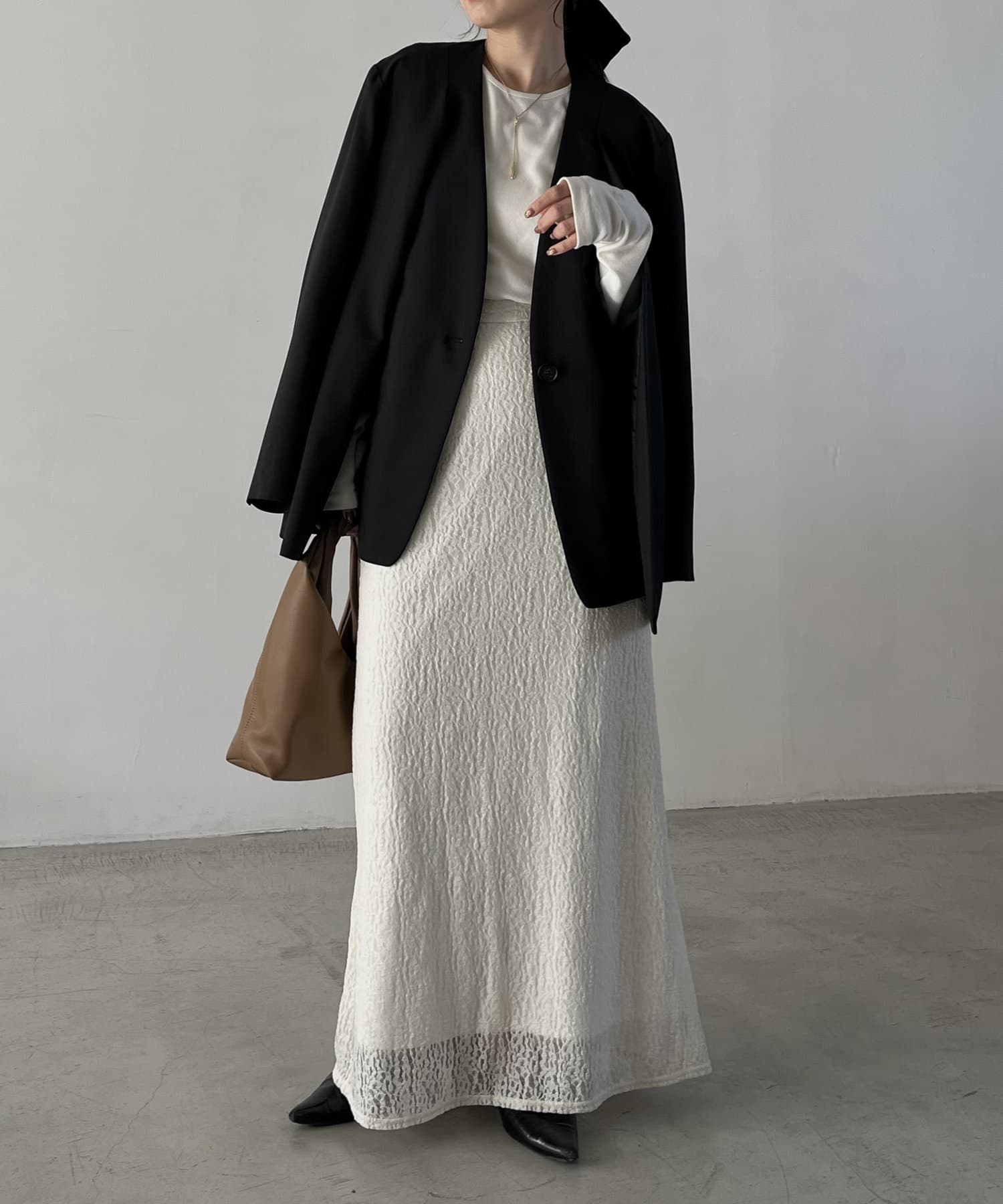 ・ジレをセットしたように見えるノーカラージャケットは、ベーシックで年代を問わず着られる