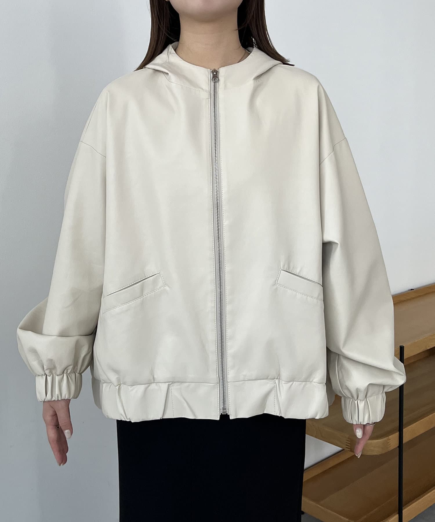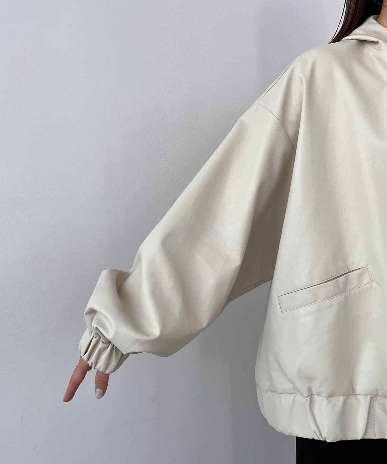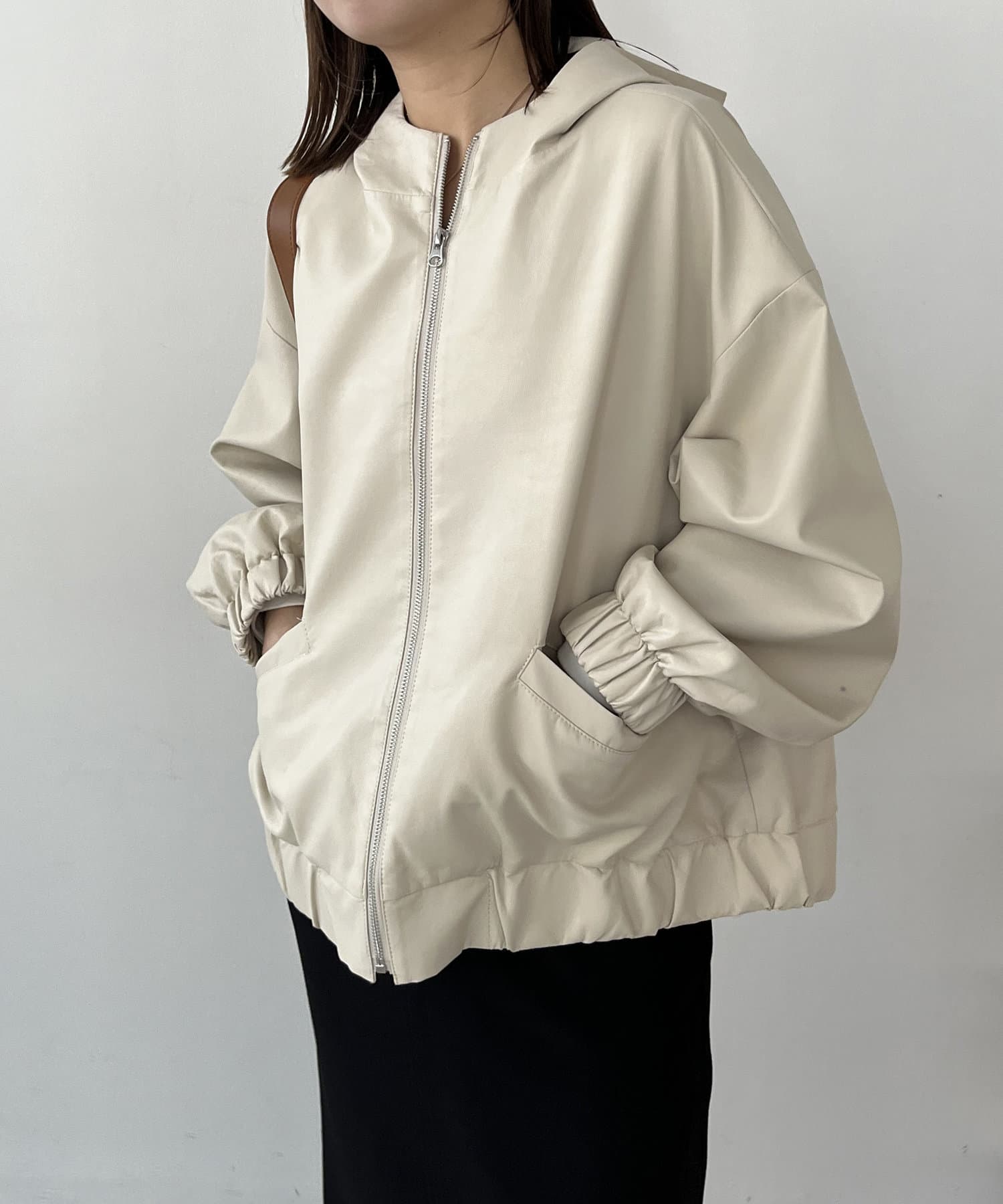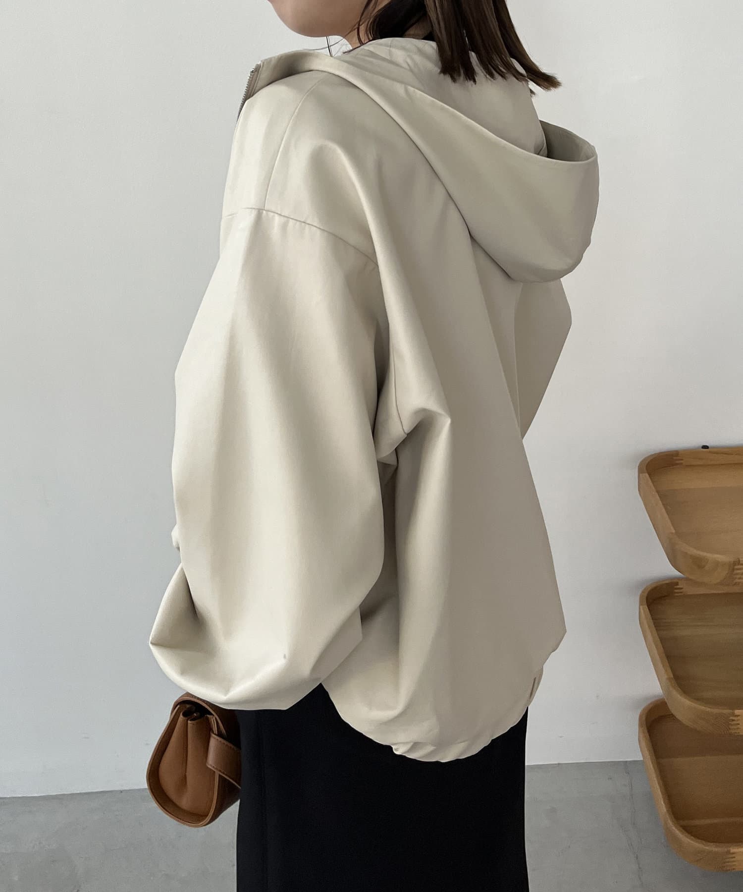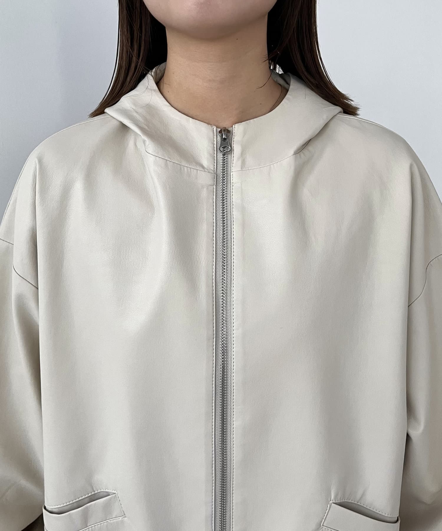 ・ラムレザーのような柔らかな質感の合皮を使用したフードジャケット