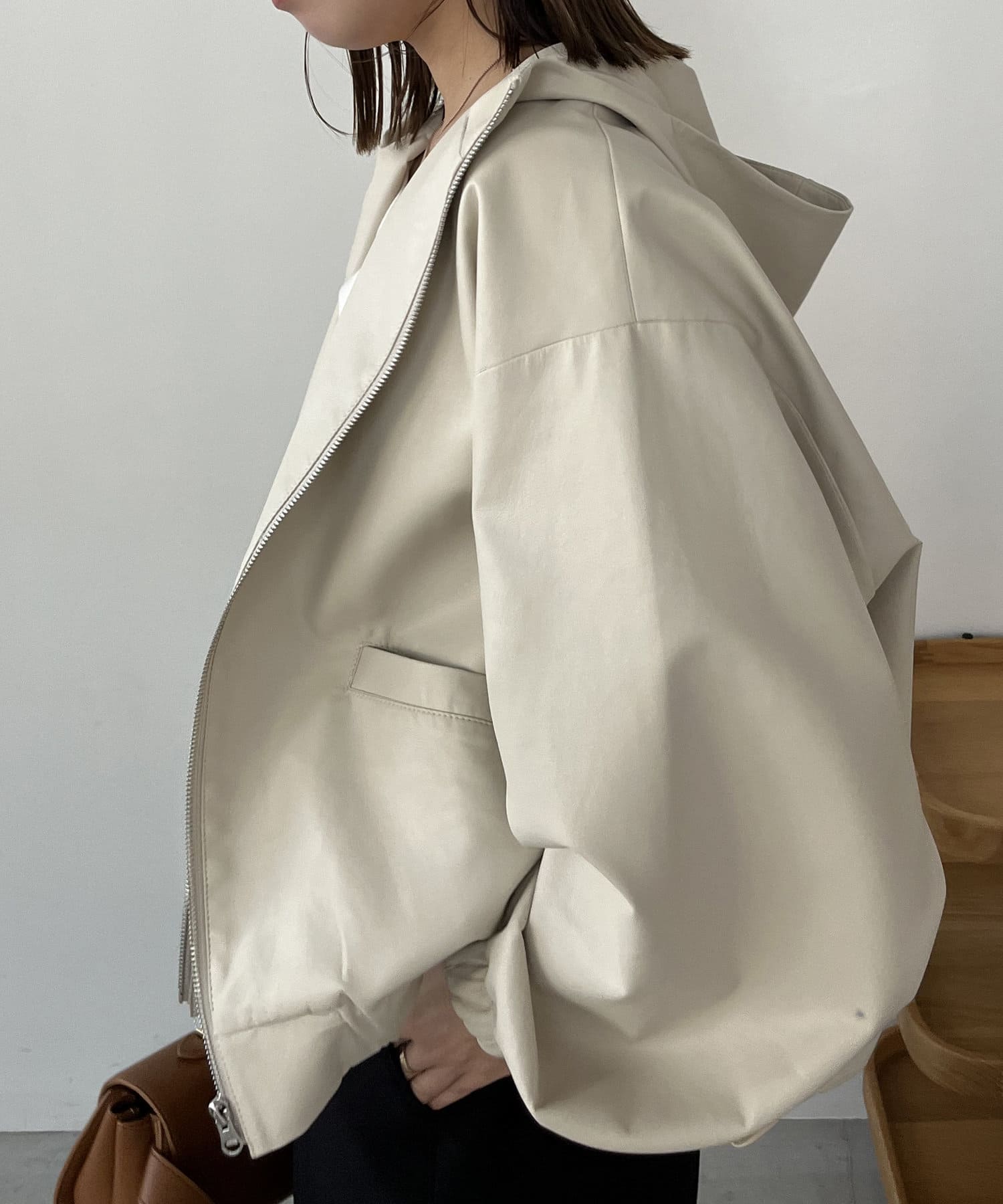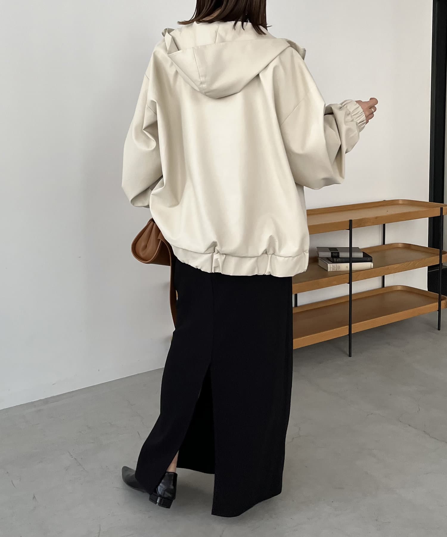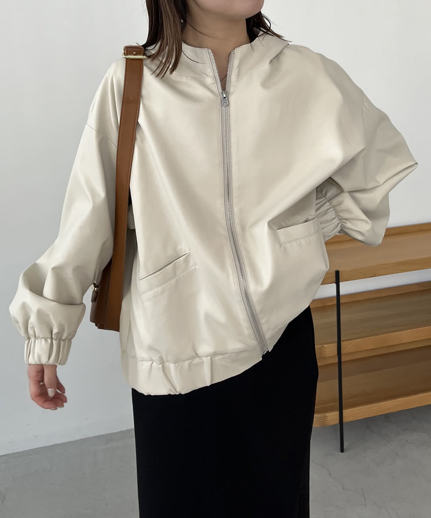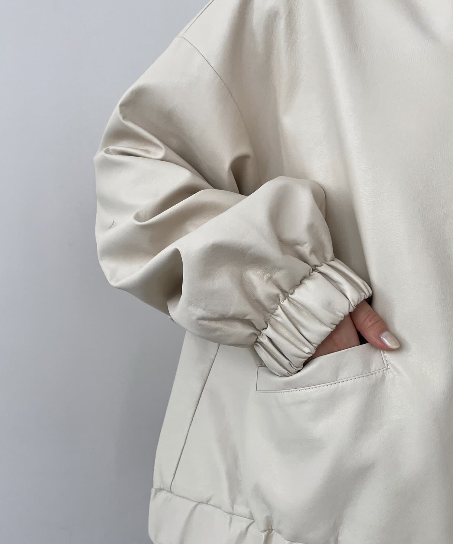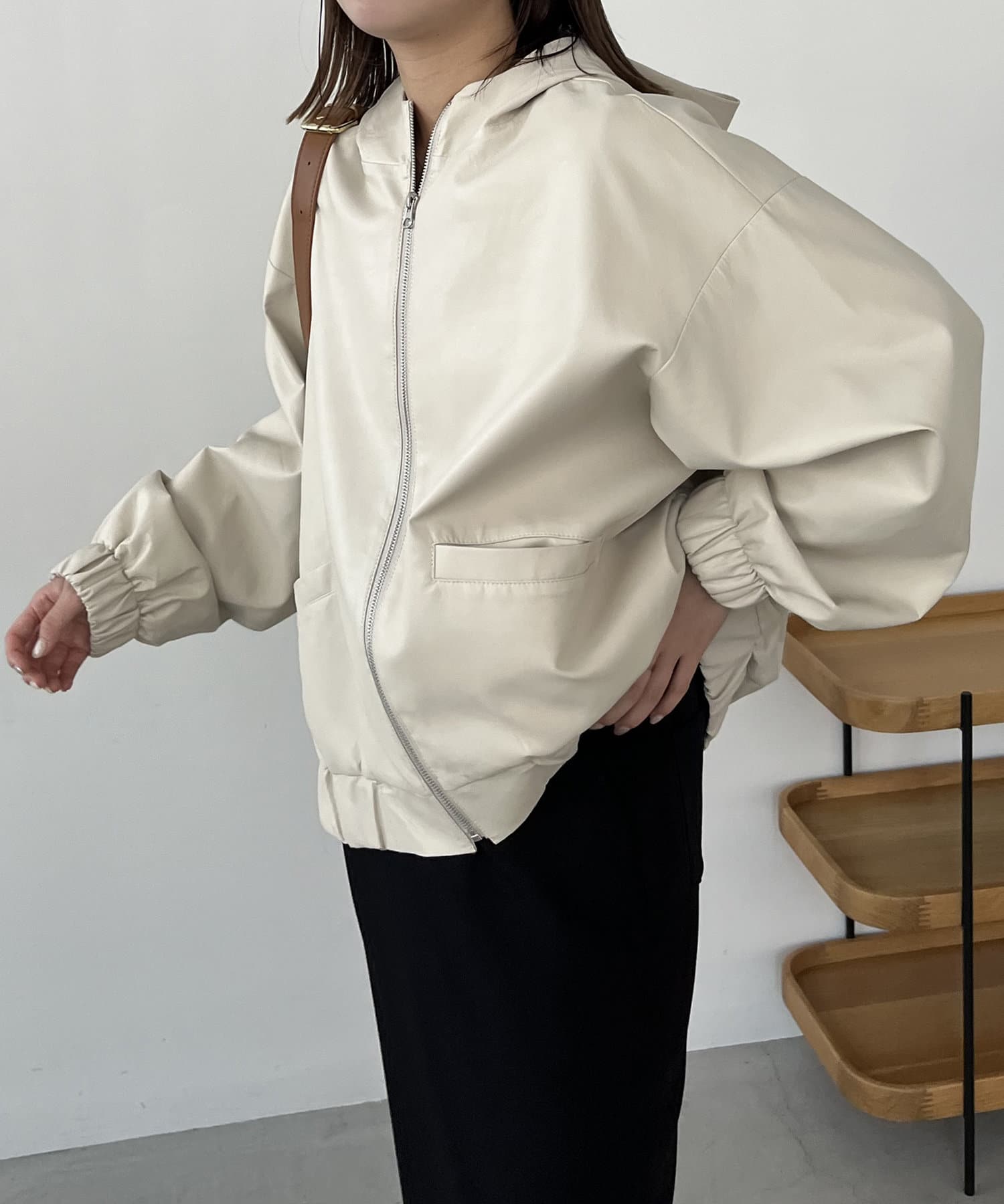 ・ラムレザーのような柔らかな質感の合皮を使用したフードジャケット