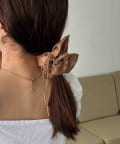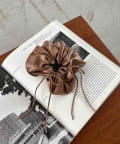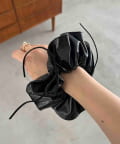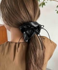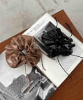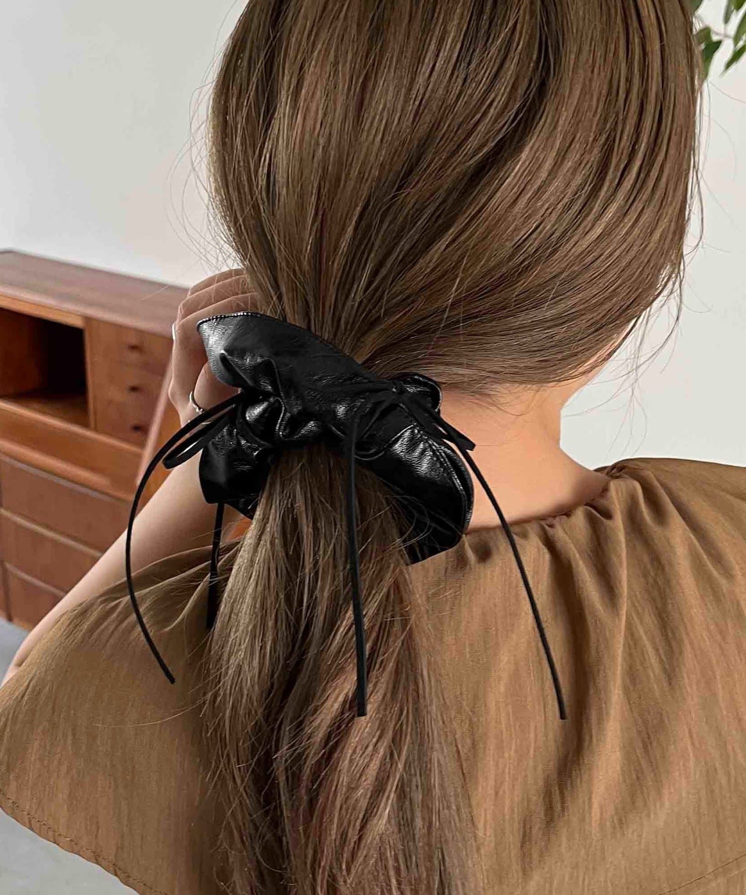 レザー調のボリューミーなシュシュに、華奢なリボンを組み合わせたデザイン。