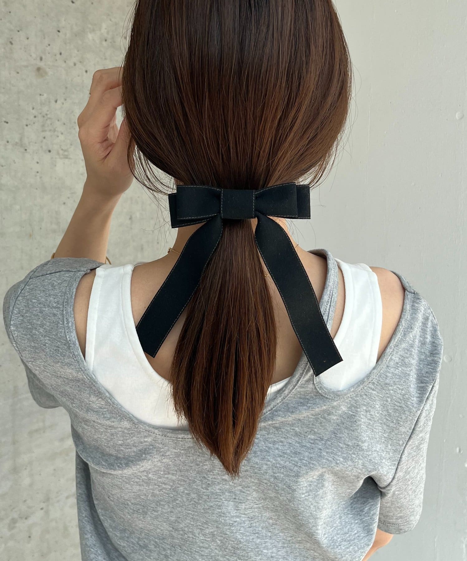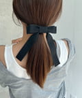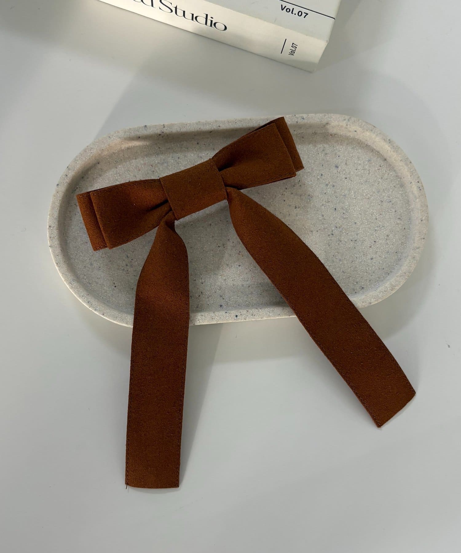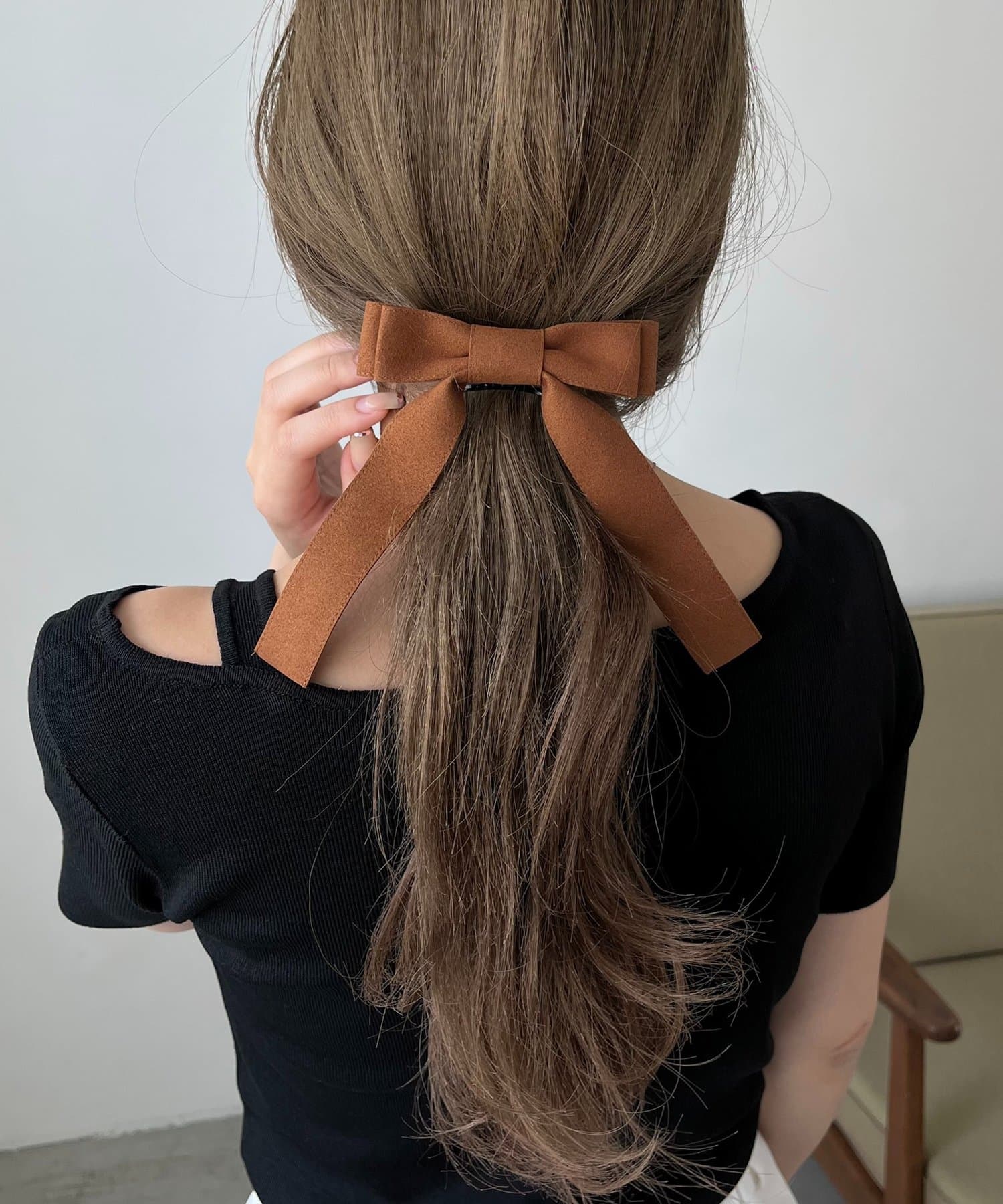スエード調のリボンをバレッタに仕上げた、シンプルながらも目を惹くデザイン。