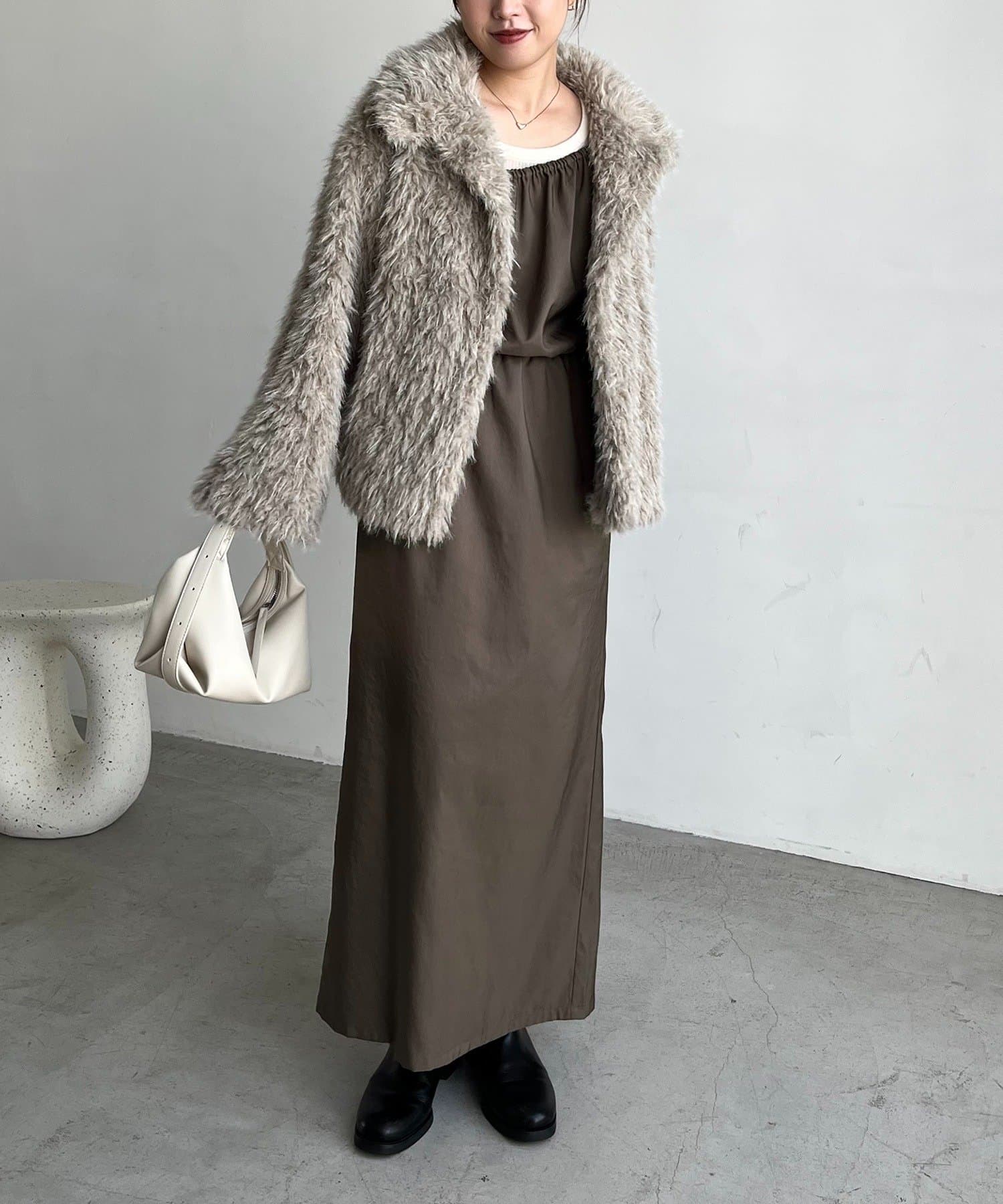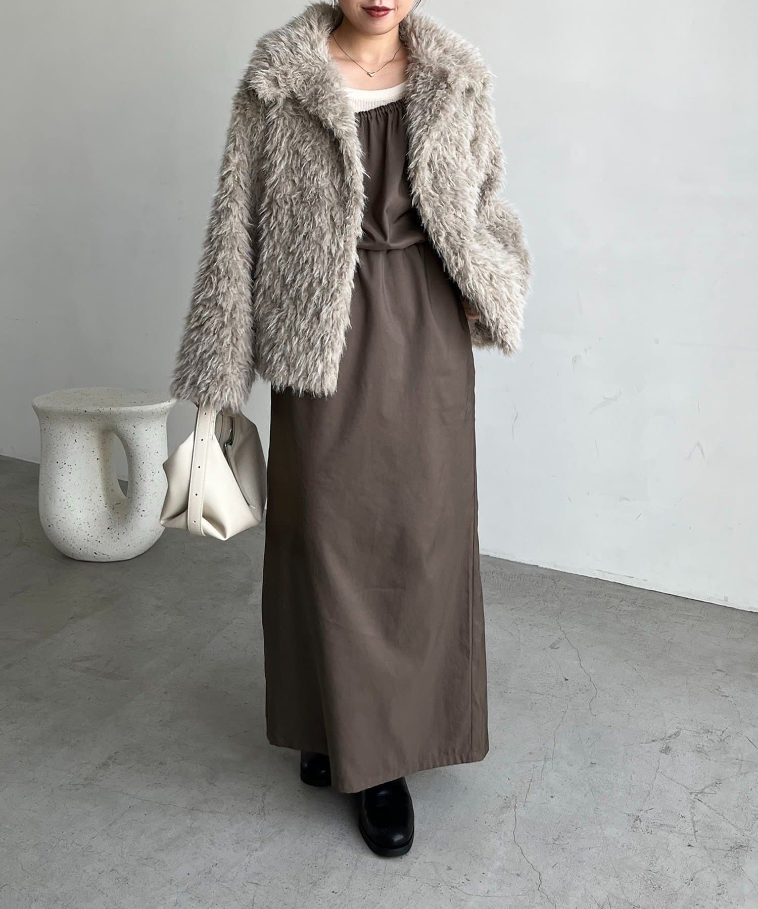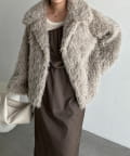 【モカ着用アイテム】インナー:〈C.L〉カシミアウールフレアスリーブニット、アウター:MIXファースタンドカラー
