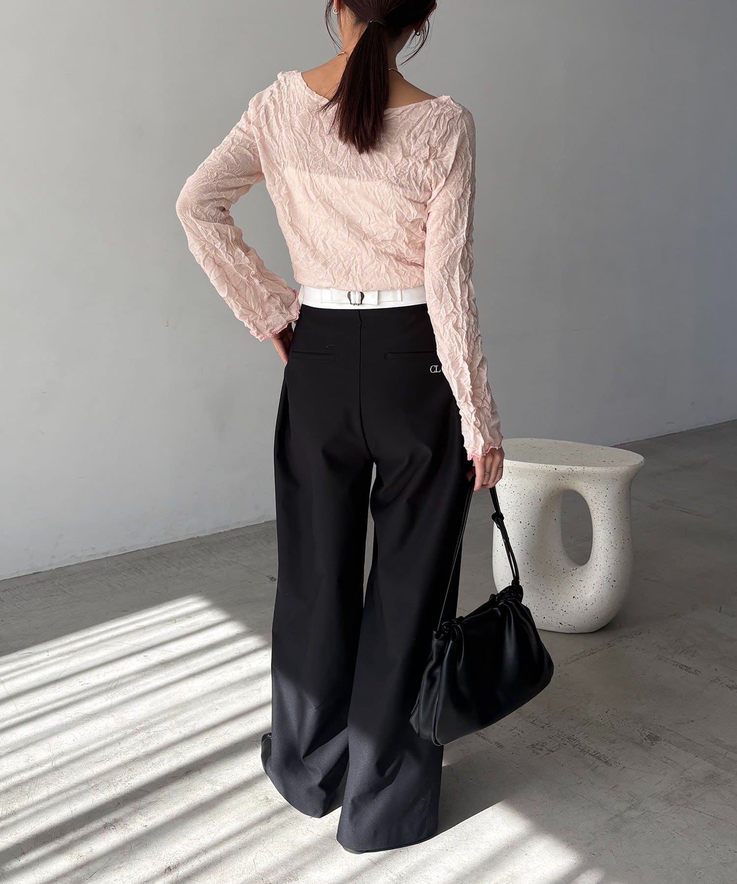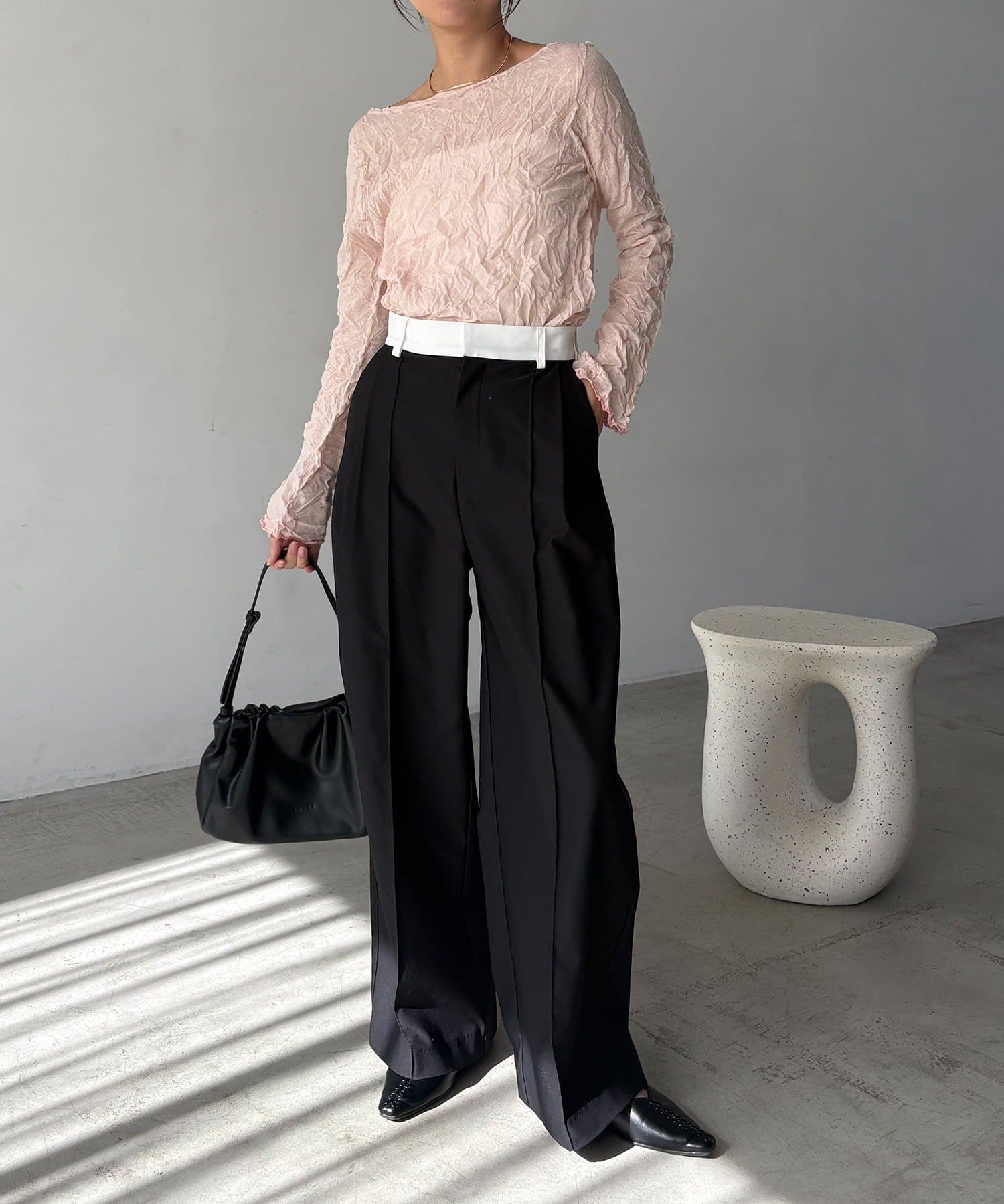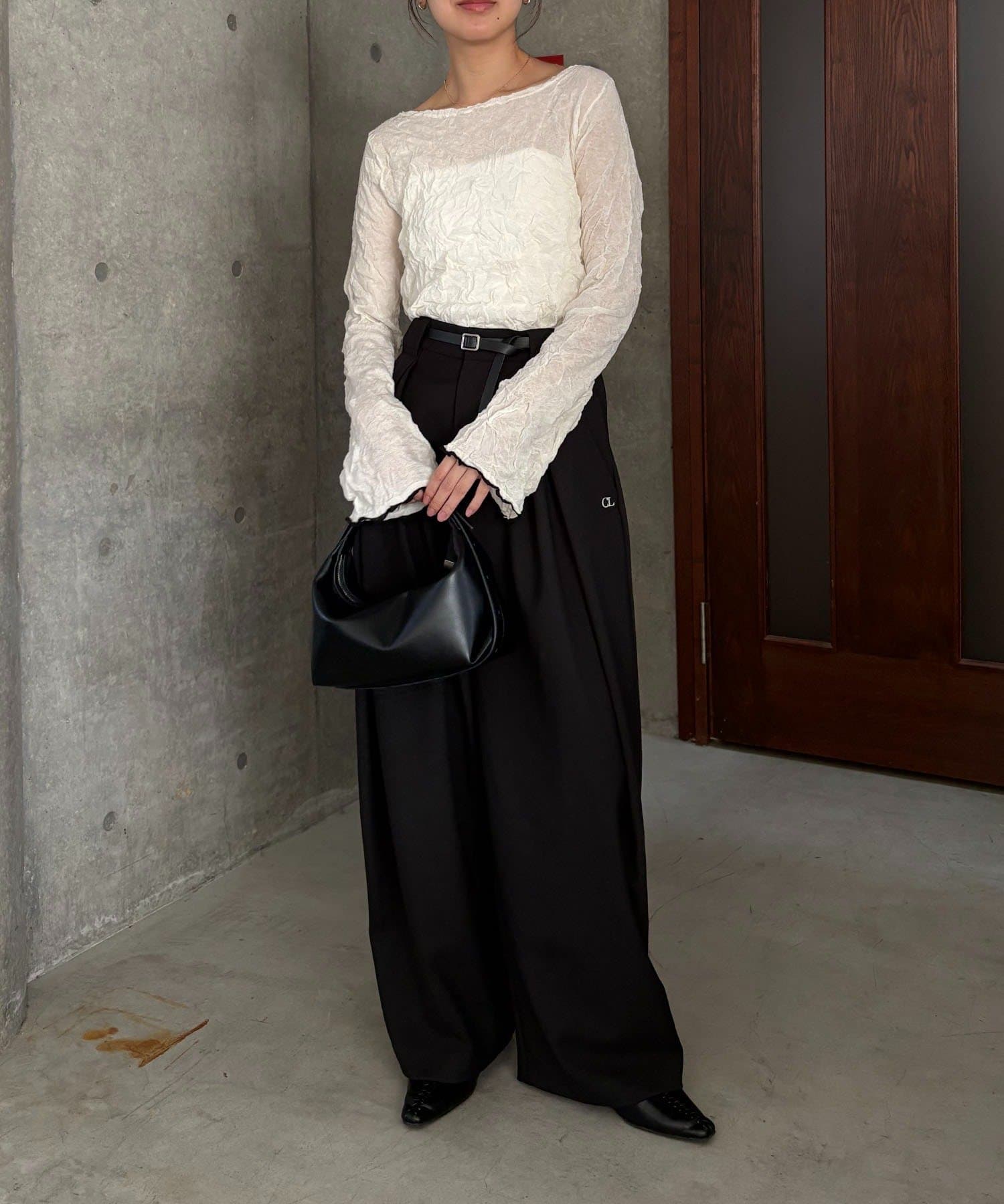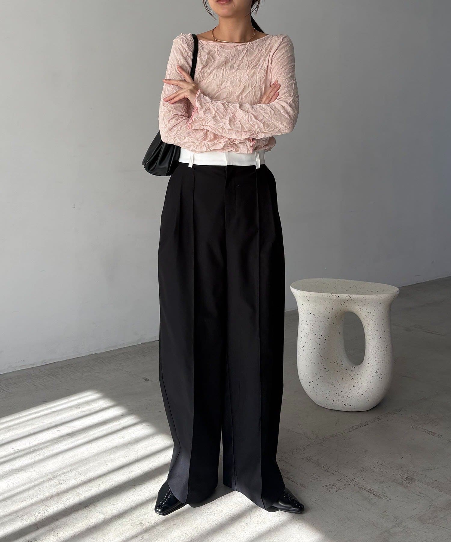 【エクリュ着用アイテム①②】レザーベルト付変形タックパンツ
