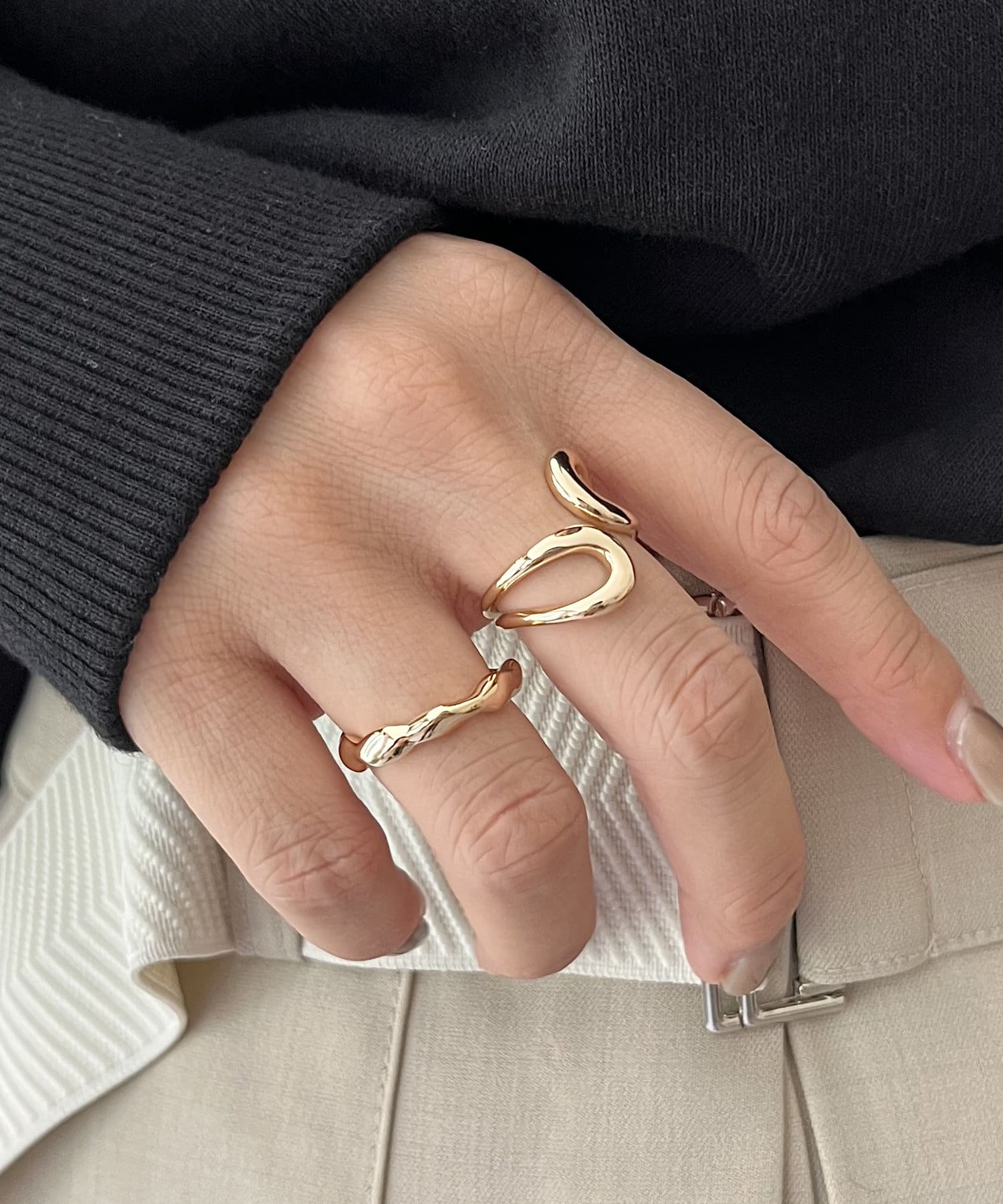 描いたようなラインデザインのリングと、