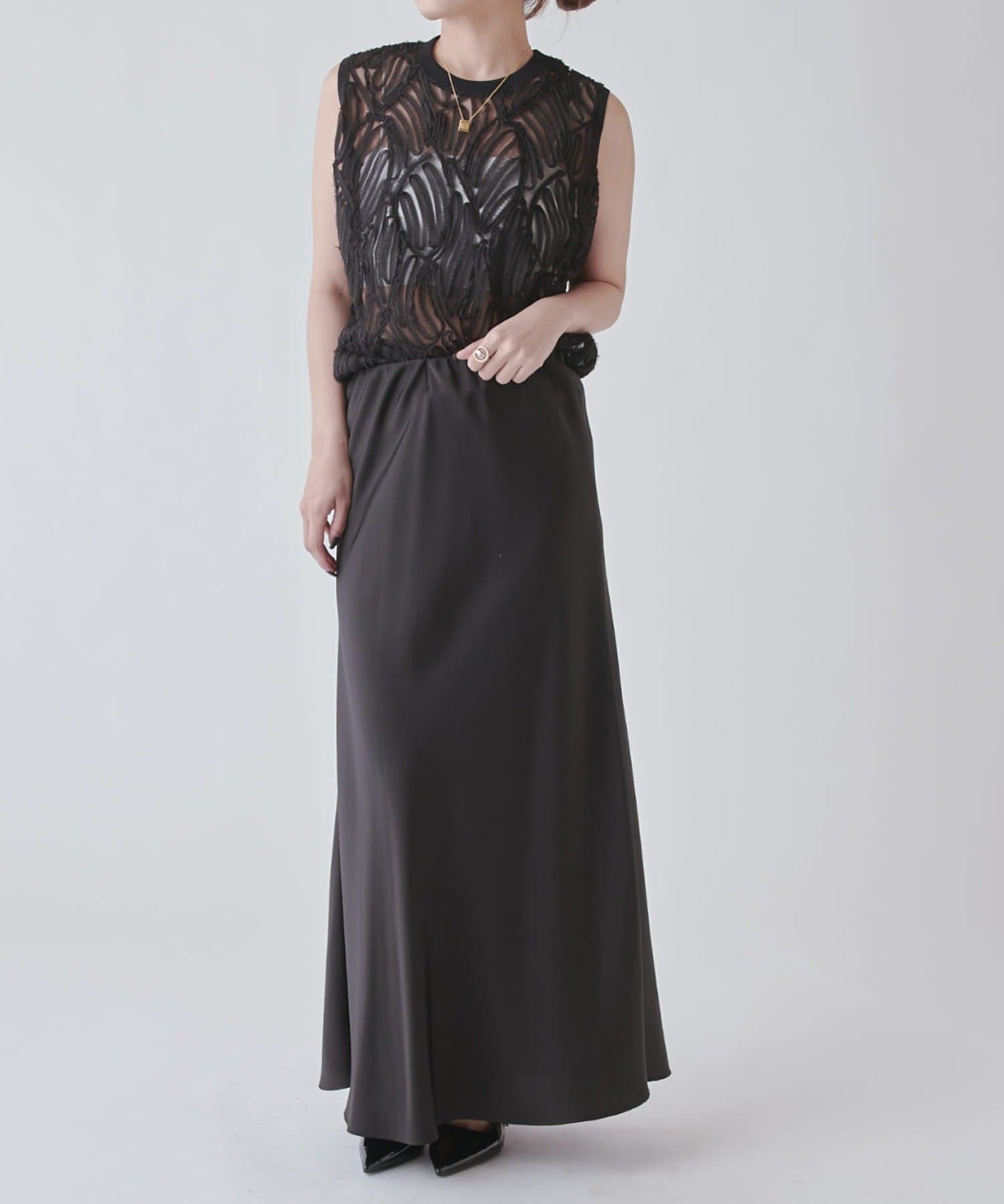 レース部分が広めのデザインですが、肌感が出すぎず大人な肌見せで着れます。