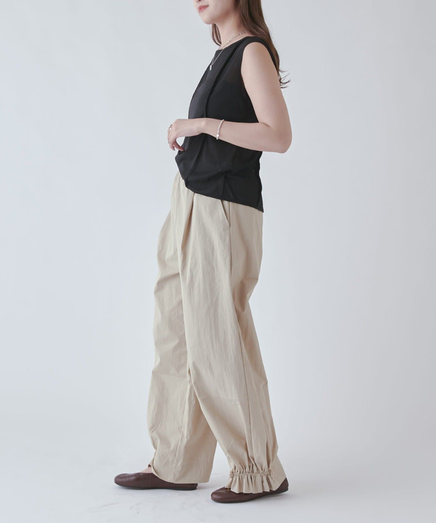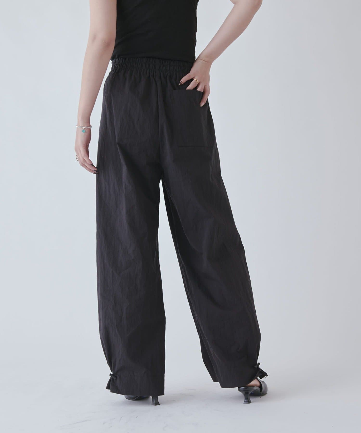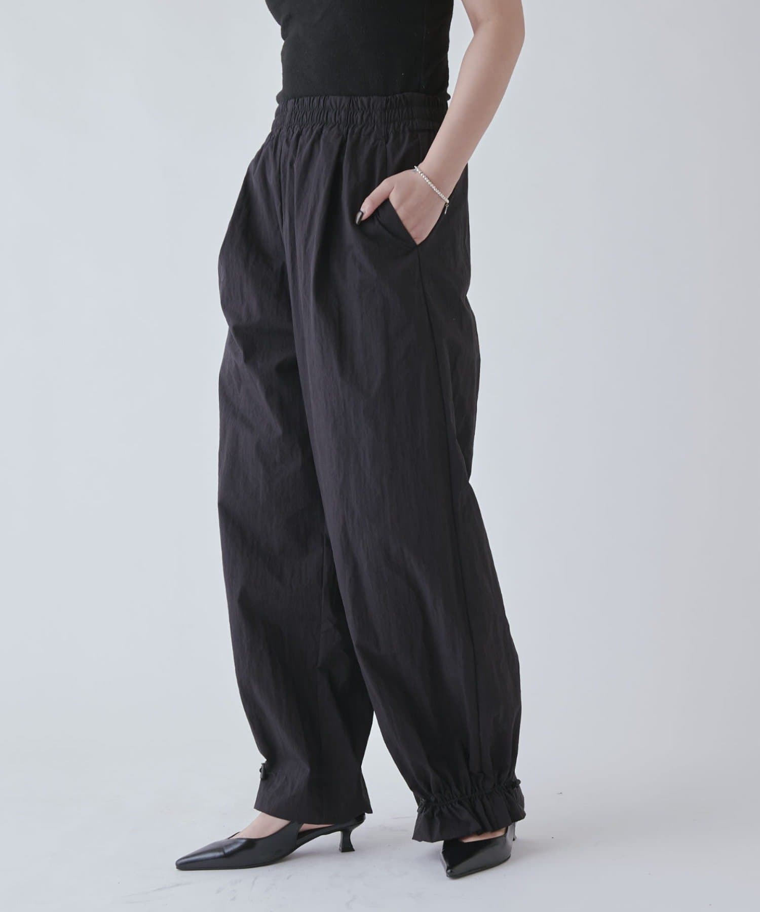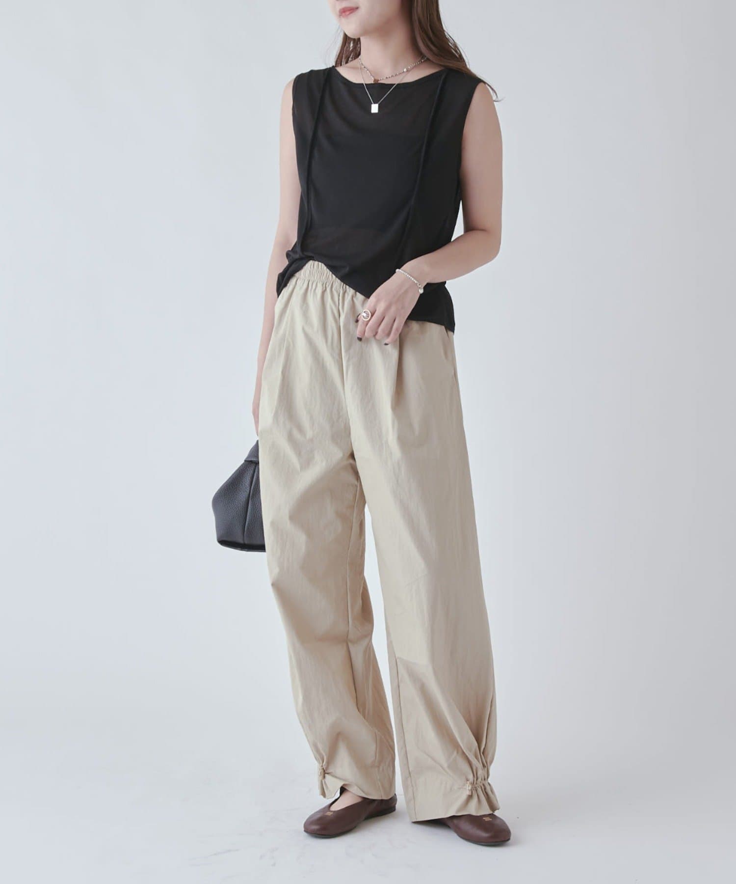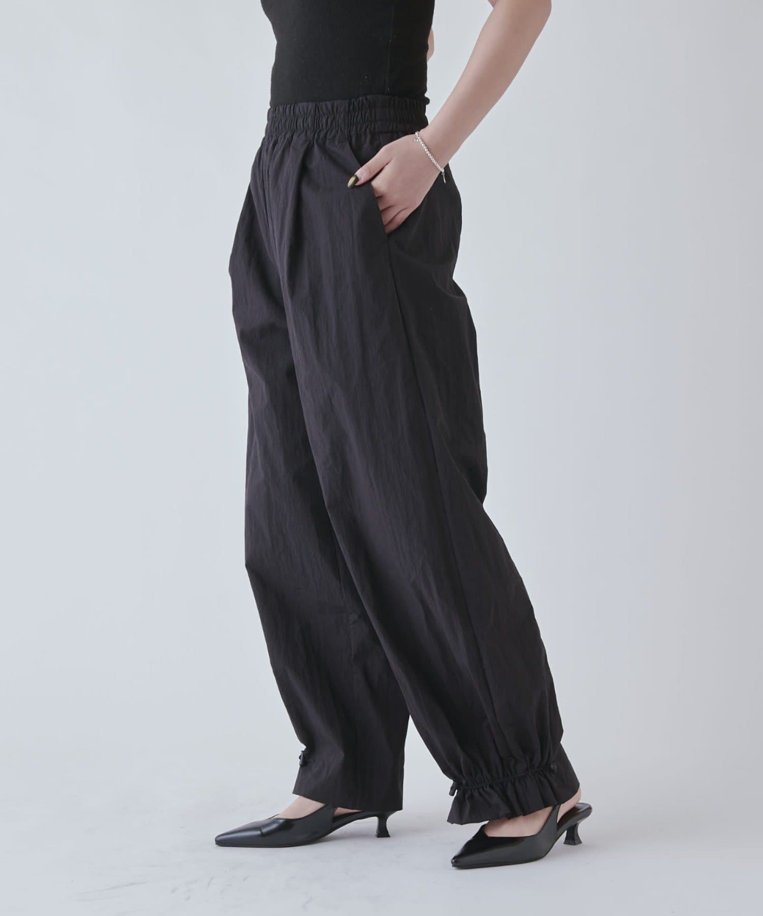 足首にはドローコードがついていて、少し絞ると全体のシルエットが変わり雰囲気も変わります。